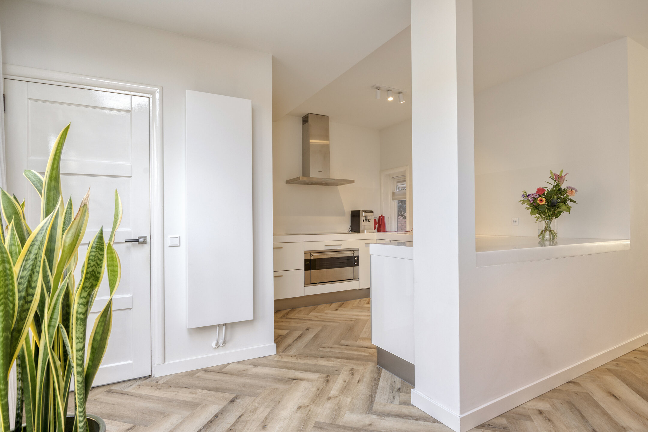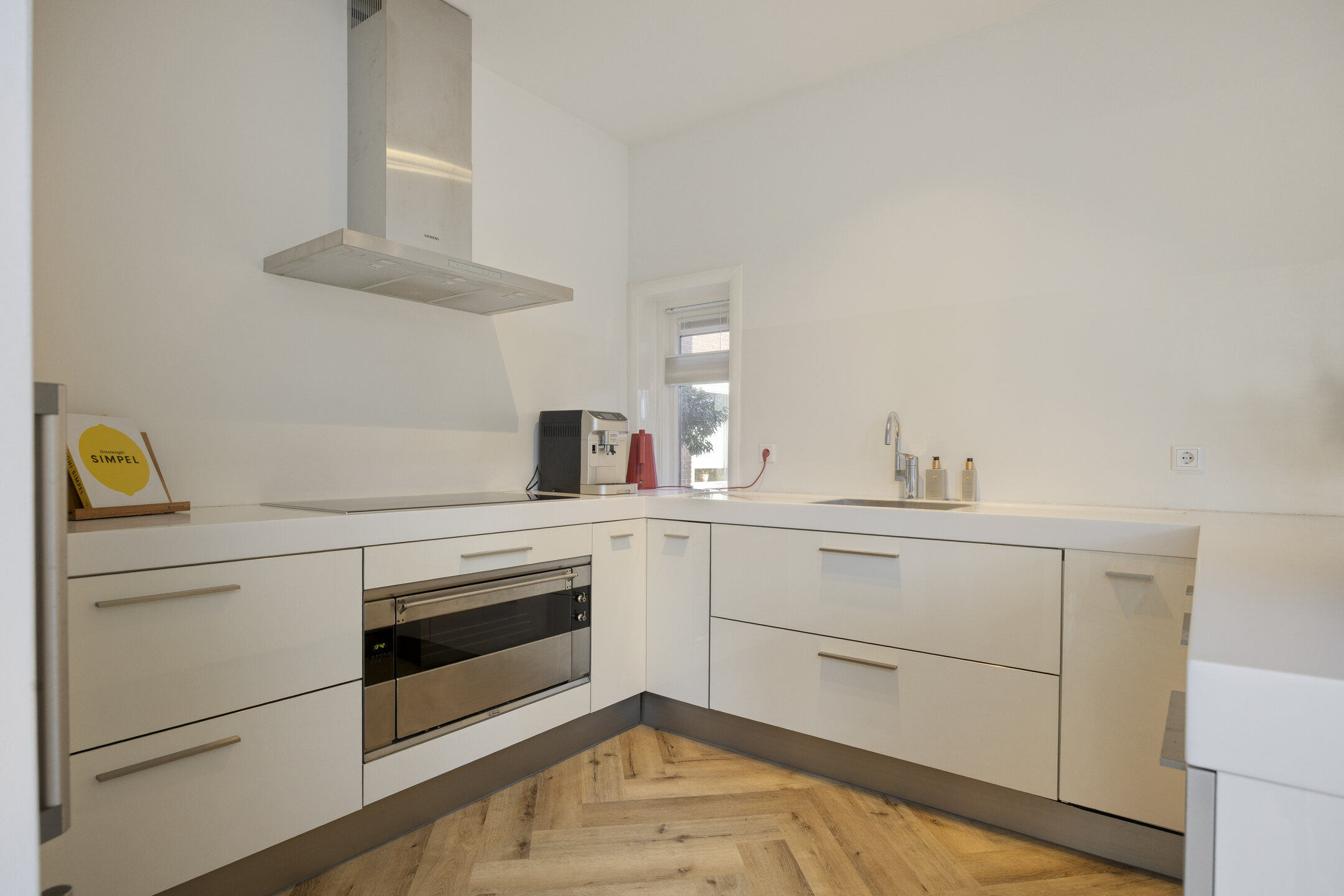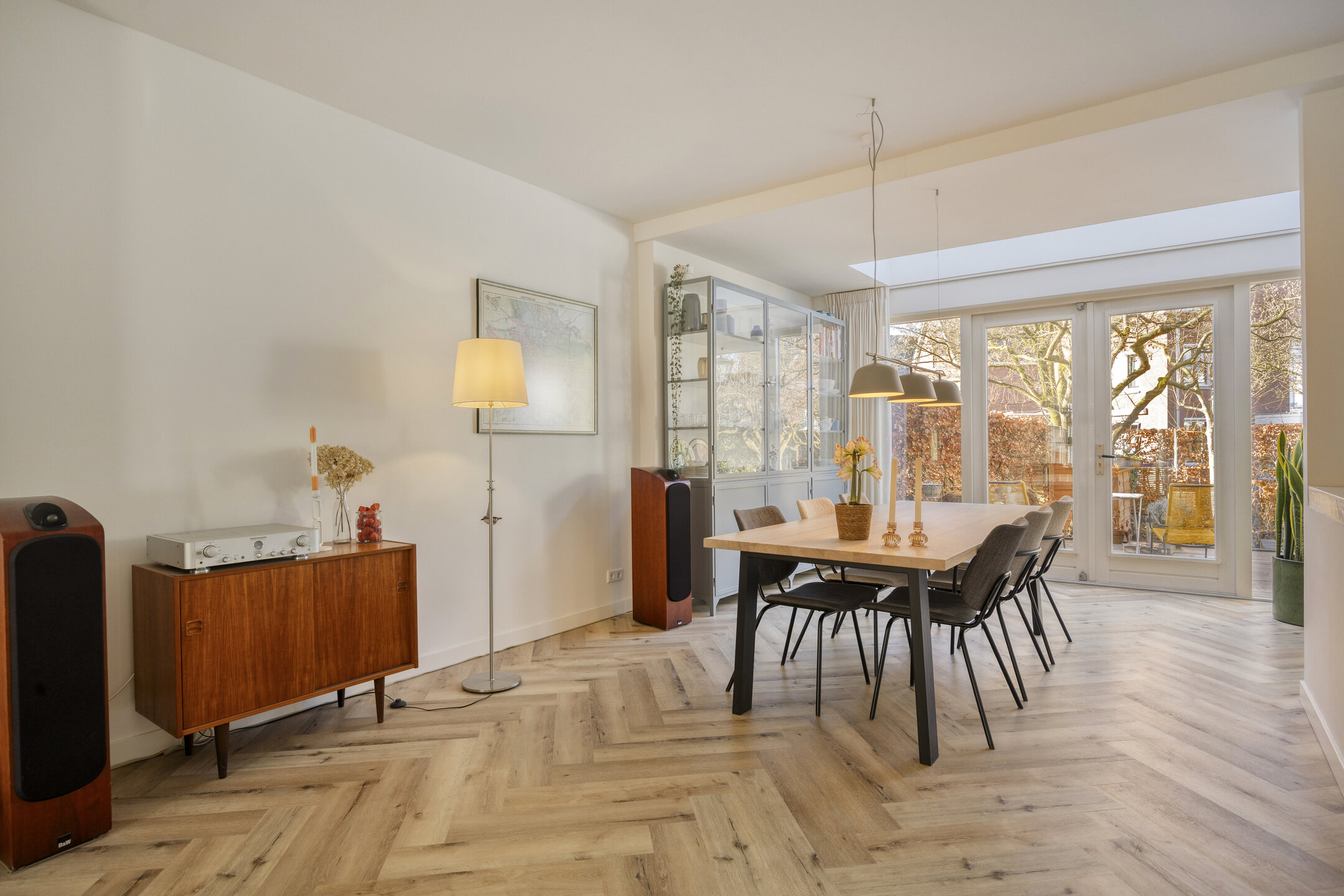 Begane grond Entree, hal met authentieke granitovloer, toegang tot de kelder, trapopgang en modern toilet met wandcloset en fonteintje. De sfeervolle woonkamer is afgewerkt met een pvc-visgraatvloer, heeft aan de voorzijde een erker met houtkachel en aan de achterzijde openslaande tuindeuren en een lichtstraat bij de eetkamer in de uitbouw. De moderne witte keuken is uitgerust met inductiekookplaat, afzuigkap, oven, koel-vriescombinatie, vaatwasser en close-in boiler. Aangebouwde berging met dakramen, tuindeur en toegang tot het pad aan de voorzijde. Bijkeuken met wasmachineaansluiting en keukenblok met spoelbak.