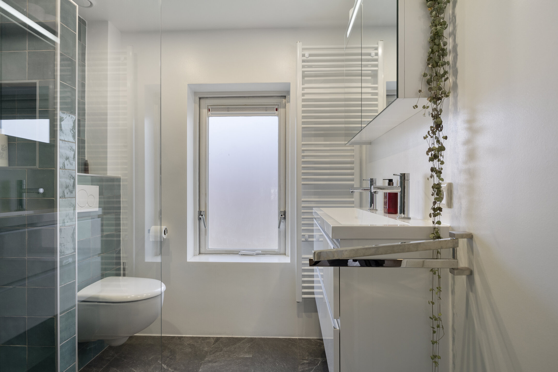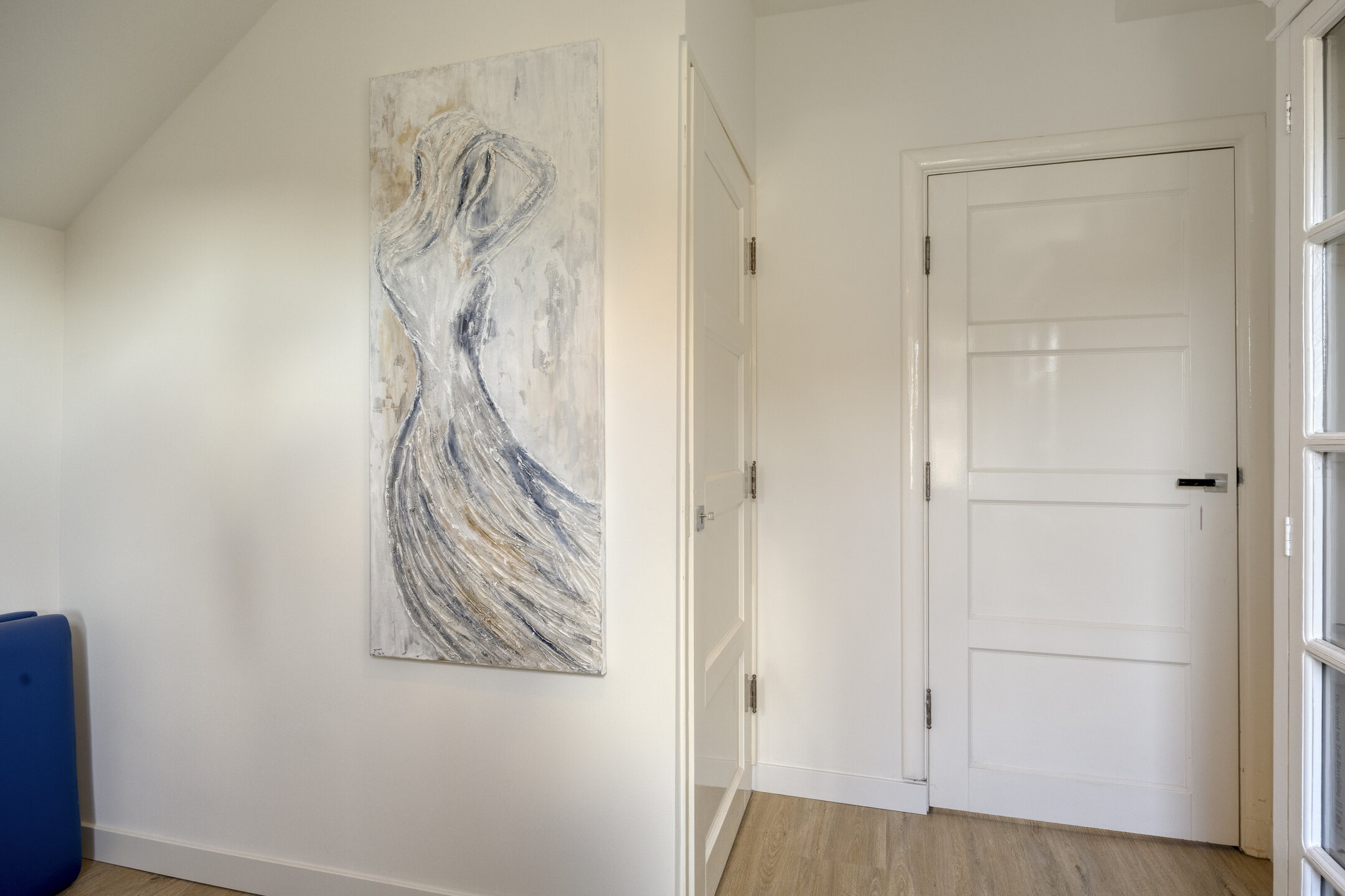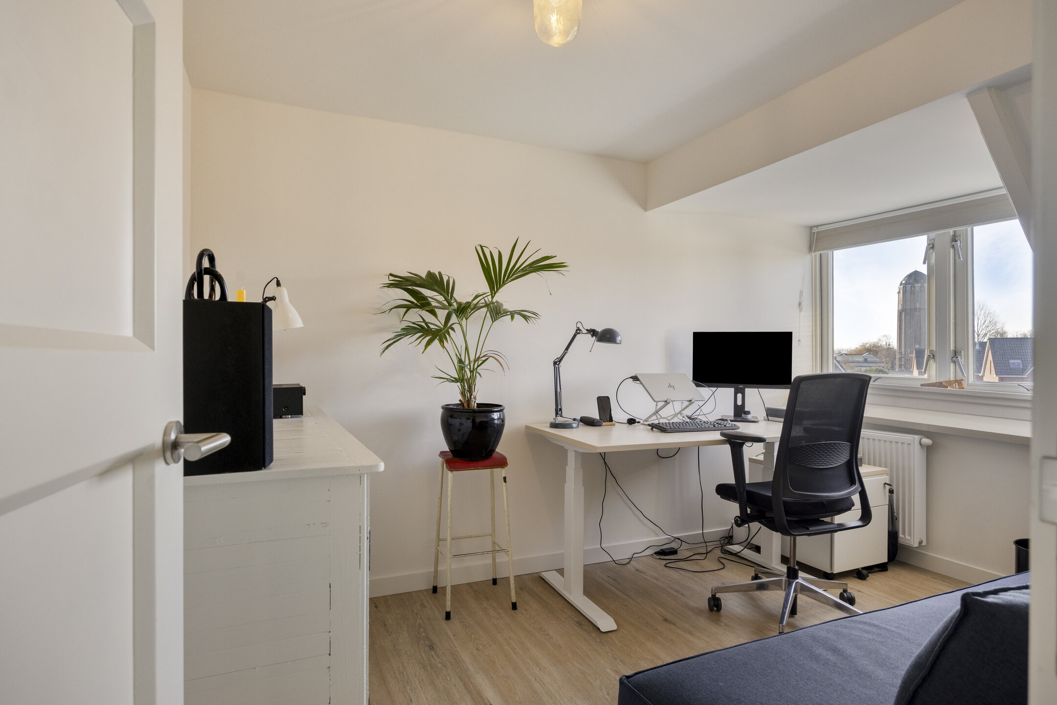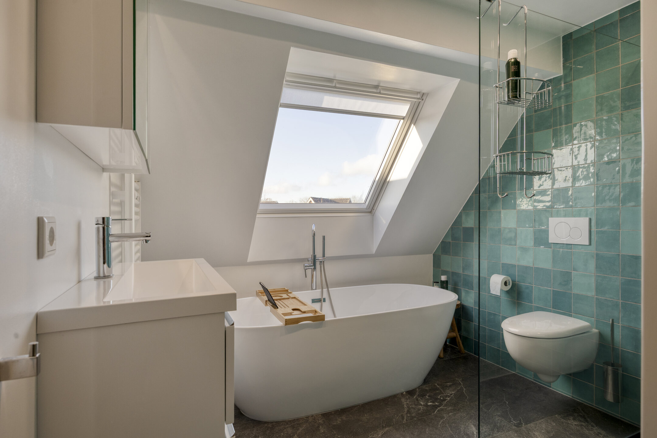 Tweede verdieping Ruime overloop in gebruik als werk-/hobbyruimte met vaste kasten en raam in de dakkapel. Slaapkamer van ca. 9 m², eveneens met dakkapel. Tweede luxe badkamer met wastafelmeubel, vrijstaand bad, wandcloset, inloopdouche, handdoekenradiator en een groot dakraam.