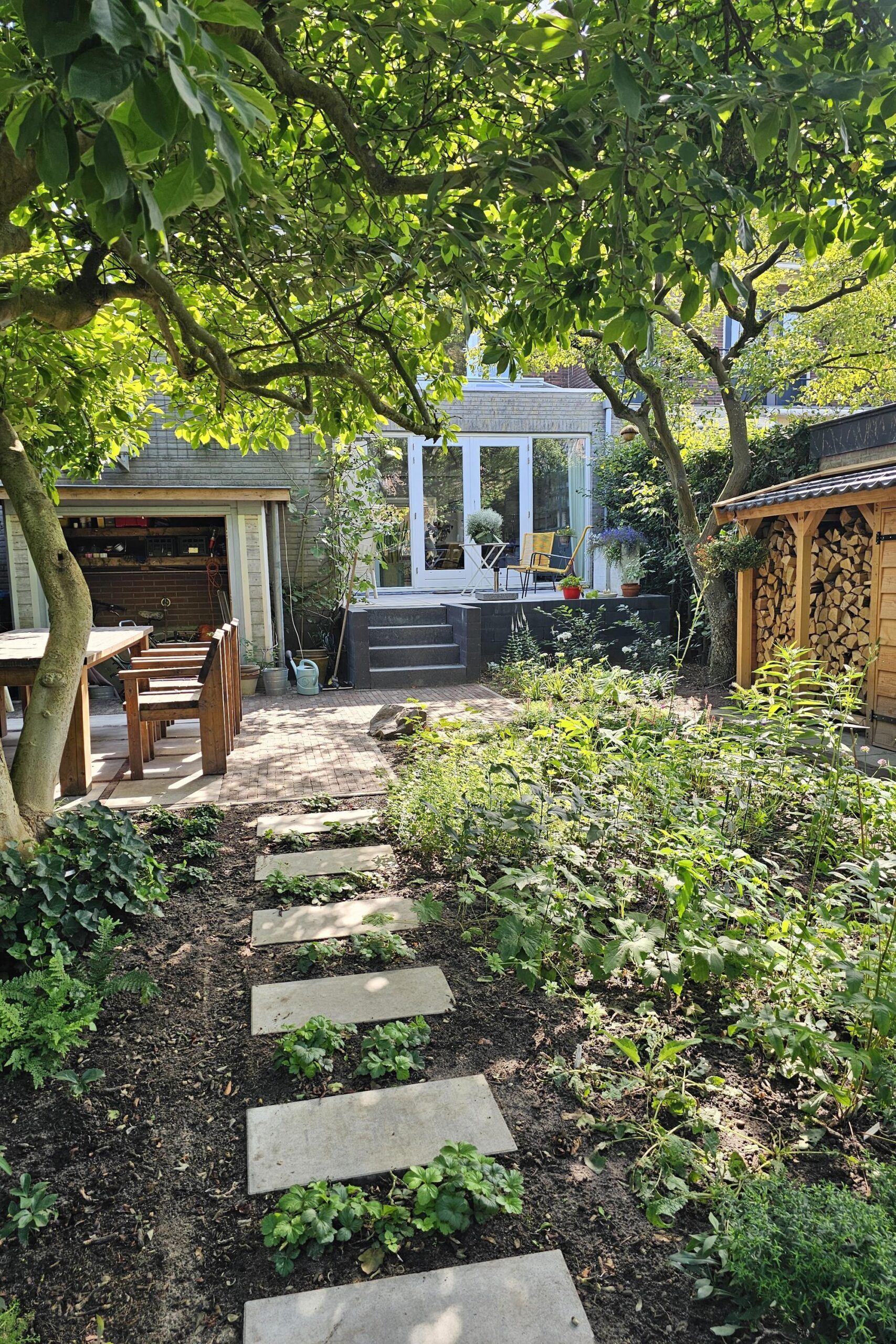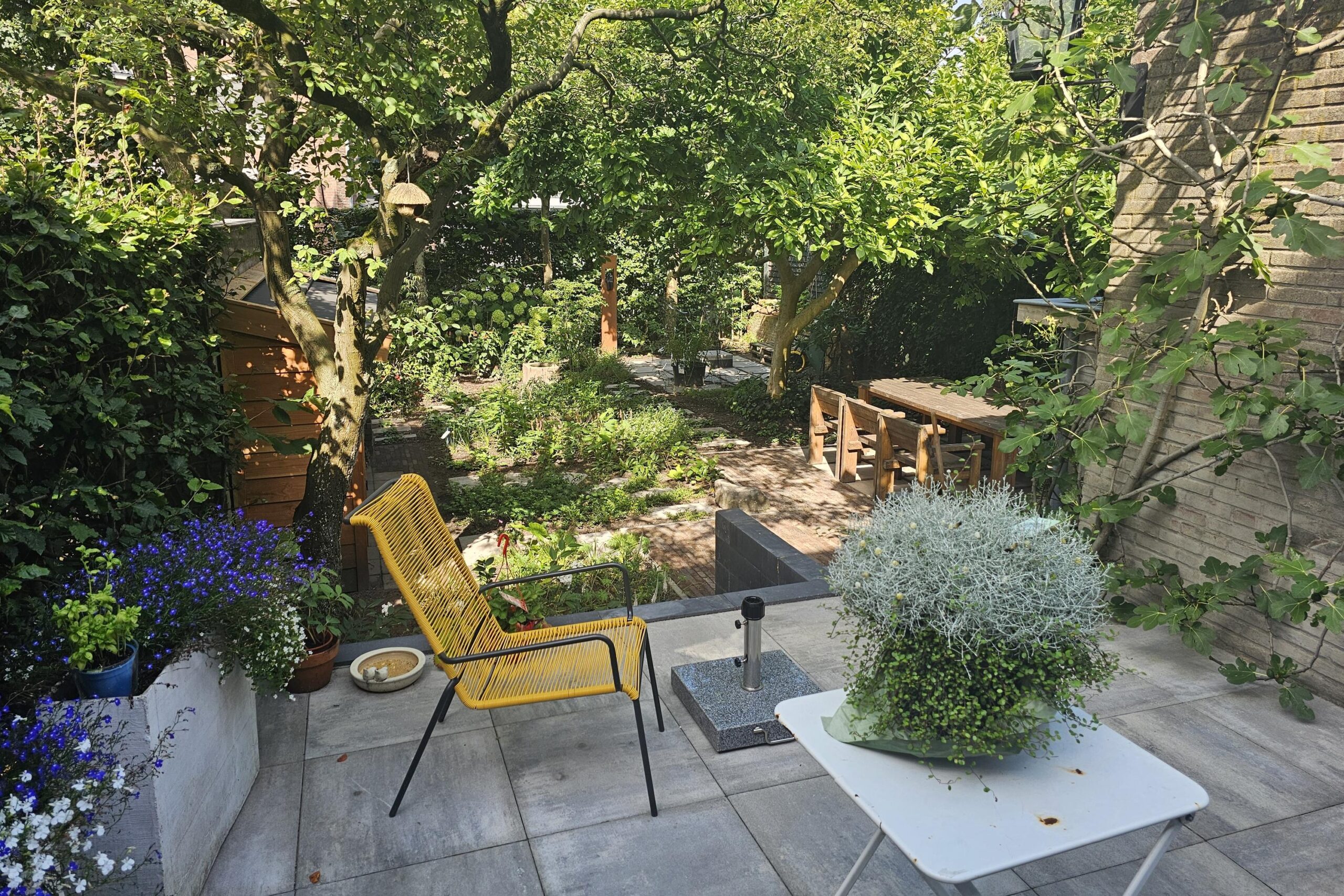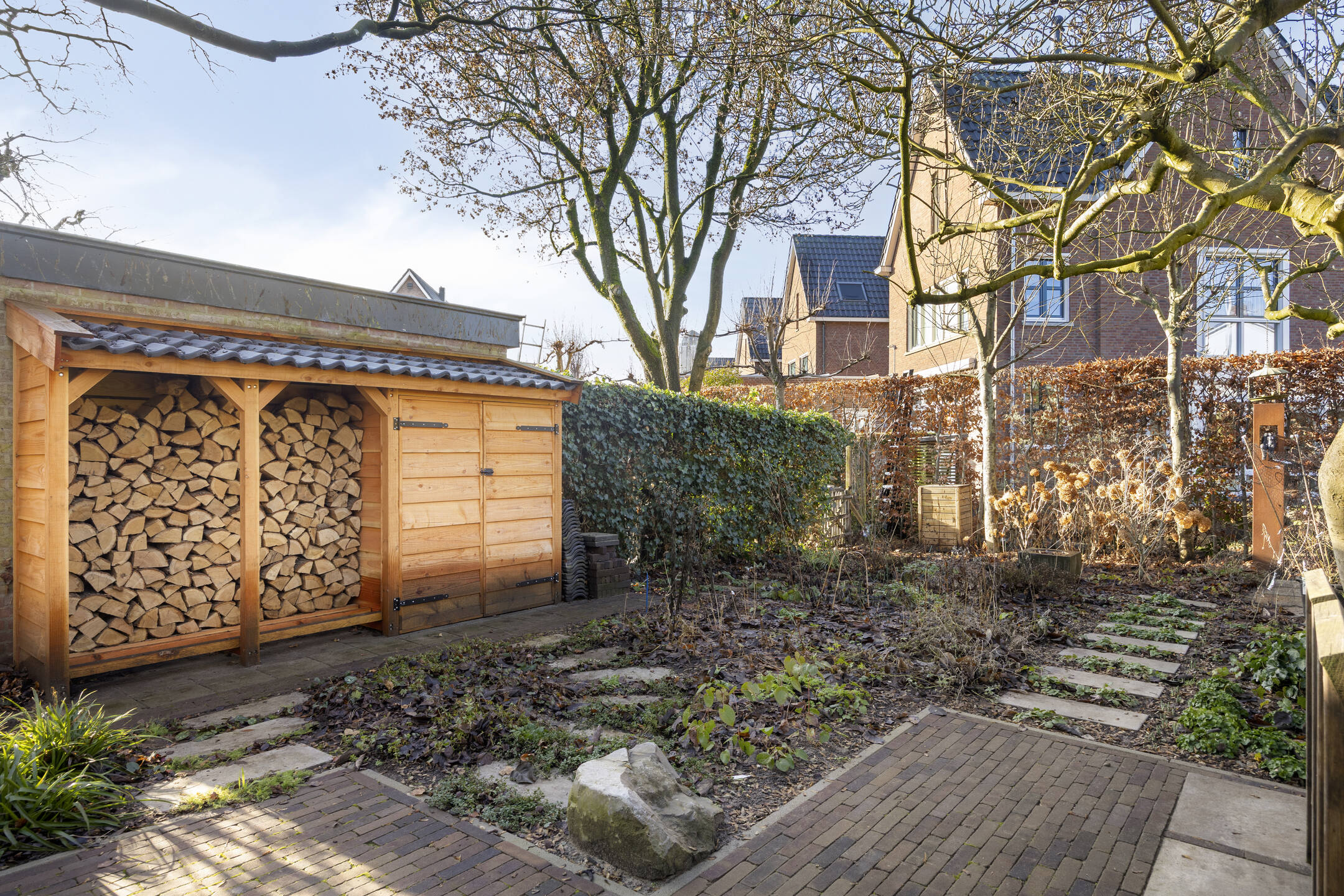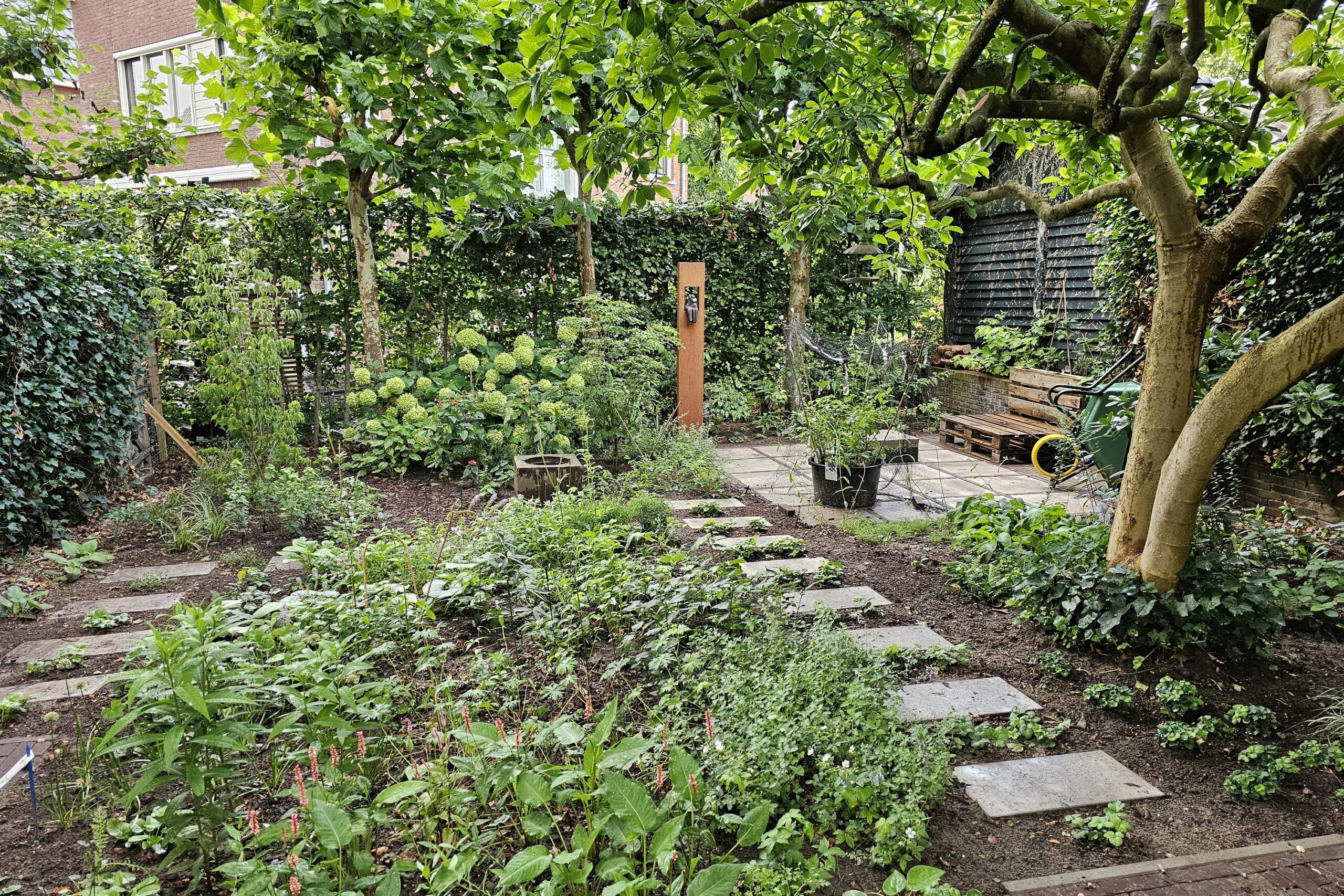 De voortuin en de zonnige achtertuin op het westen zijn in het voorjaar van 2025 volledig opnieuw aangelegd en beschikken over drie terrassen, sierbestrating, stepping stones door de borders en een houtopslag. Aan de voorzijde een looppad naar de entree en een groenstrook. Parkeren is mogelijk in de openbare parkeervakken in de straat.