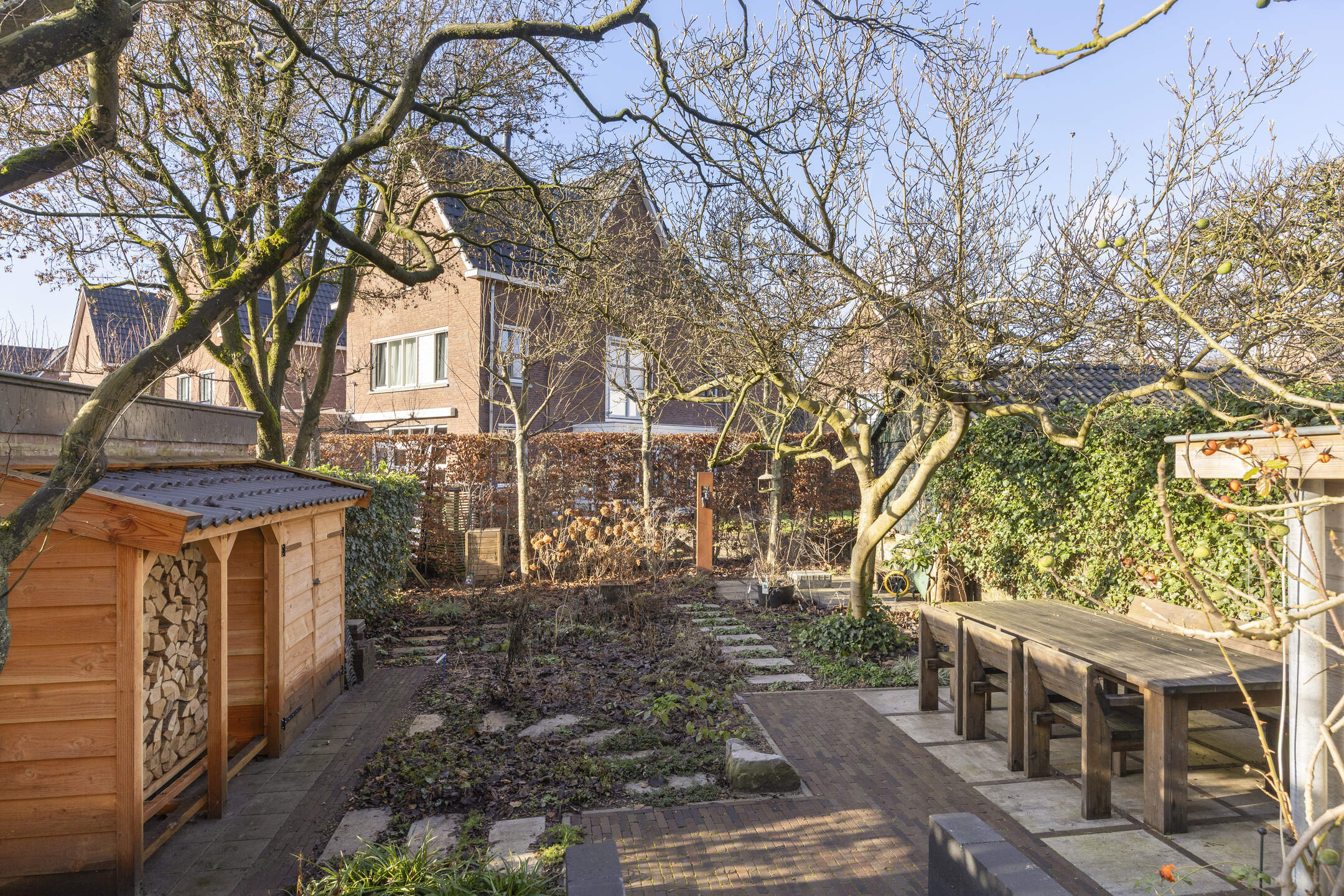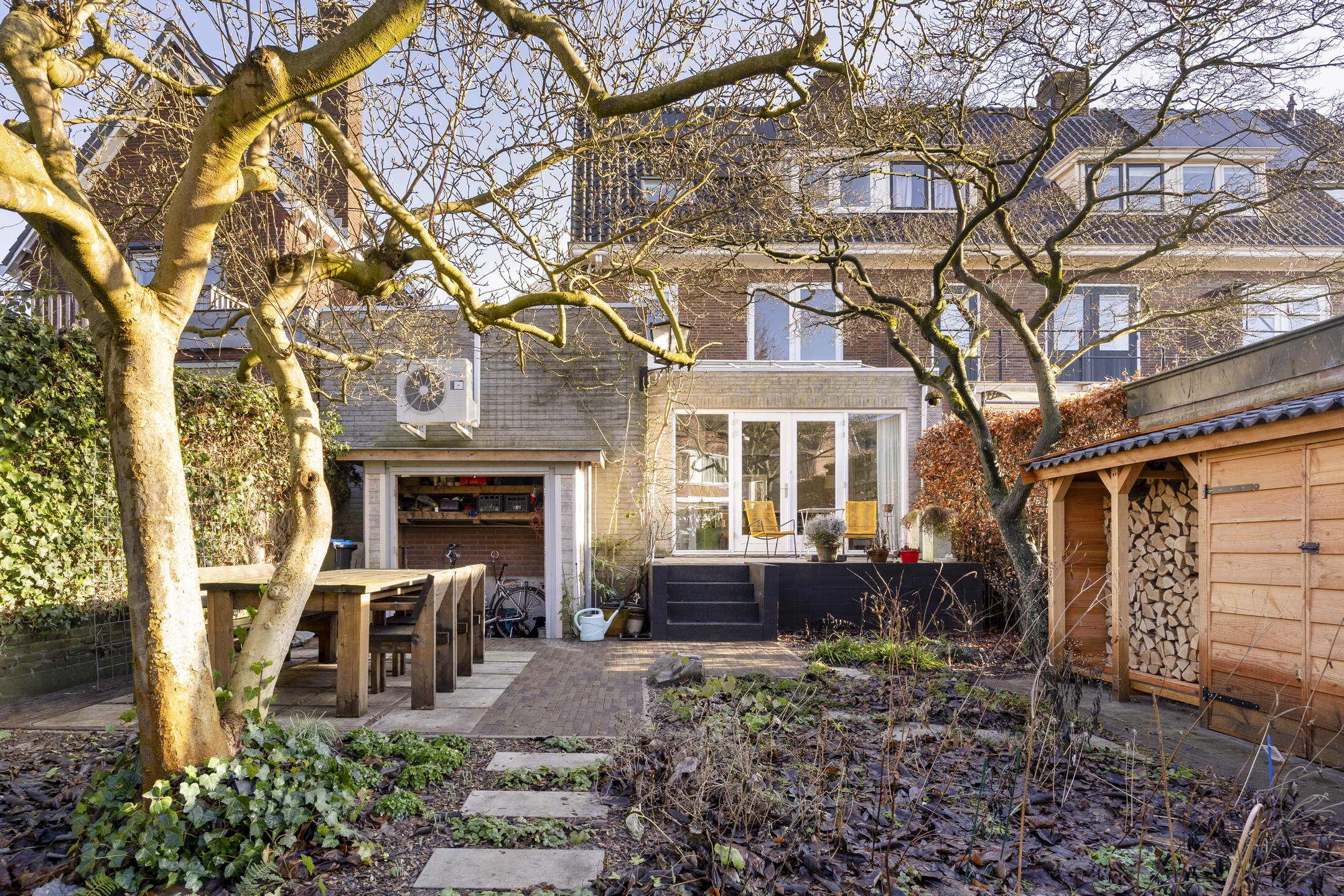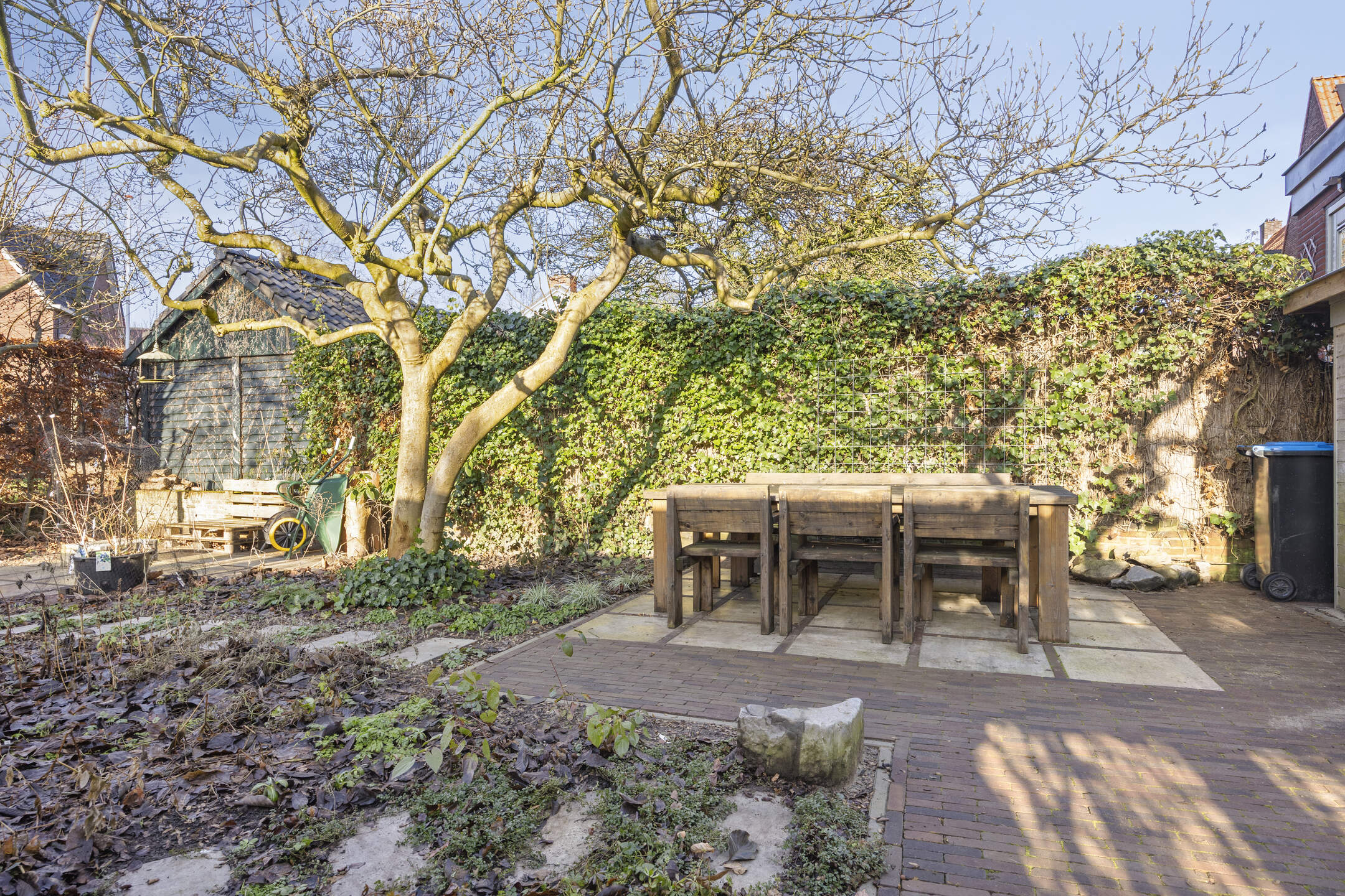 De voortuin en de zonnige achtertuin op het westen zijn in het voorjaar van 2025 volledig opnieuw aangelegd en beschikken over drie terrassen, sierbestrating, stepping stones door de borders en een houtopslag. Aan de voorzijde een looppad naar de entree en een groenstrook. Parkeren is mogelijk in de openbare parkeervakken in de straat.
