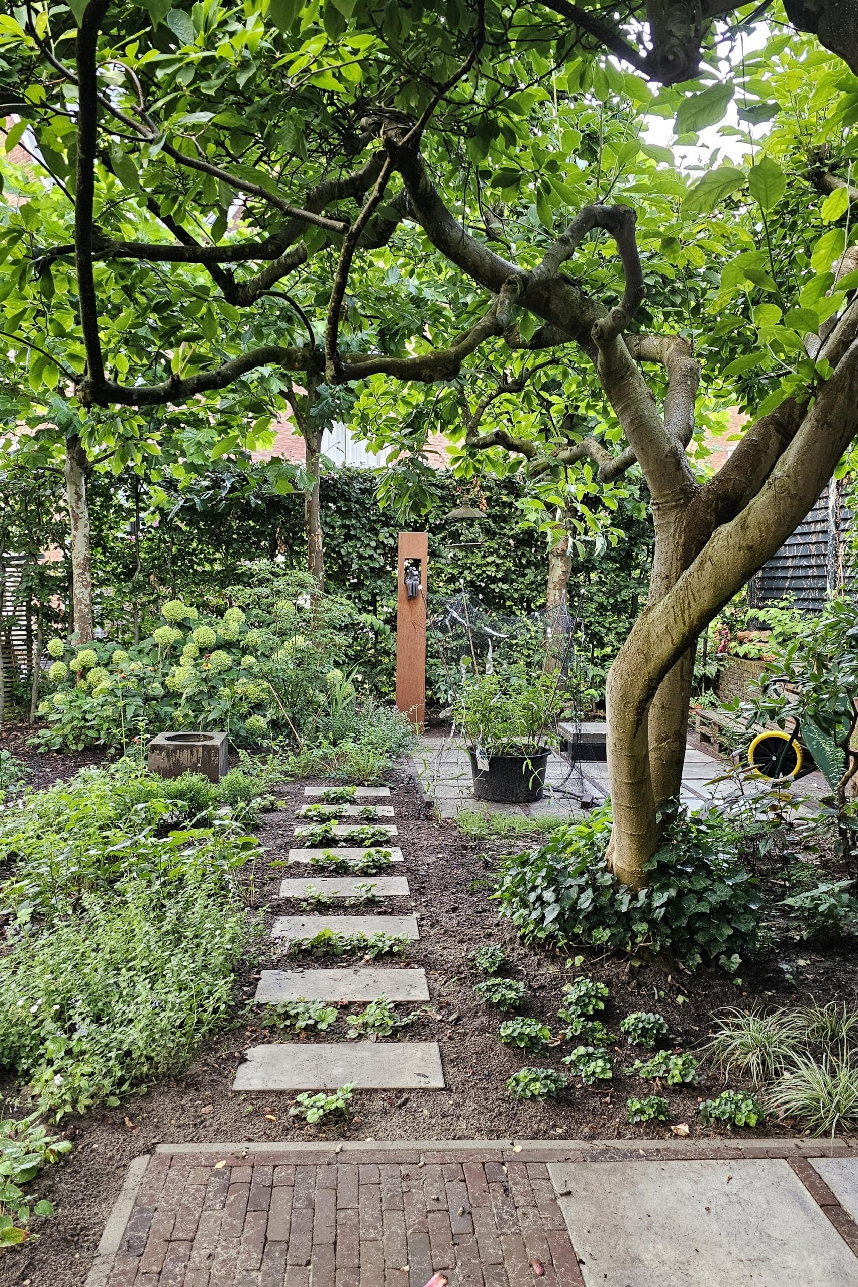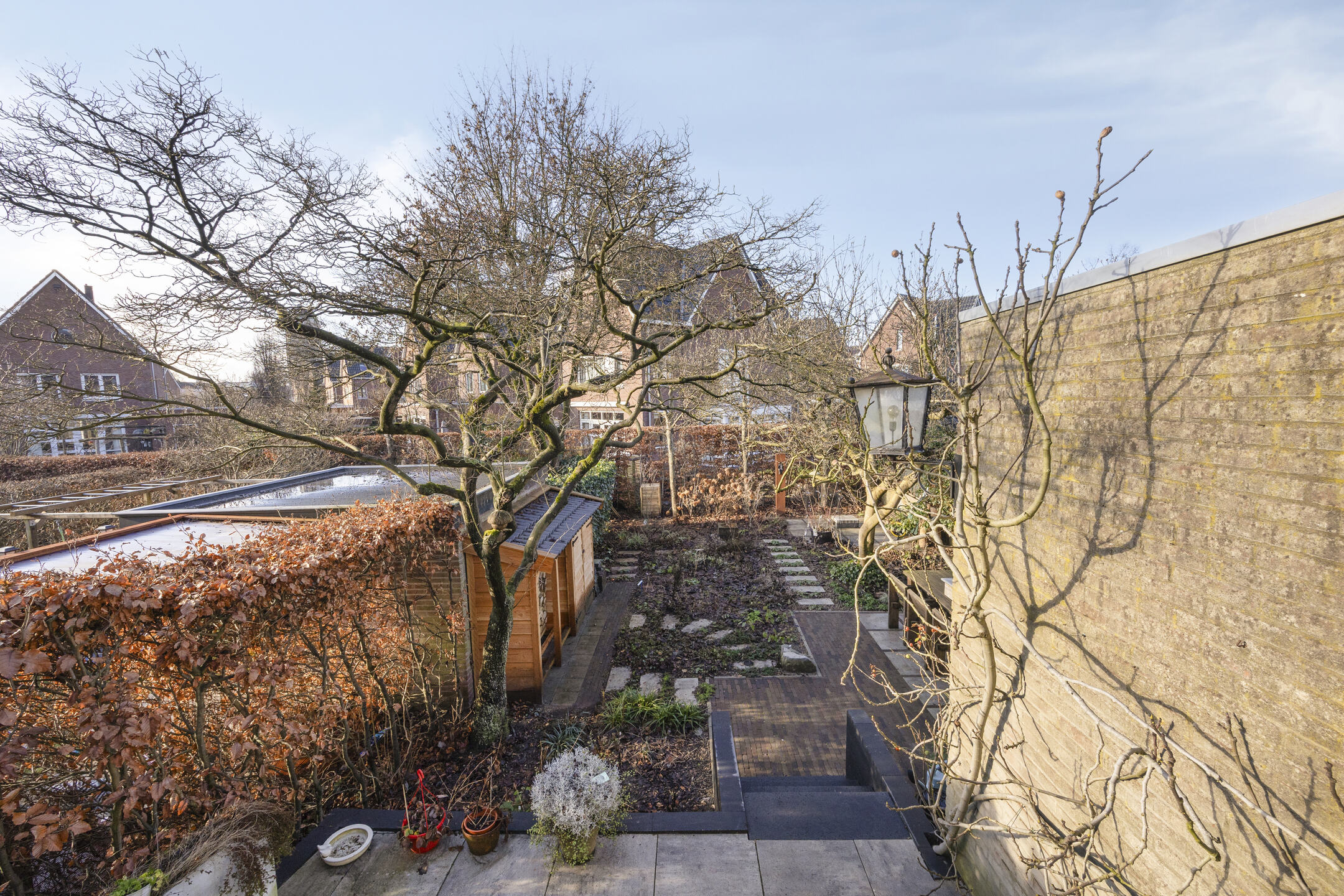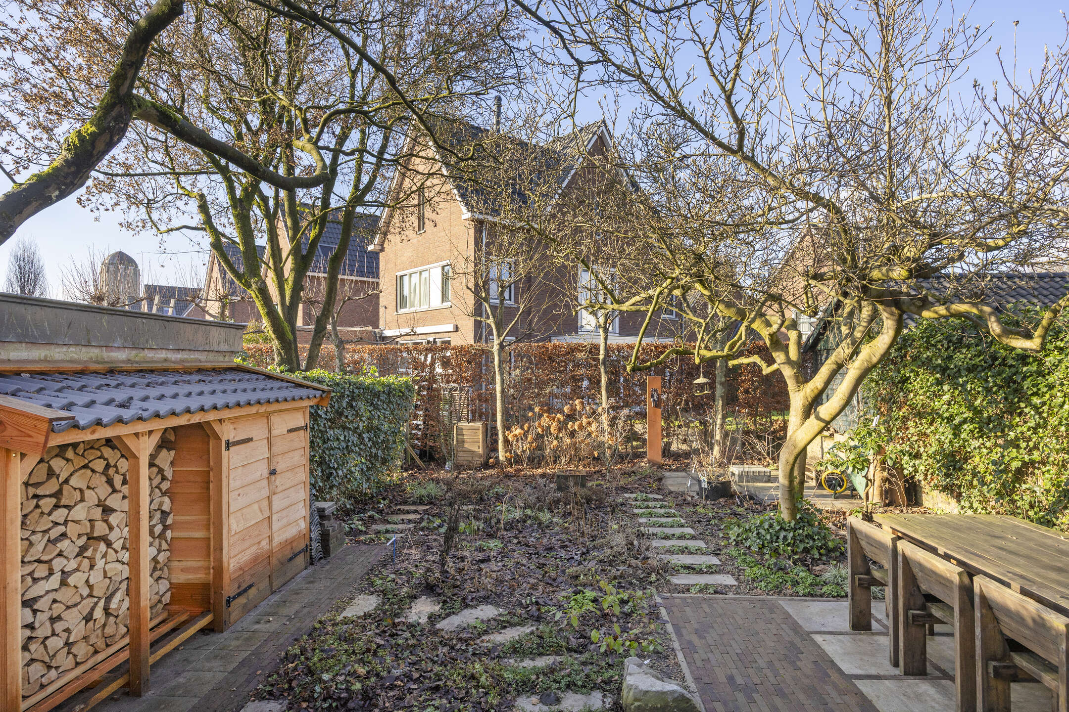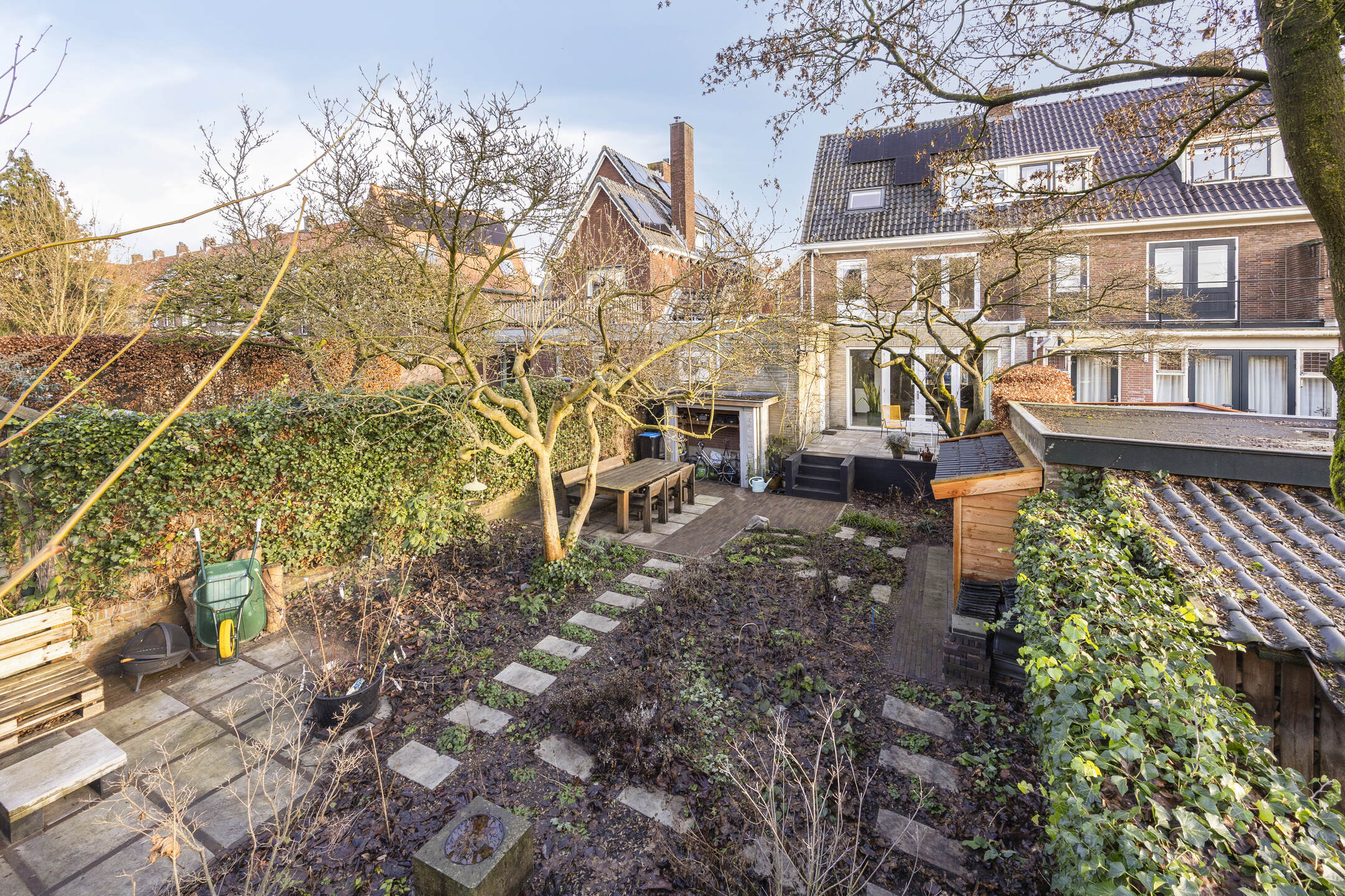 De voortuin en de zonnige achtertuin op het westen zijn in het voorjaar van 2025 volledig opnieuw aangelegd en beschikken over drie terrassen, sierbestrating, stepping stones door de borders en een houtopslag. Aan de voorzijde een looppad naar de entree en een groenstrook. Parkeren is mogelijk in de openbare parkeervakken in de straat.
