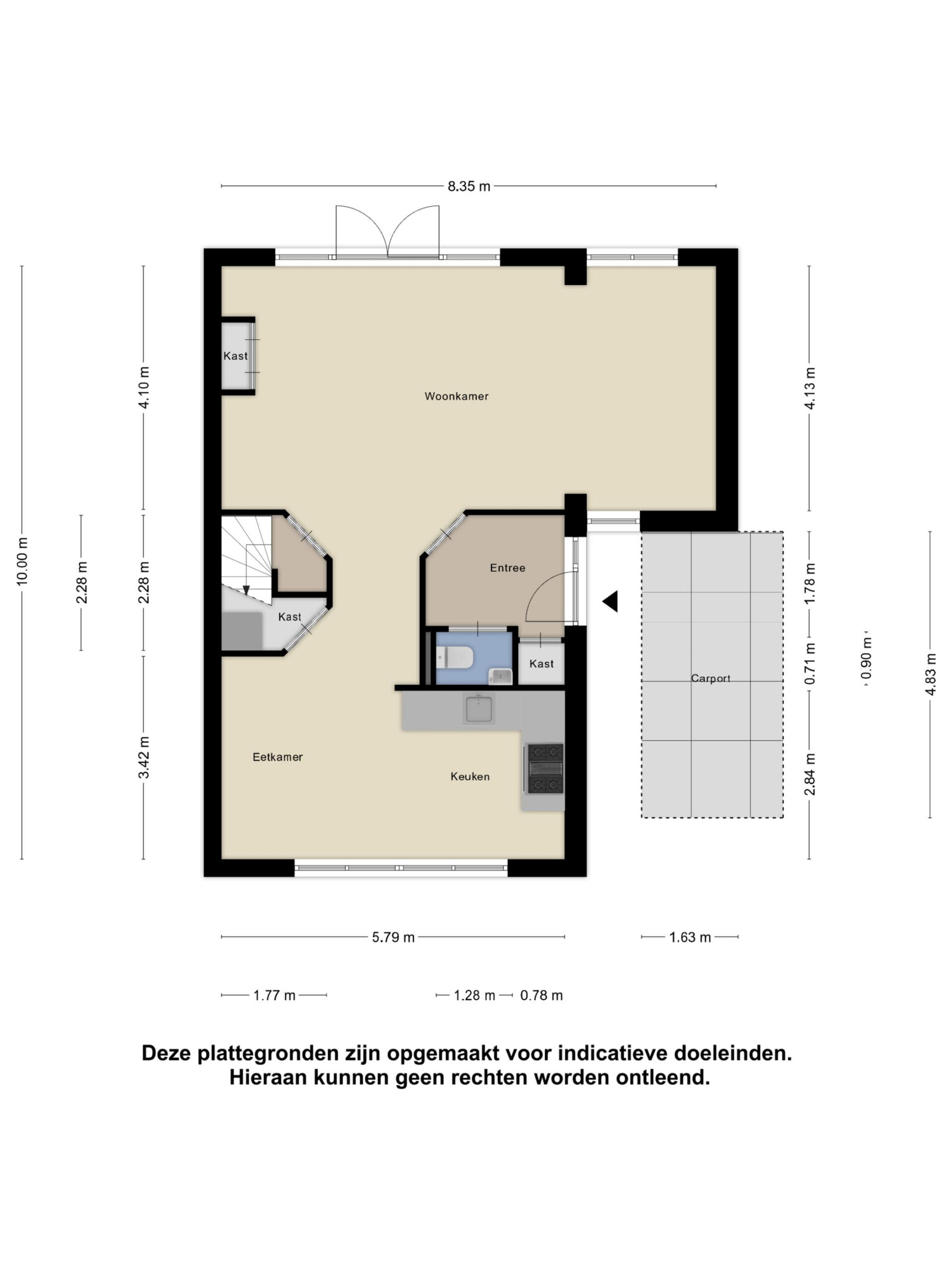 Begane grond: entree, hal met meterkast en toilet voorzien van wandcloset en fonteintje. Riante woonkamer aan de tuinzijde, voorzien van openslaande deuren naar de achtertuin en vaste kastruimte. Woonkeuken aan de voorzijde met ruime eethoek, voorzien van inbouwapparatuur. Tussenhal met trapopgang naar de 1e verdieping.