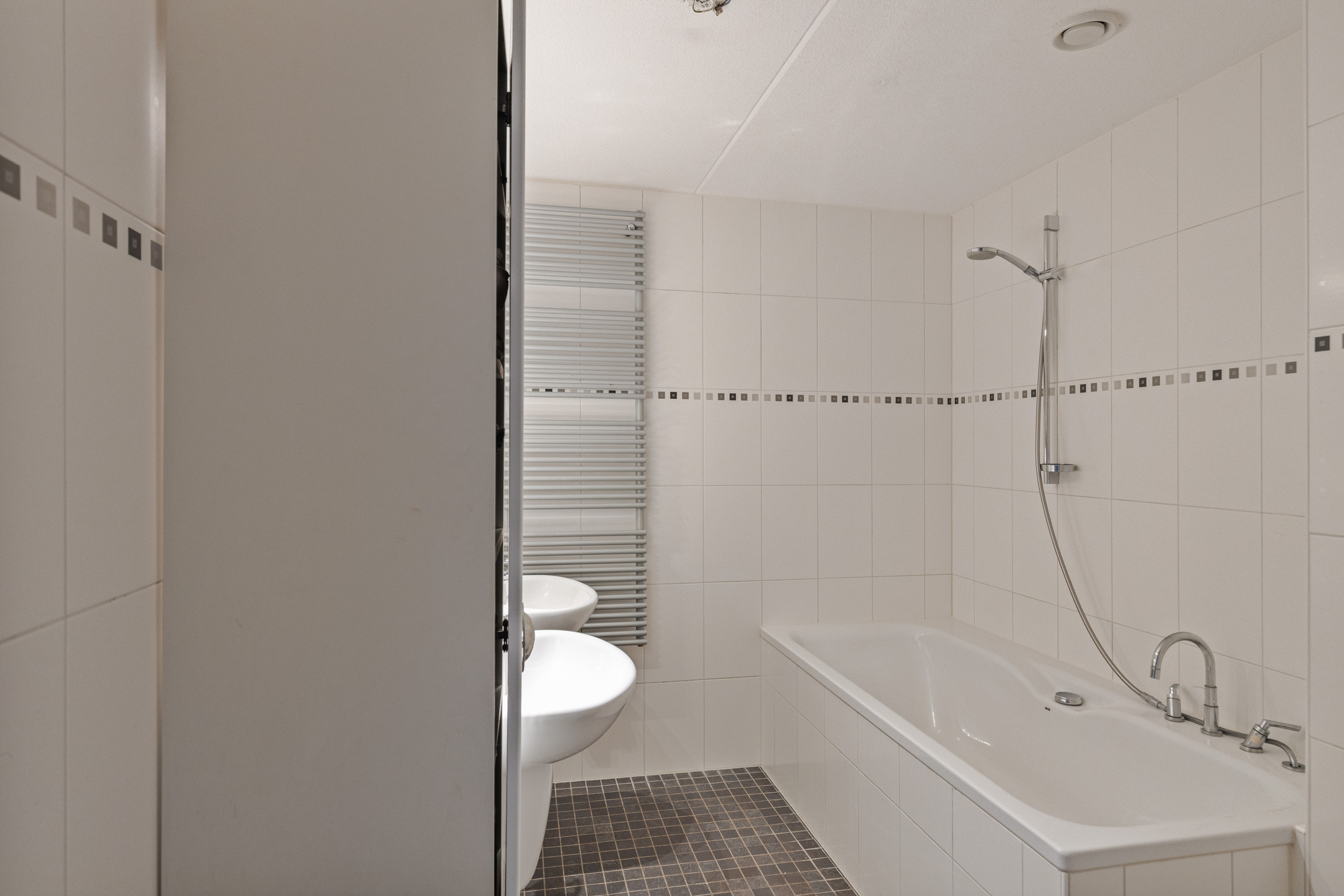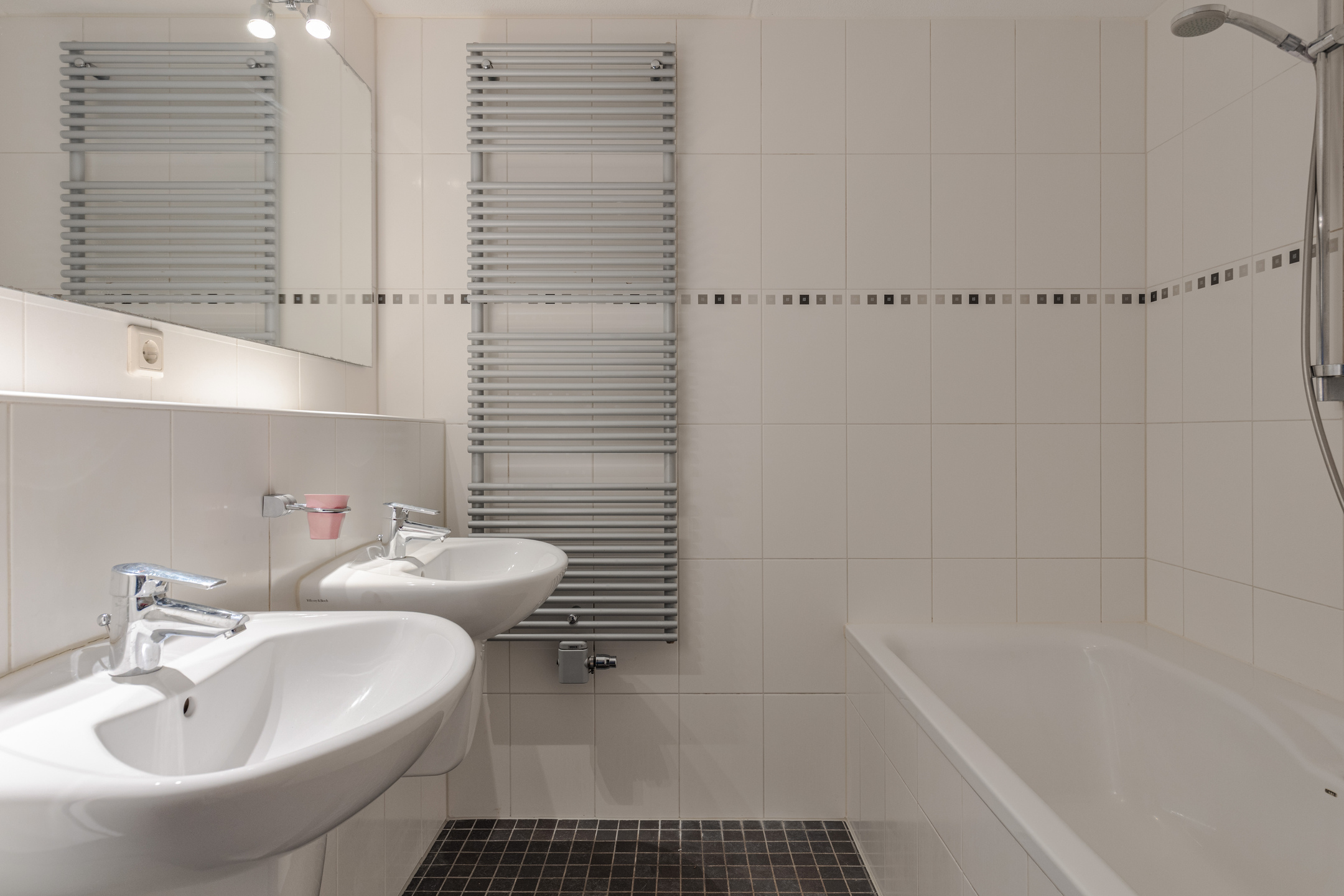 1e Verdieping: overloop. Drie slaapkamers ter grootte van circa 11 m², 14 m² en 17 m². De middelgrootte slaapkamer bestaat uit twee gedeelten. De grote slaapkamer is voorzien van een vaste kastenwand. Badkamer voorzien van dubbele wastafel, ligbad met douche en handdoekenradiator. Separaat toilet voorzien van wandcloset en fonteintje.