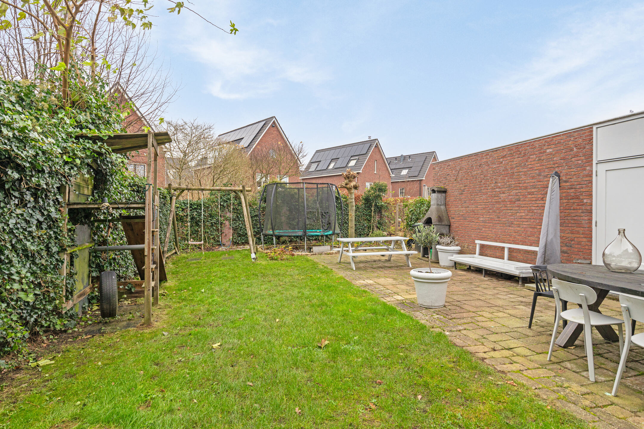 Achtertuin op het noorden welke voor het grootste gedeelte is voorzien van gazon en bestrating en beschikt over een ruime vrijstaande stenen bergschuur. De achtertuin is achterom te bereiken vanaf de voorzijde. Aan de voorzijde is een oprit aanwezig met parkeerruimte voor minstens twee personen auto’s, voorzien van carport.