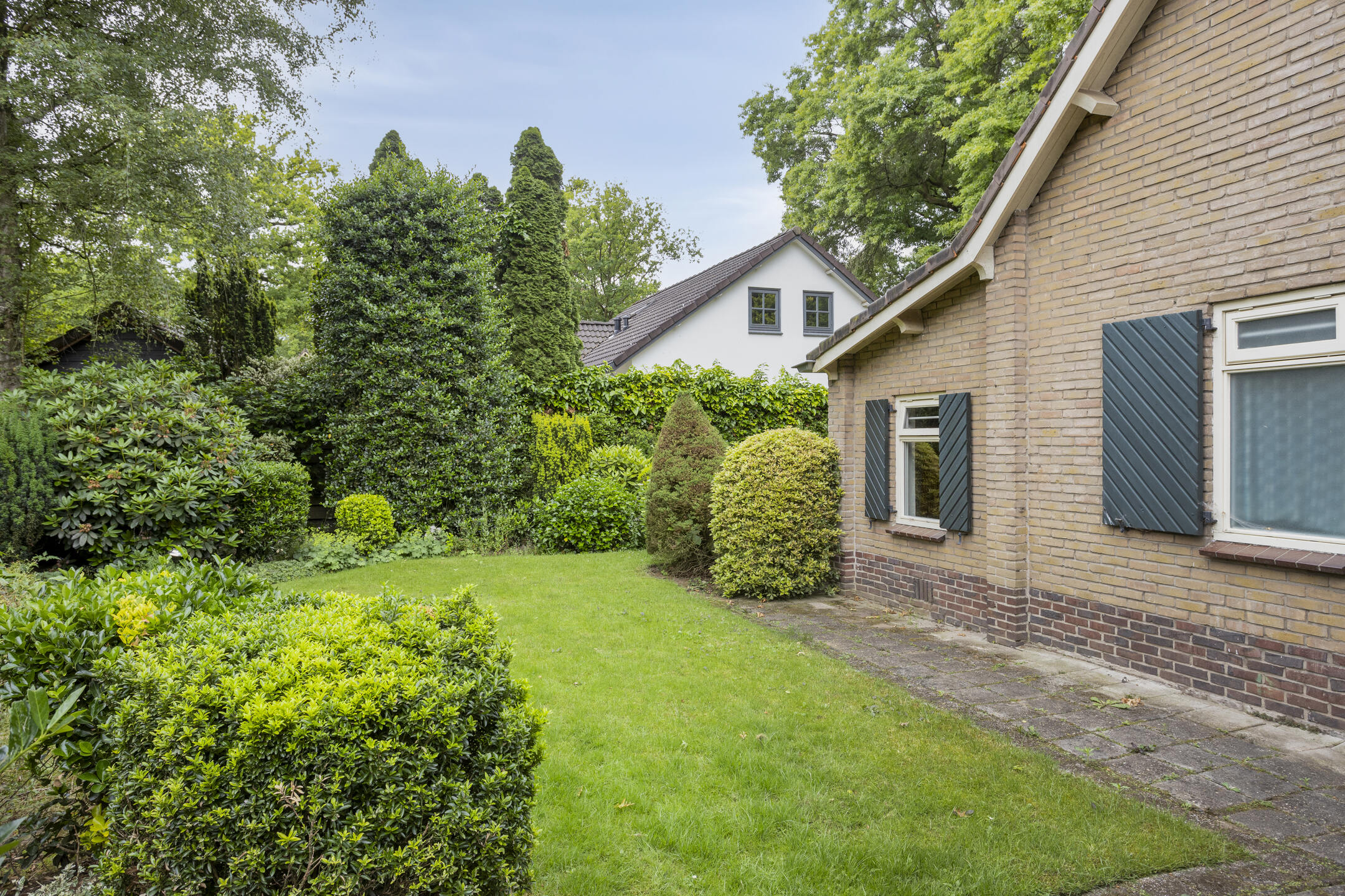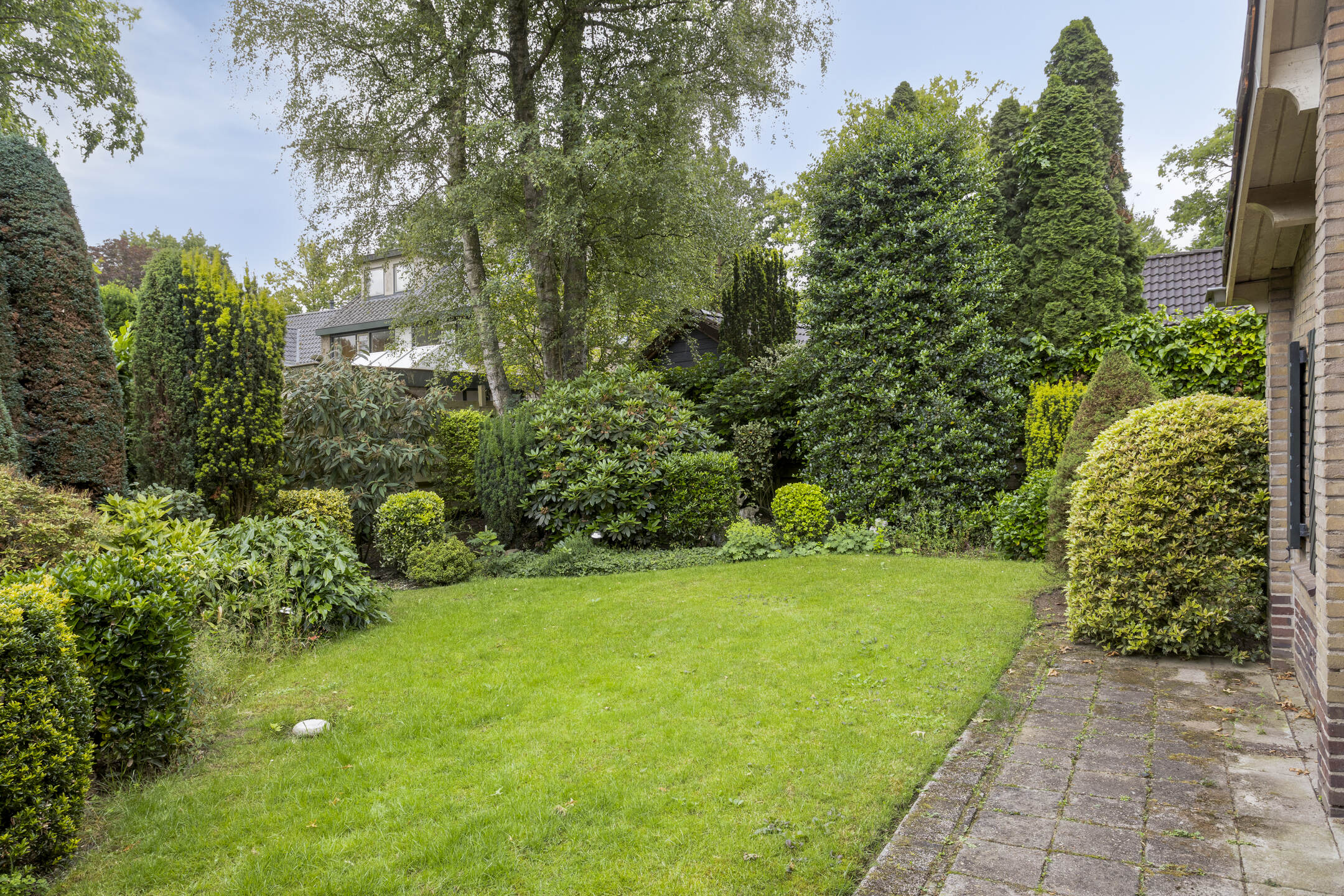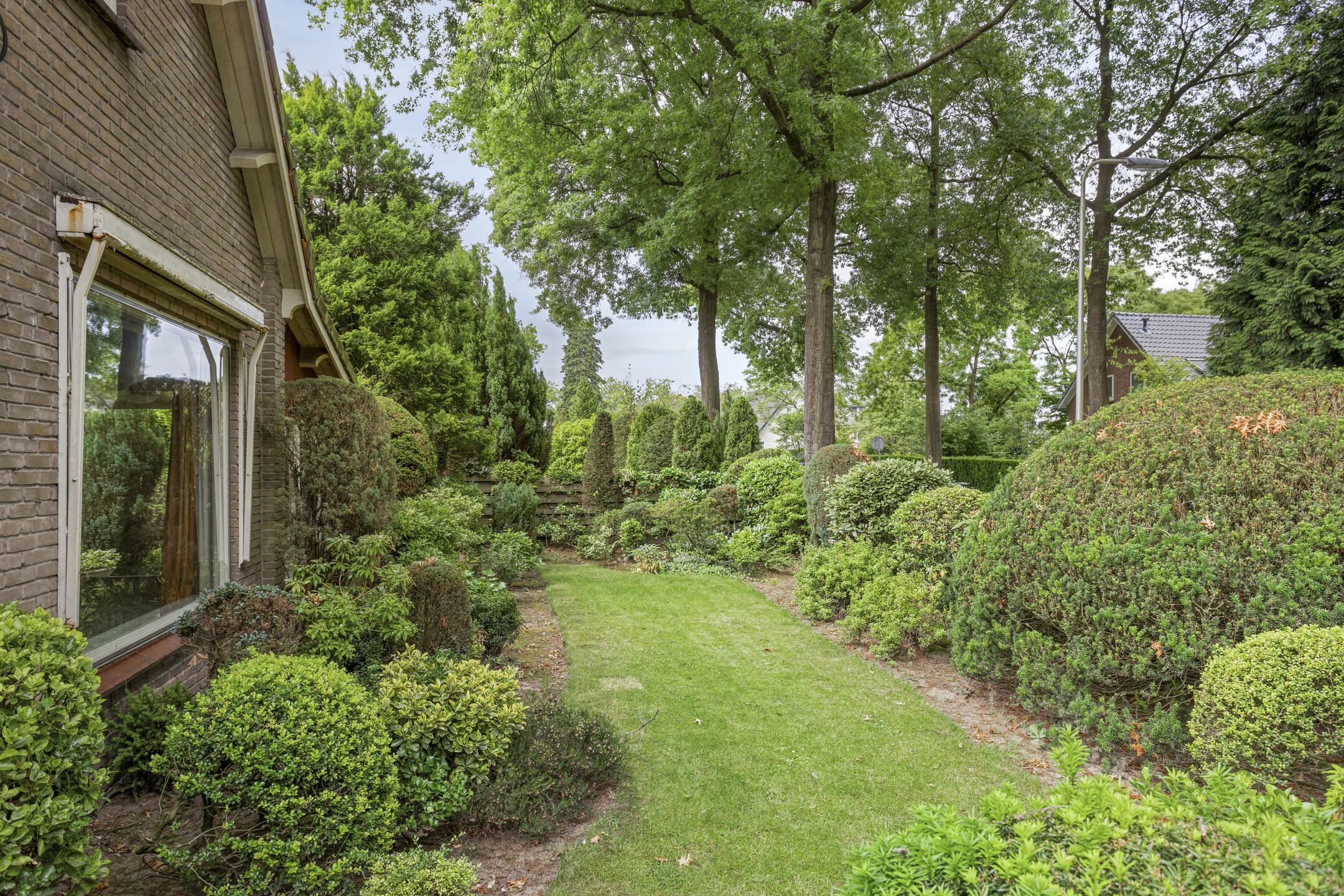 De woning biedt een royale tuin rondom met veel groen, gazon, meerdere zitjes en een oprit aan de voorzijde met parkeerruimte voor twee personenauto’s op eigen terrein.
