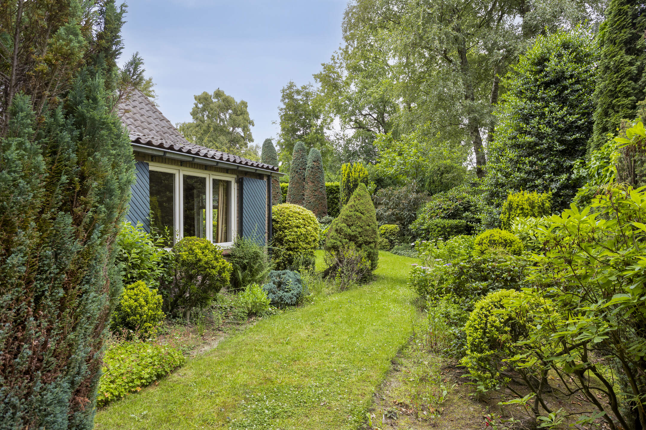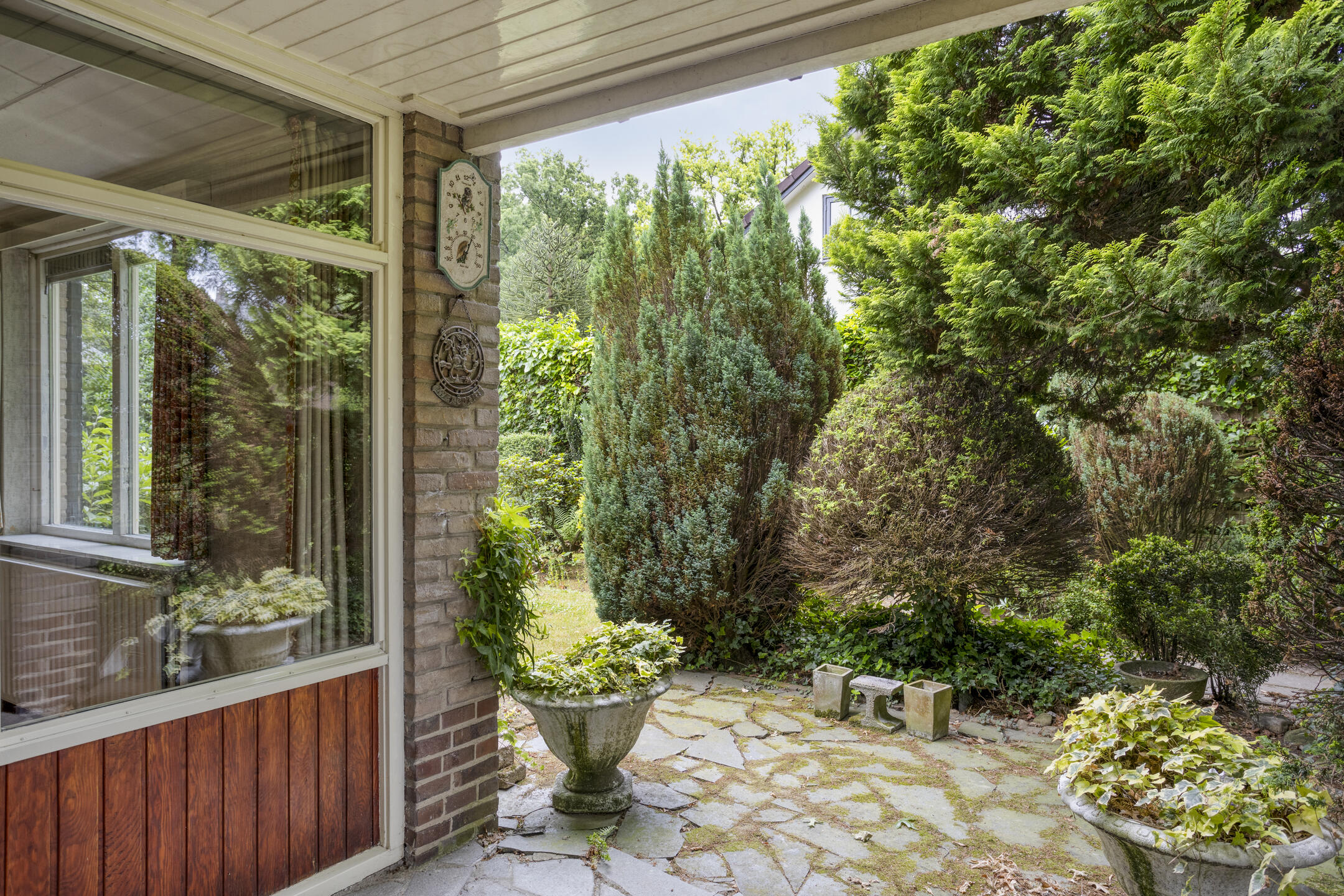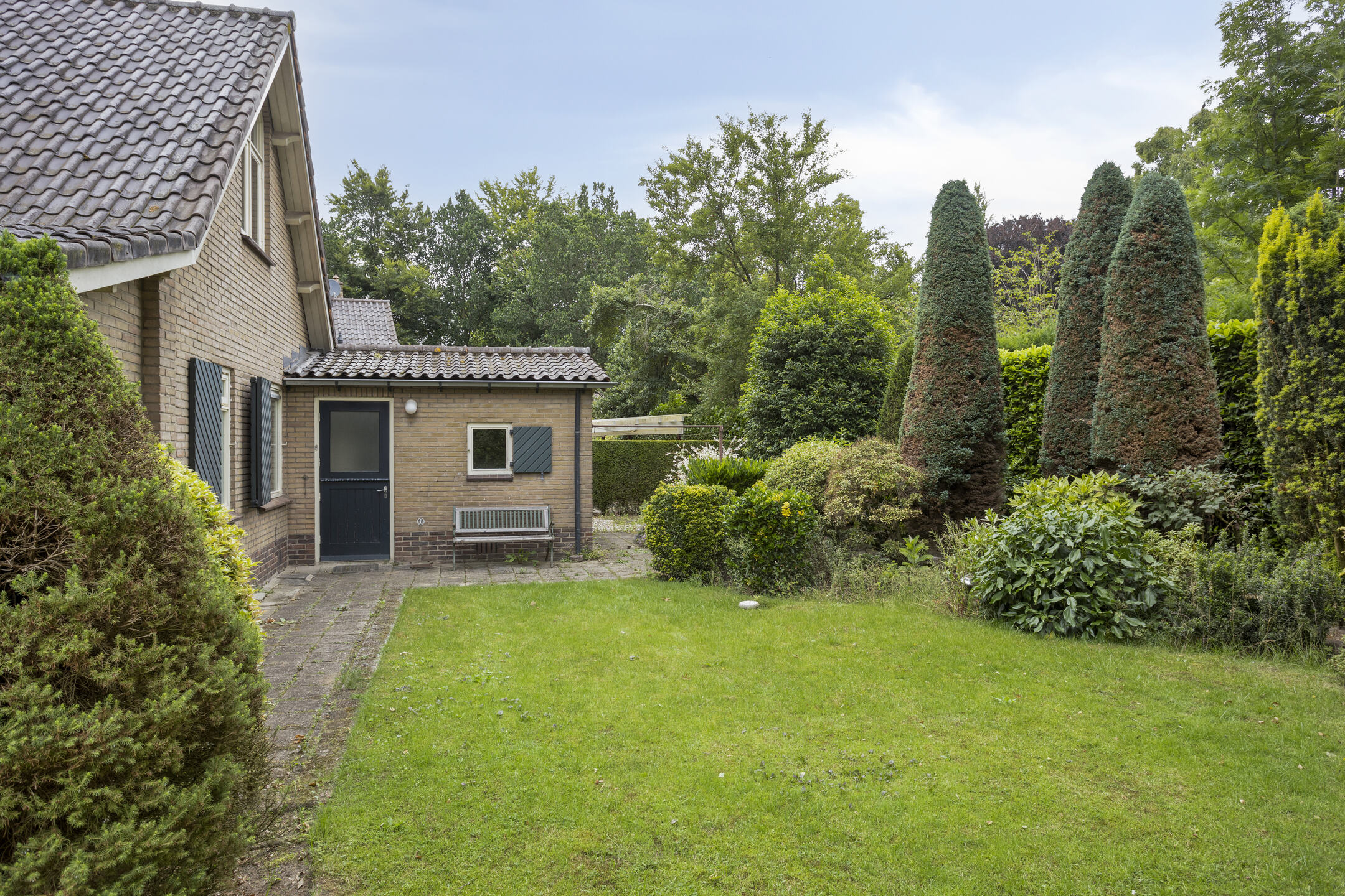 De woning biedt een royale tuin rondom met veel groen, gazon, meerdere zitjes en een oprit aan de voorzijde met parkeerruimte voor twee personenauto’s op eigen terrein.