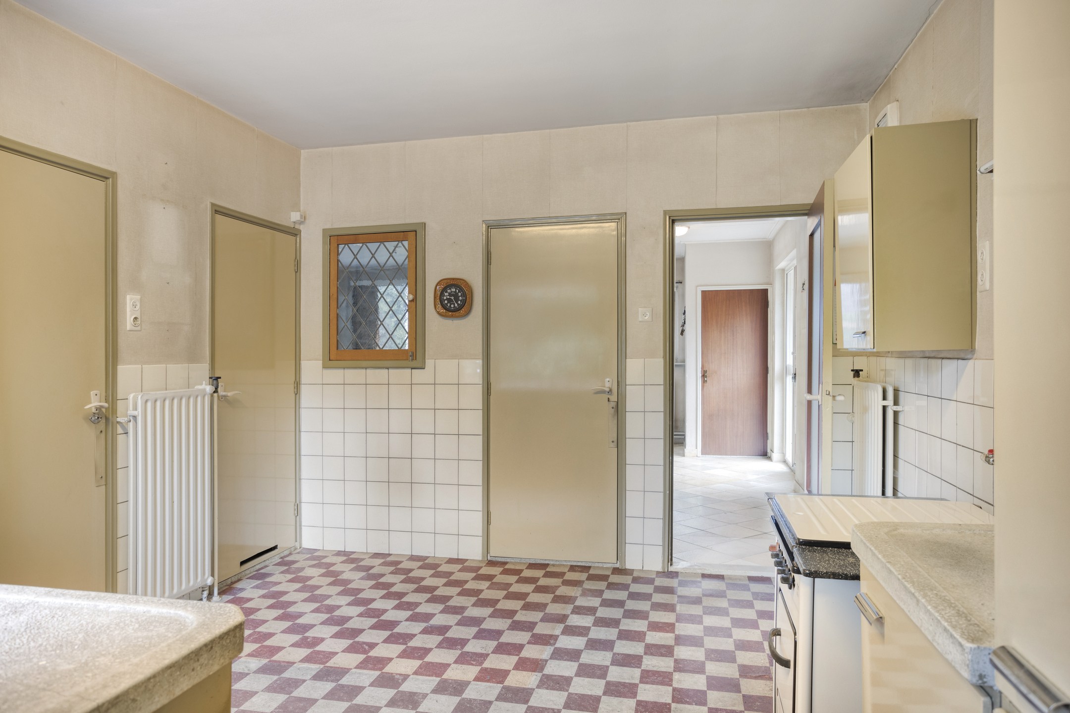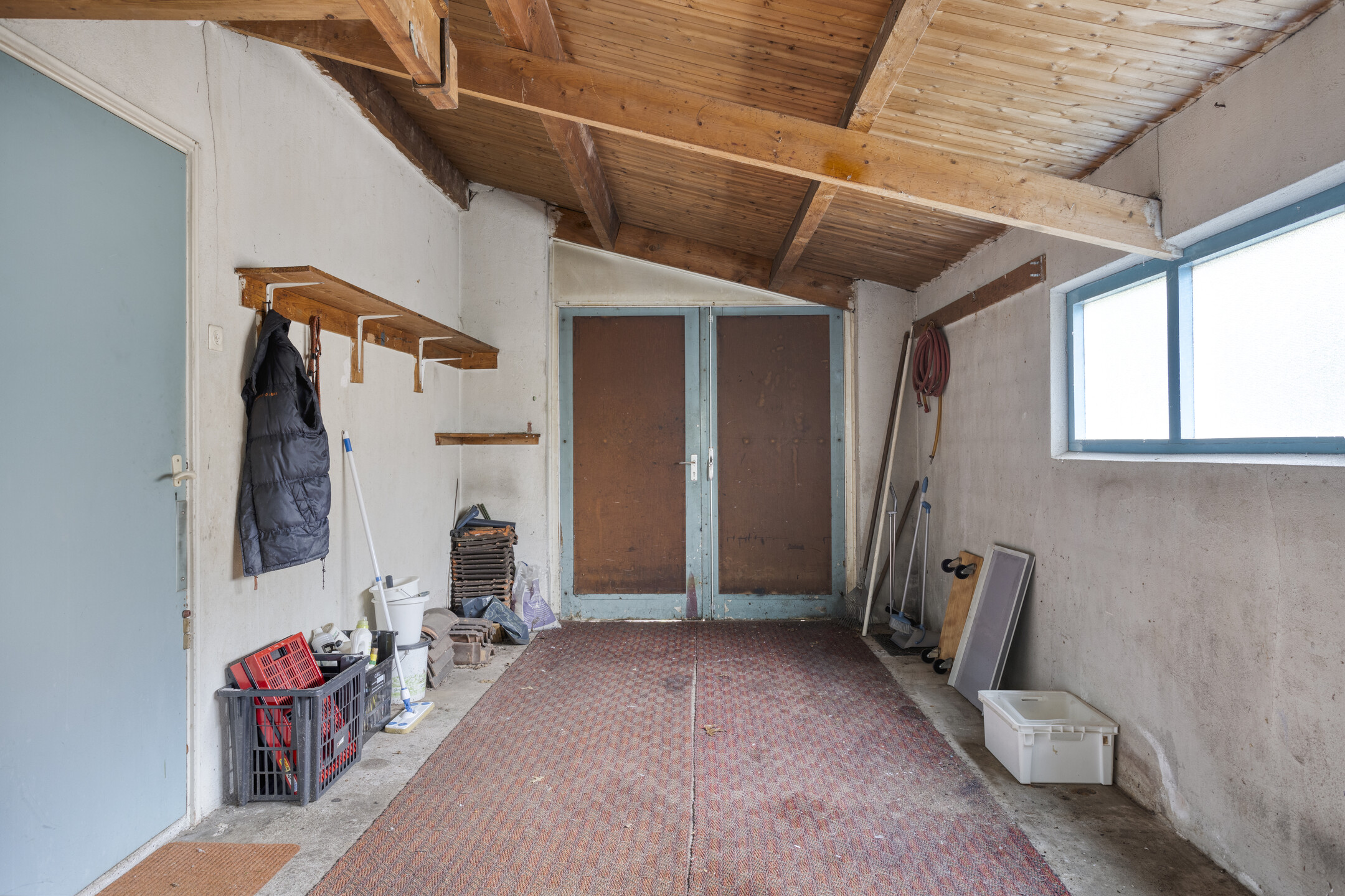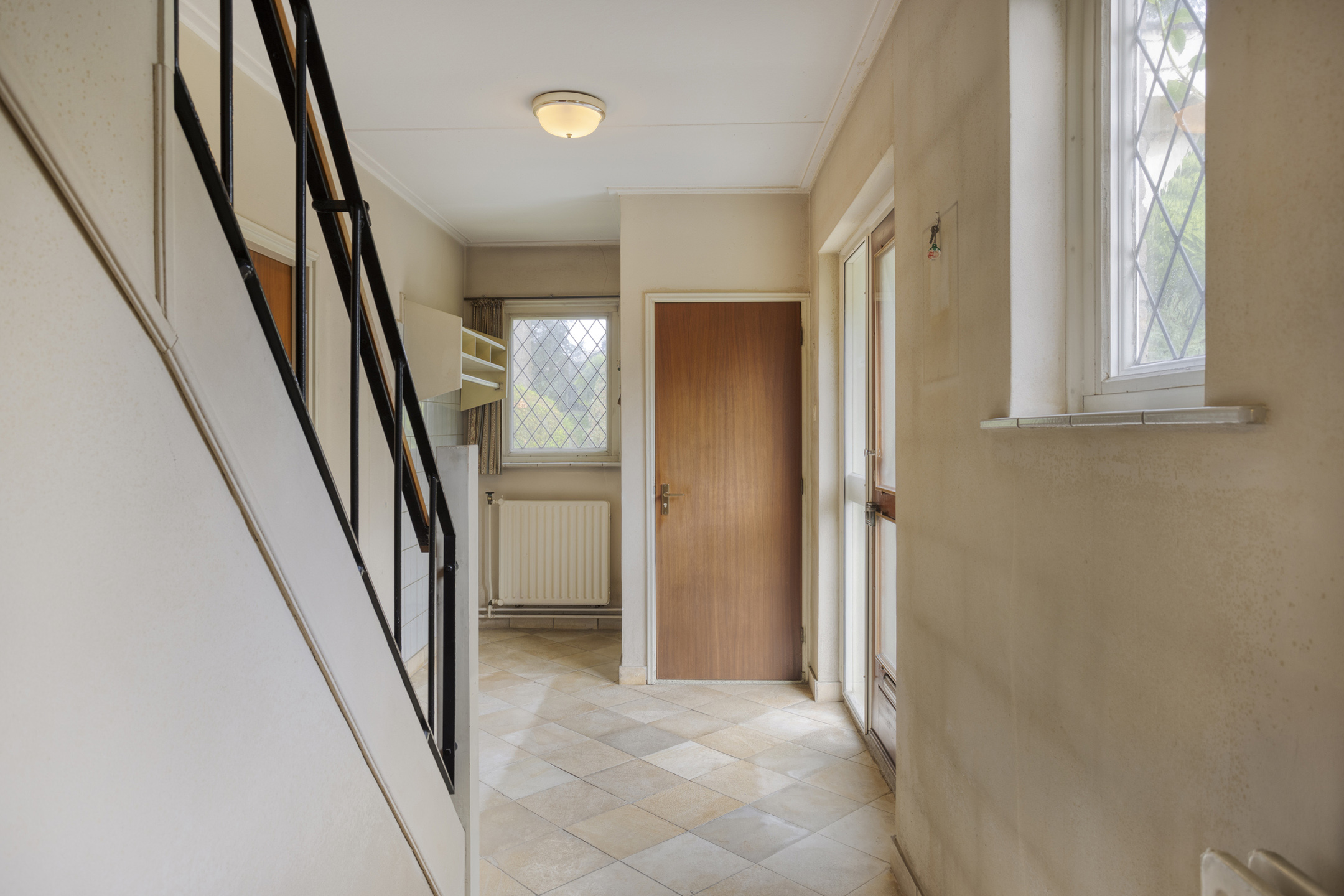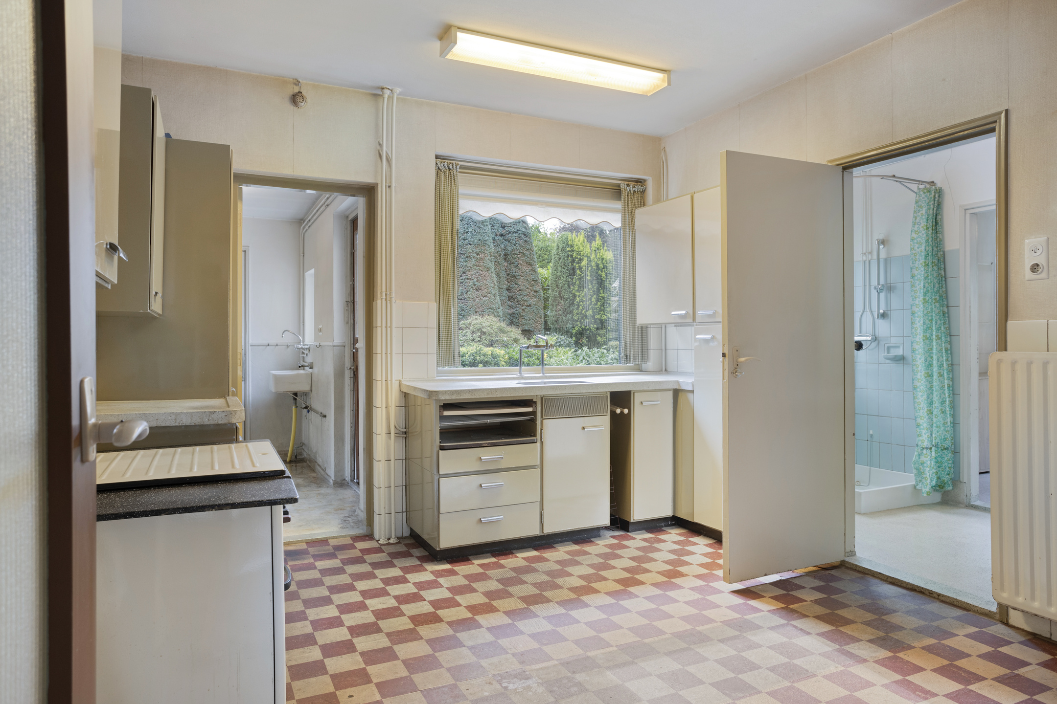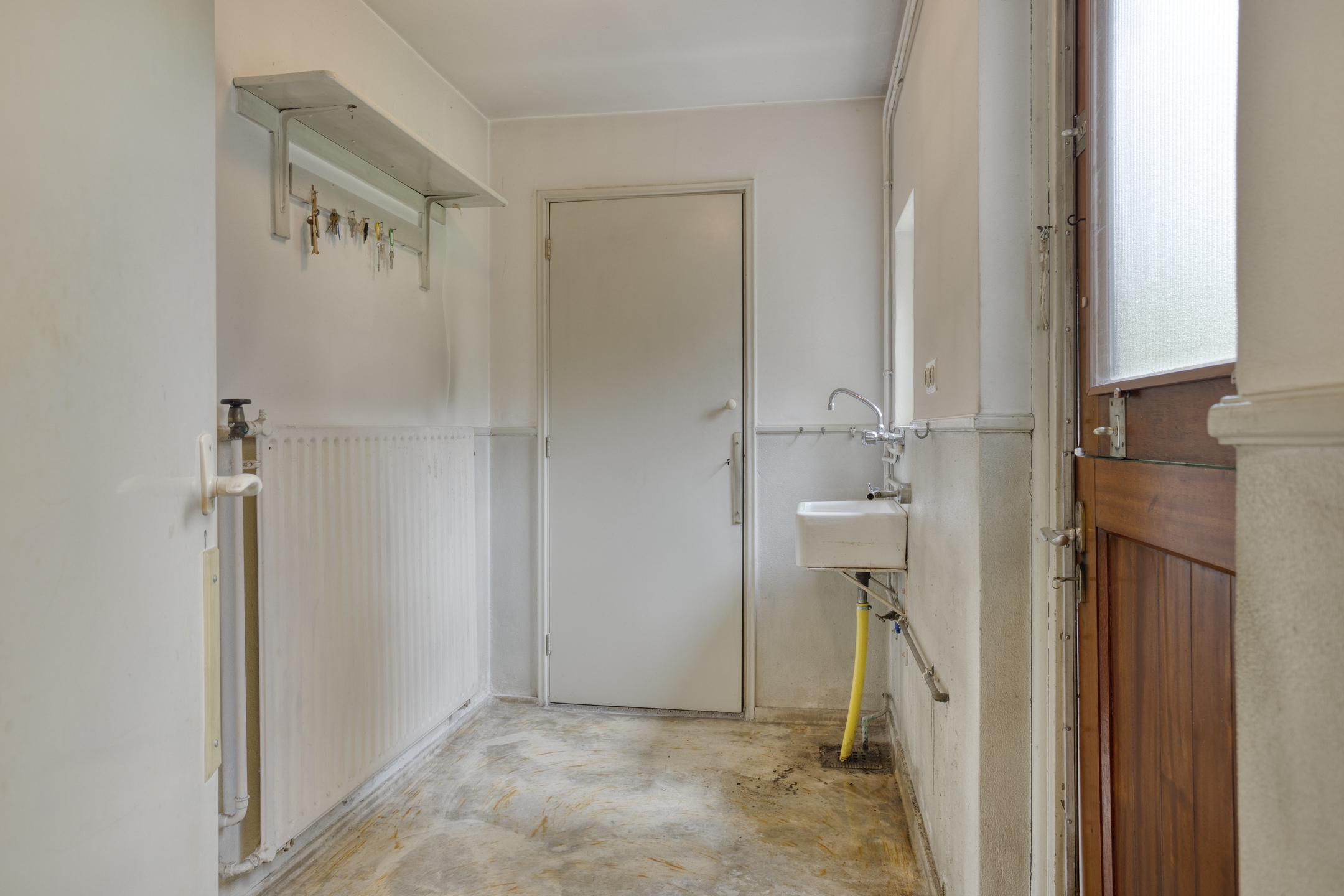 Begane grond: overdekte entree, hal met garderobe, trapopgang naar de 1e verdieping en toilet voorzien van fonteintje. Ruime woonkamer aan de voorzijde, voorzien van parketvloer en toegang tot het overdekte terras in de tuin. Ruime, dichte keuken met toegang naar de kelder. Bijkeuken/berging met wastafel, toegang tot de garage (ter grootte van circa 19 m²) en deur naar de achtertuin. Ruime slaapkamer ter grootte van circa 13,5 m², voorzien van vaste kasten. Badkamer en suite met douche, tweede toilet en dubbel wastafelmeubel. De badkamer is ook vanuit de keuken te bereiken.