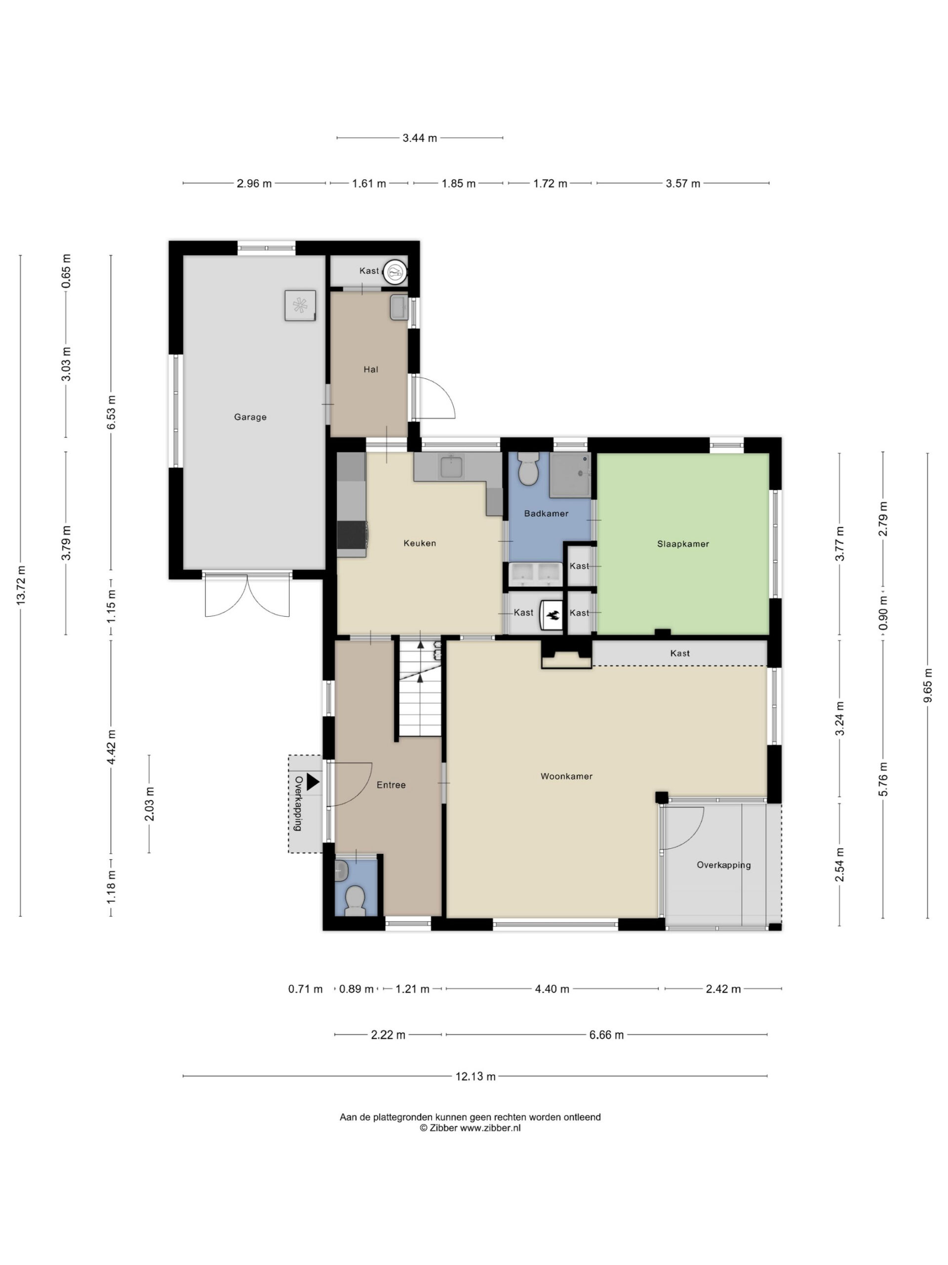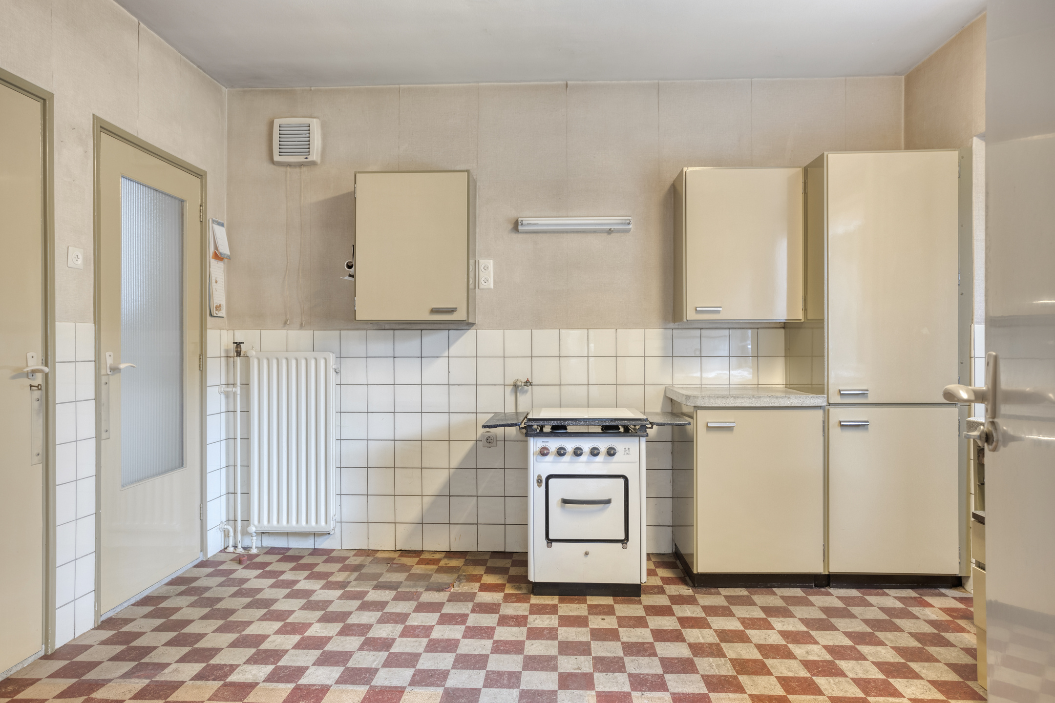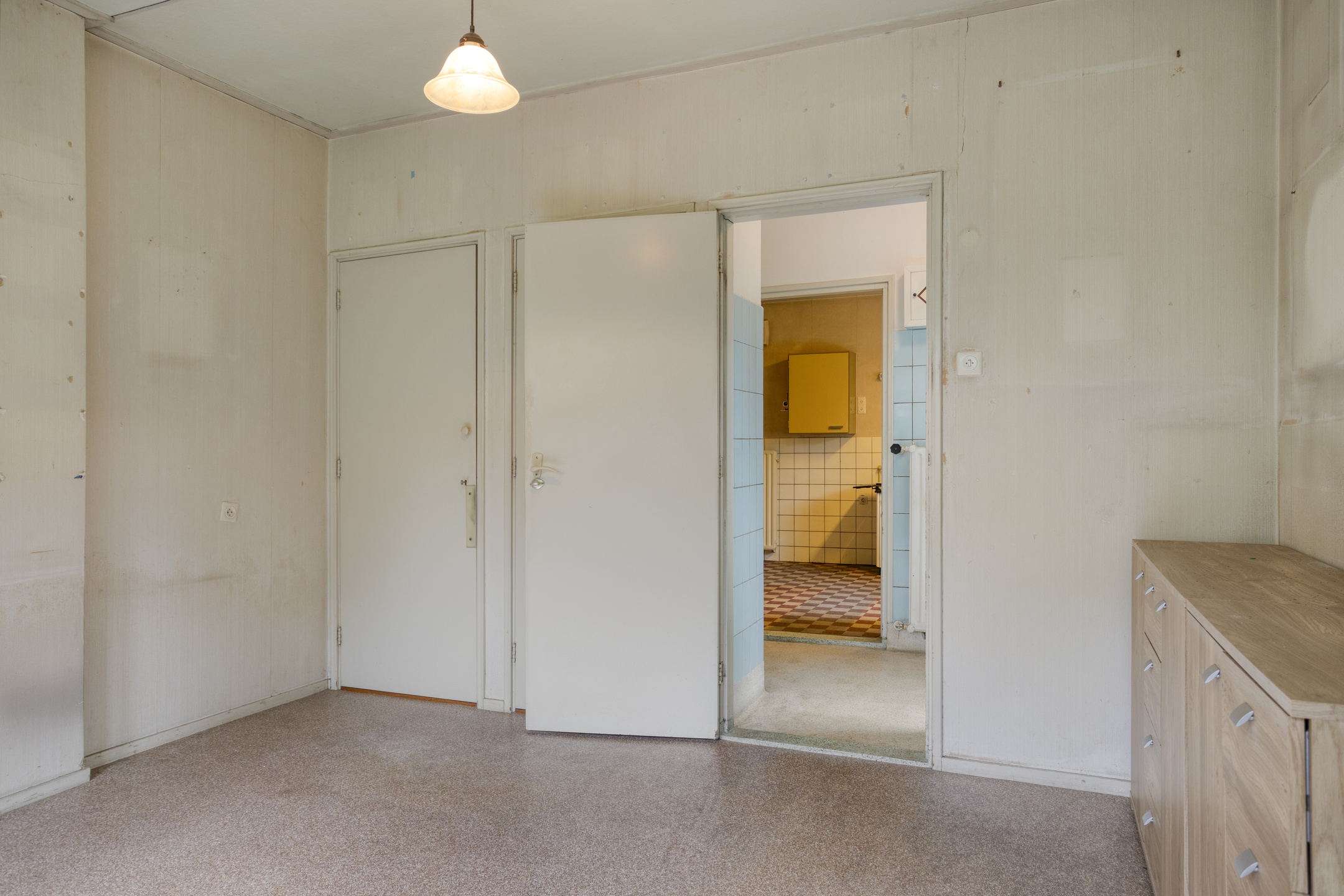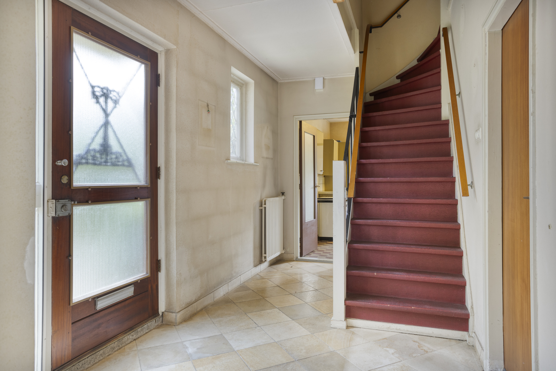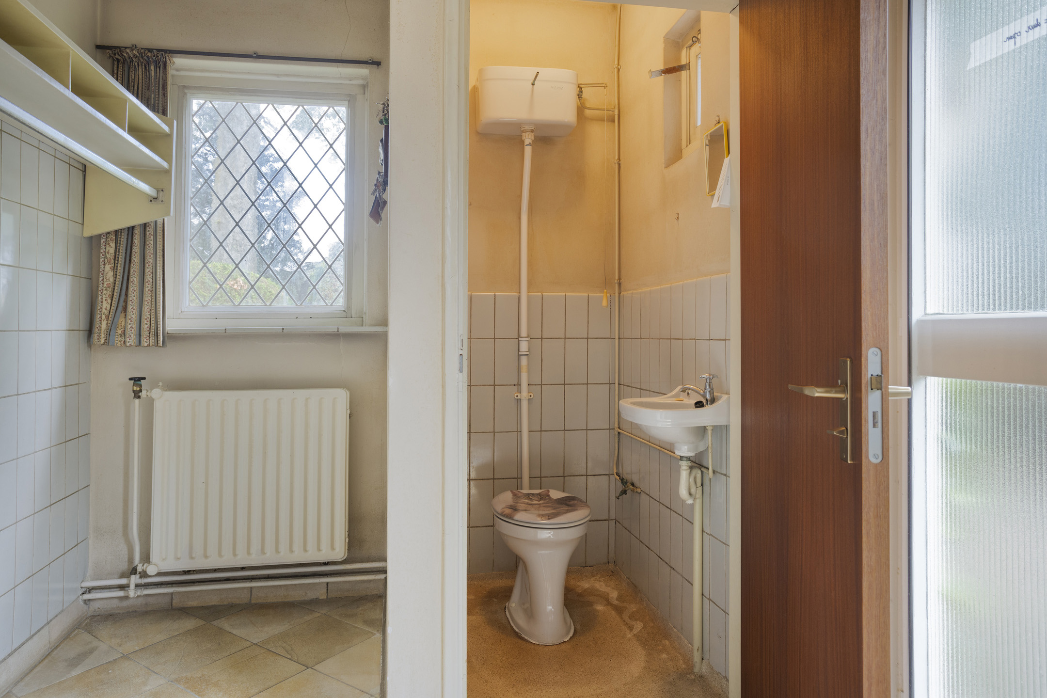 Begane grond: overdekte entree, hal met garderobe, trapopgang naar de 1e verdieping en toilet voorzien van fonteintje. Ruime woonkamer aan de voorzijde, voorzien van parketvloer en toegang tot het overdekte terras in de tuin. Ruime, dichte keuken met toegang naar de kelder. Bijkeuken/berging met wastafel, toegang tot de garage (ter grootte van circa 19 m²) en deur naar de achtertuin. Ruime slaapkamer ter grootte van circa 13,5 m², voorzien van vaste kasten. Badkamer en suite met douche, tweede toilet en dubbel wastafelmeubel. De badkamer is ook vanuit de keuken te bereiken.