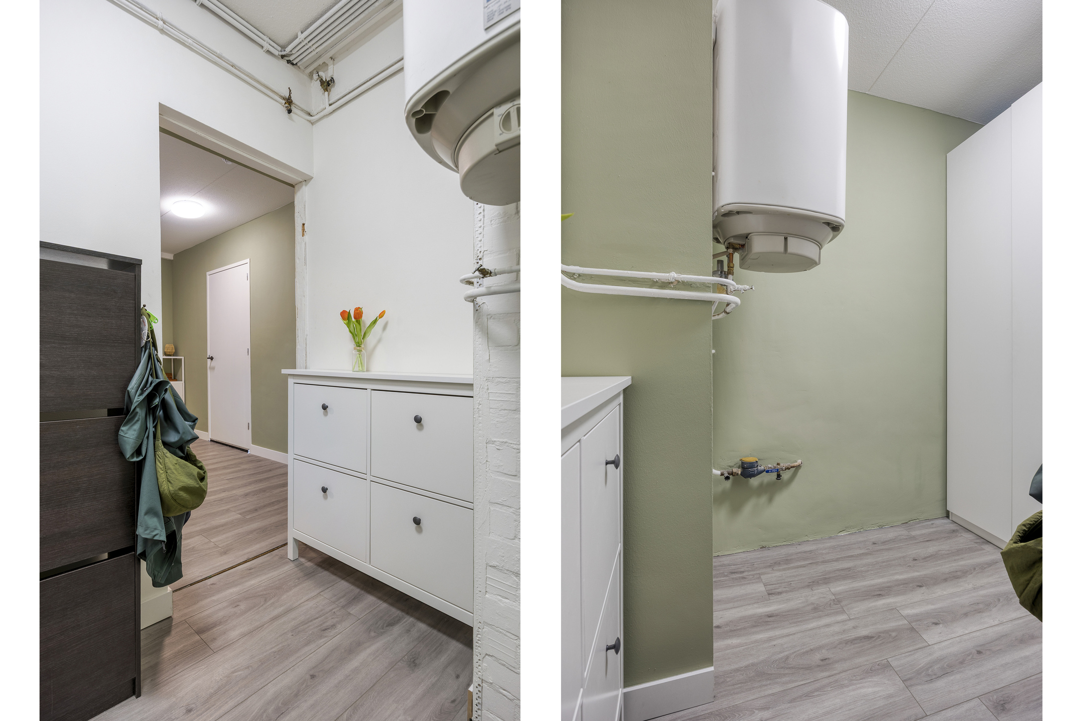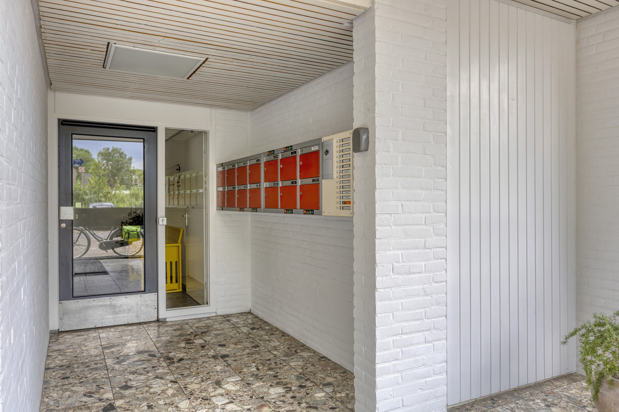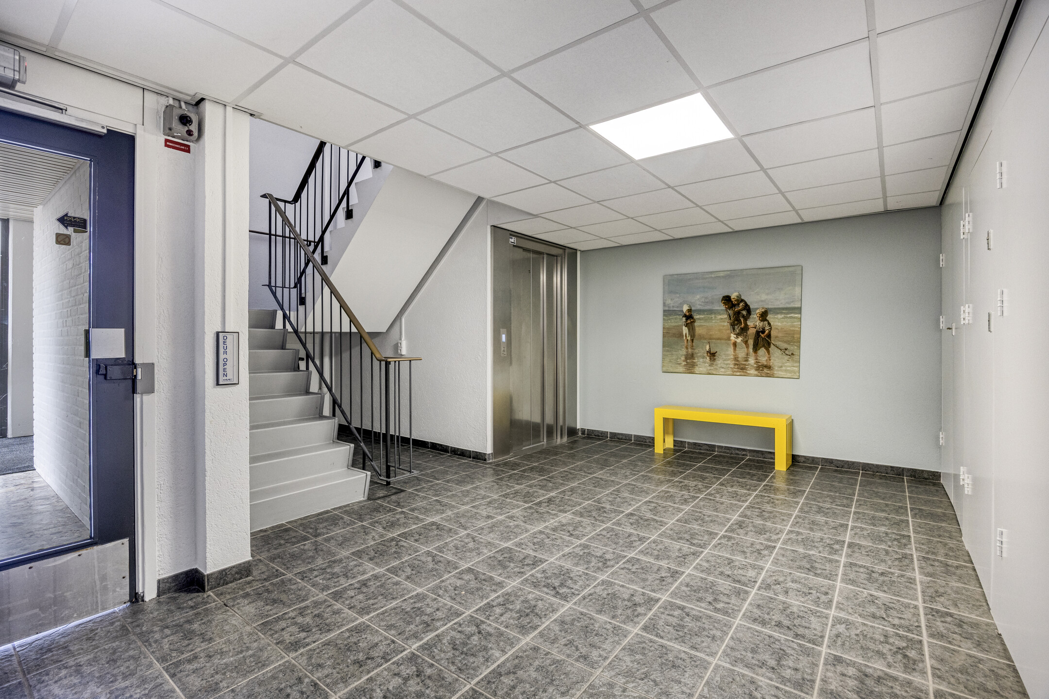 Begane grond: gezamenlijke entree met brievenbussen, intercom, lift, toegang tot het trappenhuis, de gemeenschappelijke fietsenberging en privé berging in de onderbouw.