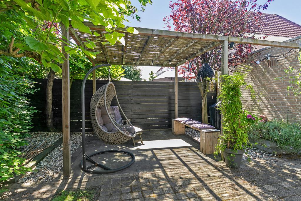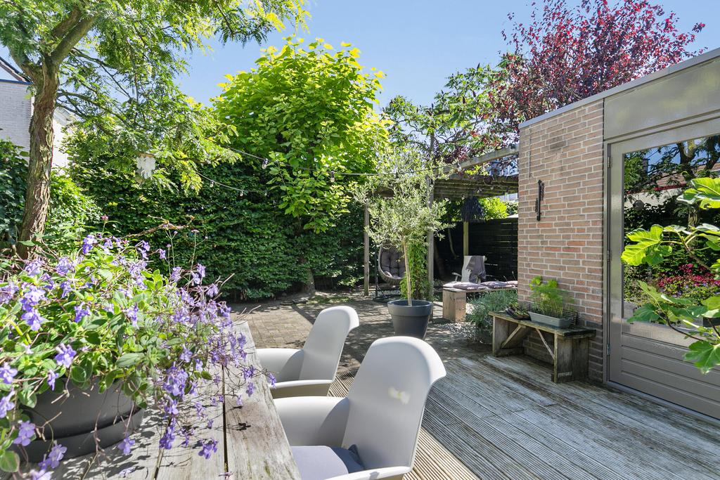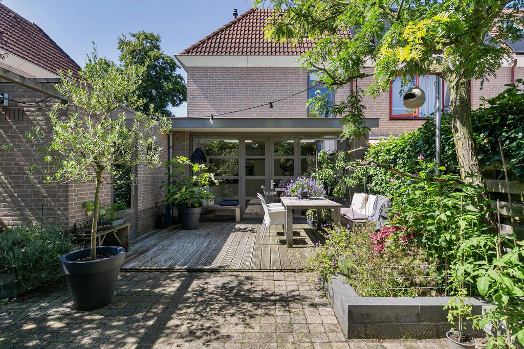 Fraai aangelegde achtertuin op het zuidoosten met vlonderterras aan de achtergevel met overkapping, meerdere borders en toegang tot de garage (ter grootte van circa 17 m²). Voortuin met oprit voor de garage met parkeerruimte voor twee personenauto’s.