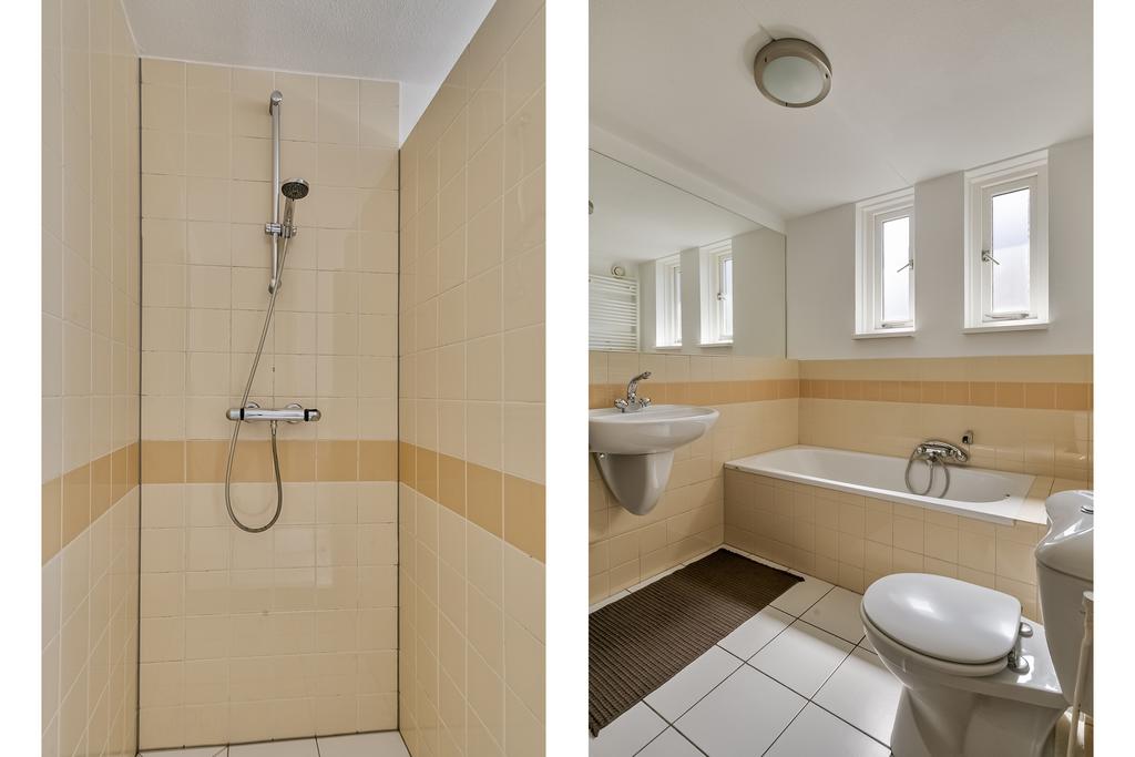 1e Verdieping: overloop. Drie slaapkamers ter grootte van circa 8,5 m², 9 m² en 14,5 m², allen voorzien van nette doorgelegde laminaatvloeren. Badkamer voorzien van wastafel, ligbad, inloopdouche en handdoekenradiator.