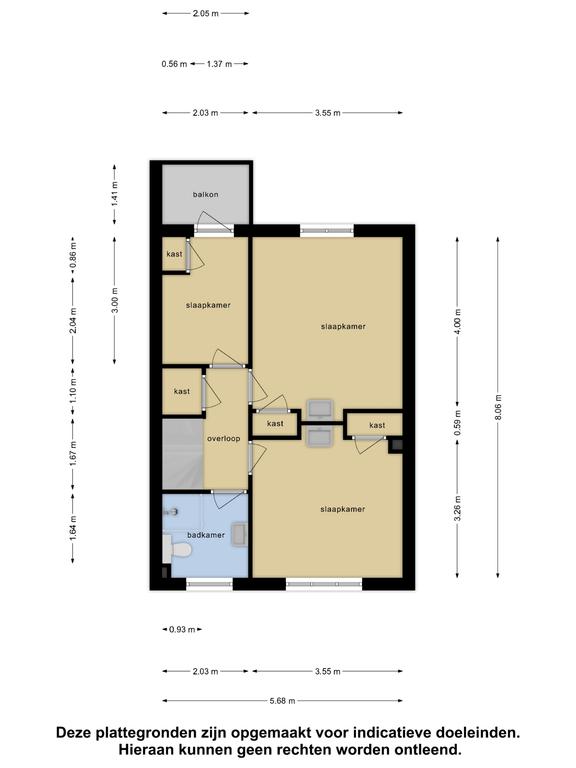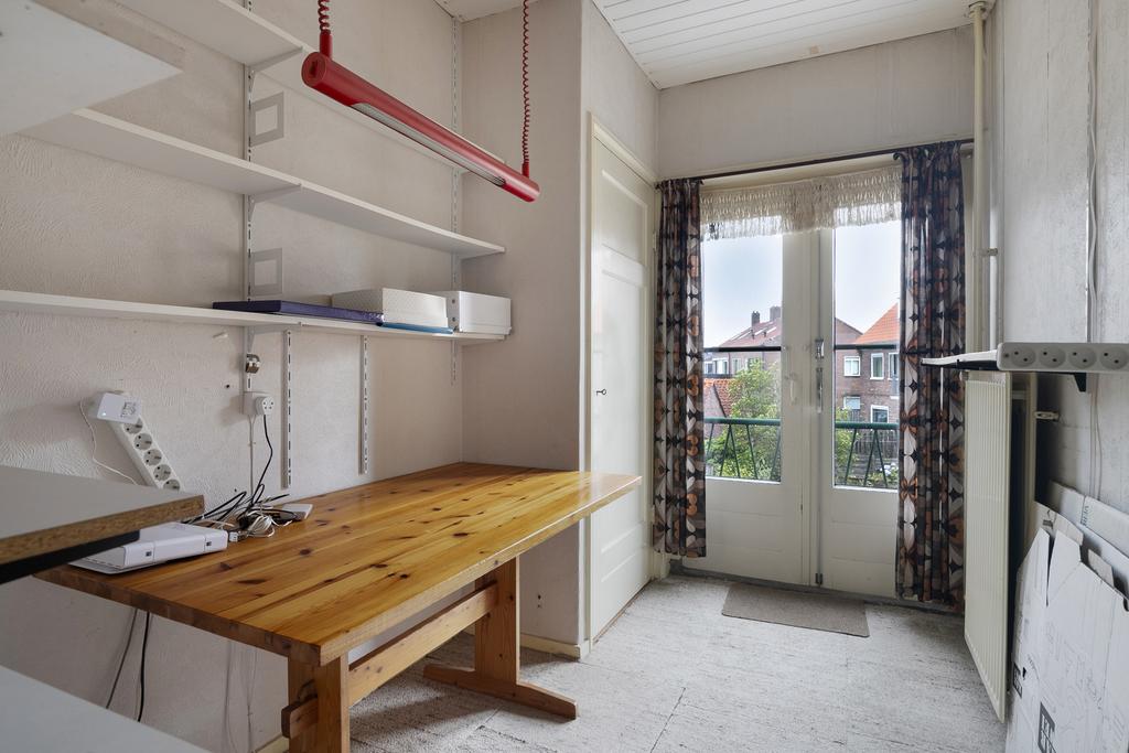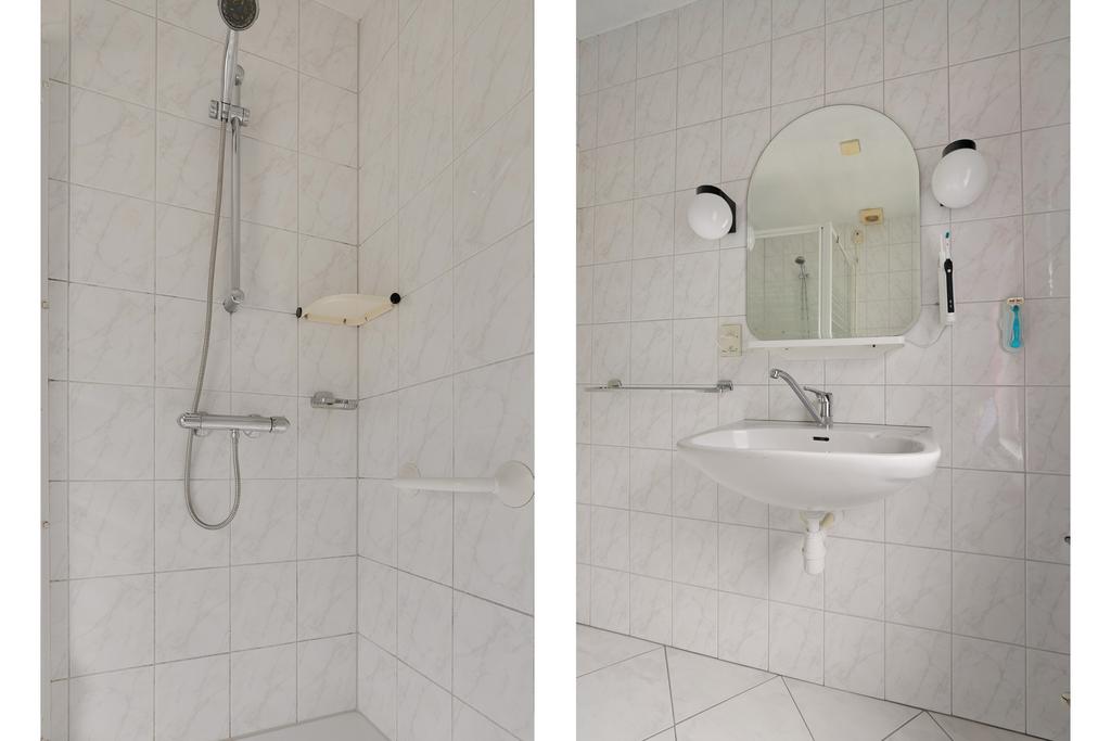 1e Verdieping: overloop met vaste kast. Drie slaapkamers ter grootte van circa 5,5 m², 12 m² en 14,5 m², allen voorzien van vloerbedekking en vaste kastruimte. De twee grote kamers beschikken over een wastafel, de kleine kamer heeft toegang tot het balkon aan de achterzijde van de woning. Badkamer met douche, wandcloset en wastafel.