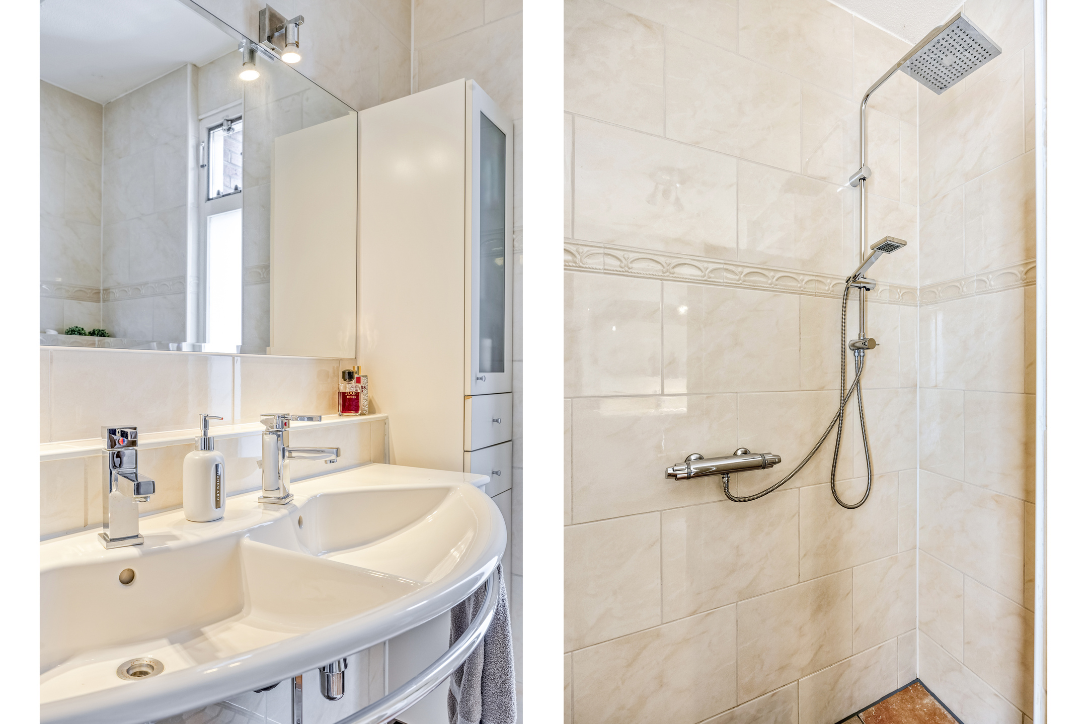 1e Verdieping: overloop. Drie (slaap-)kamers ter grootte van circa 6 m², 10,5 m² en 15 m², allen voorzien van laminaatvloer. De kleine kamer is op dit moment in gebruik als kastenkamer. Ruime badkamer met vloerverwarming voorzien van inloopdouche, dubbele wastafel en wandcloset.