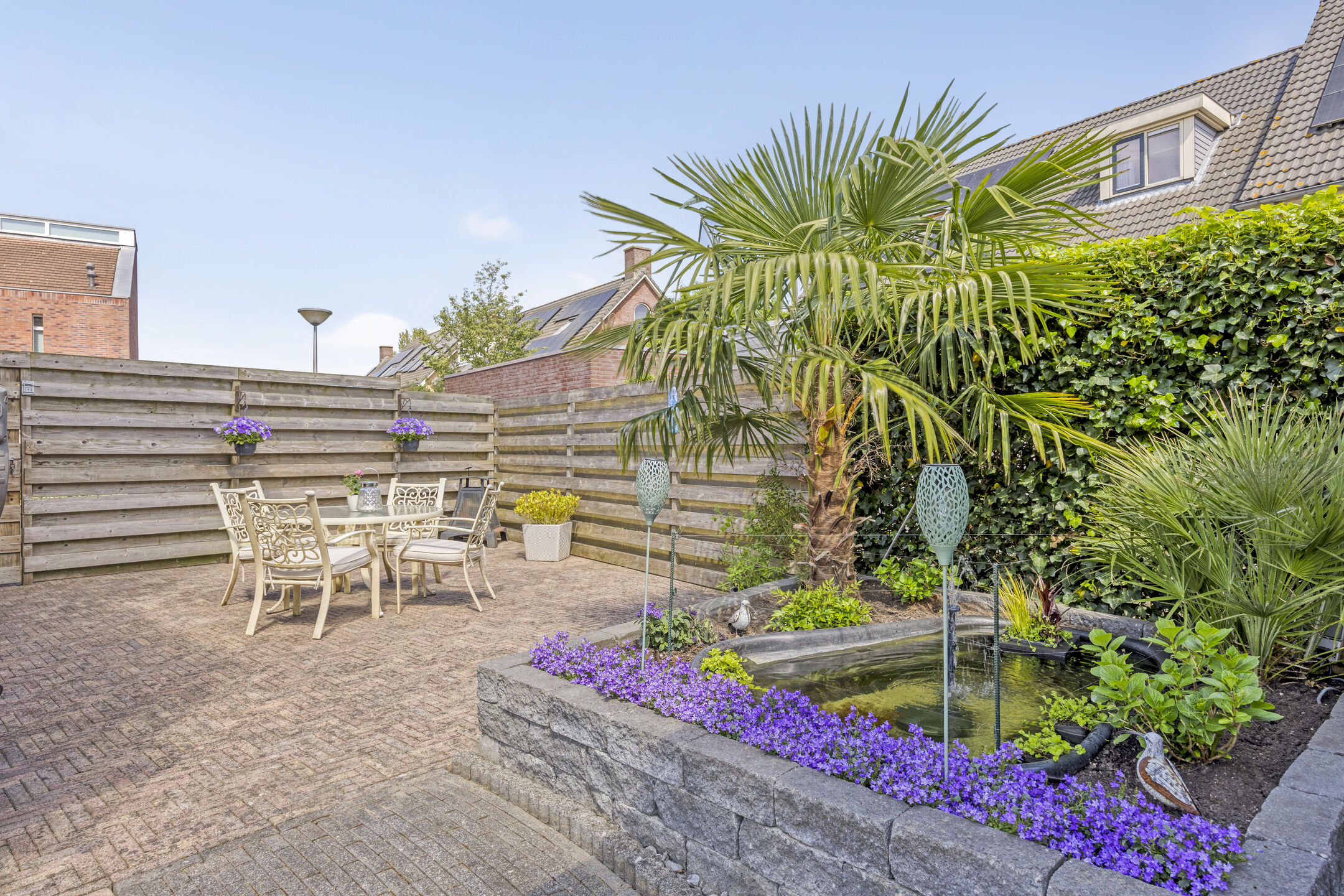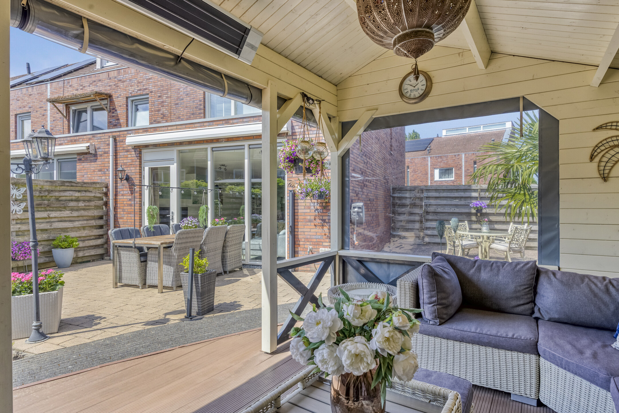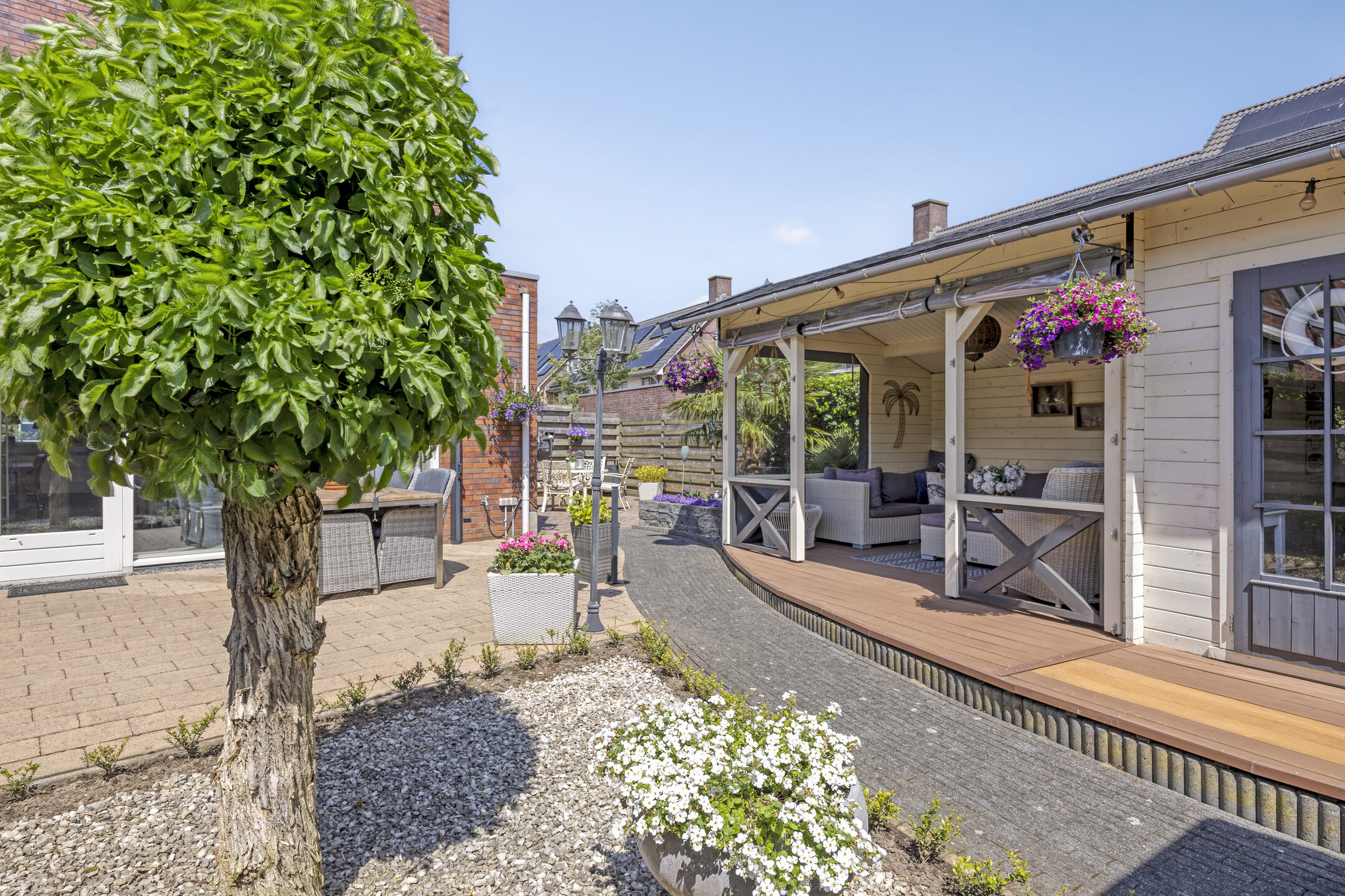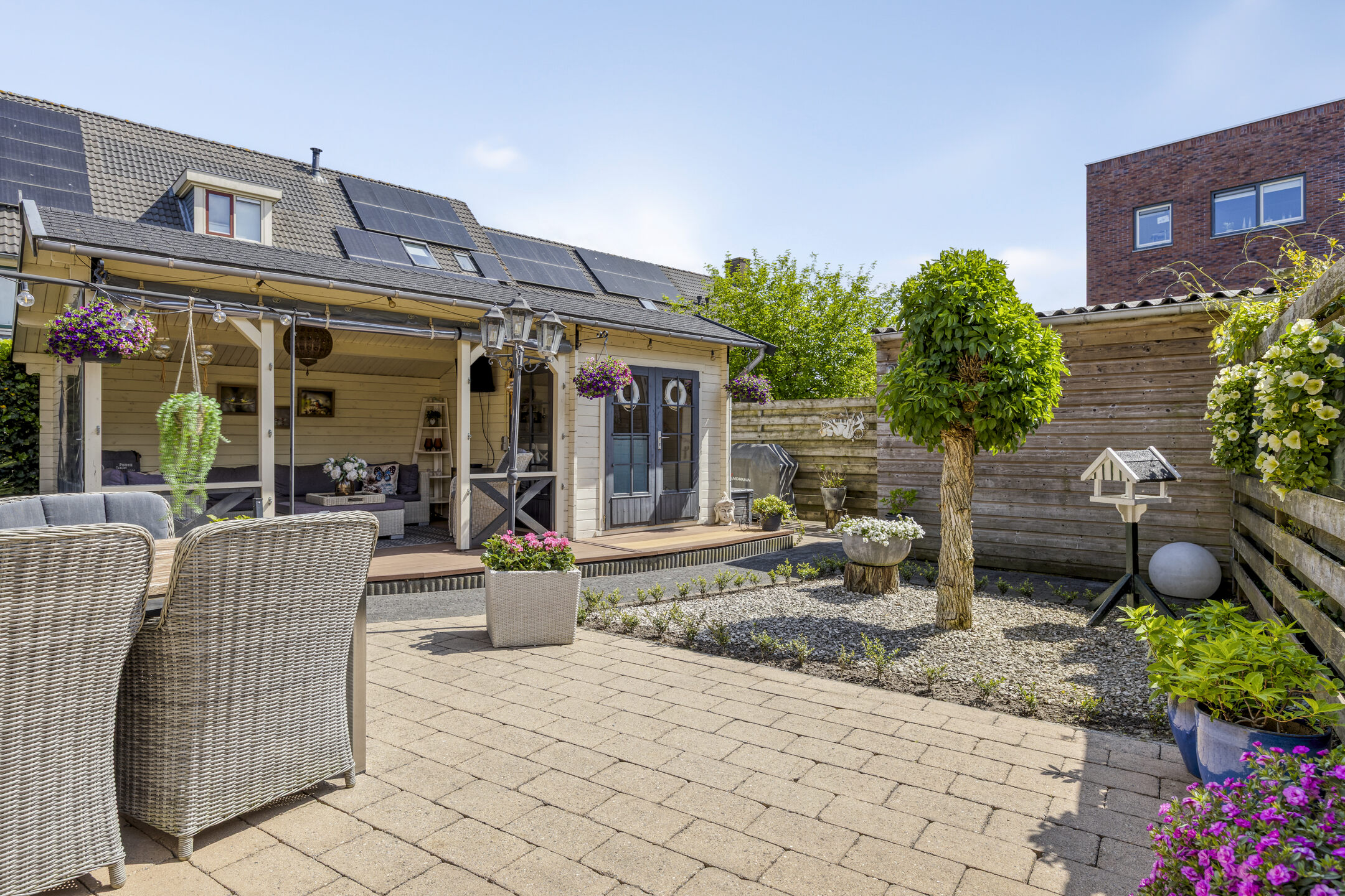 Fraai aangelegde achtertuin op het zuidwesten met terras aan de achtergevel voorzien van elektrisch zonnescherm met nieuw doek, sierbestrating, vijver, berging en sfeervolle houten overkapping met aangebouwde bar. In deze berging is een gezellige bar gemaakt. De tuin is achterom te bereiken via de voorzijde en het achterpad. Voortuin met parkeerruimte voor twee personenauto’s op eigen terrein.