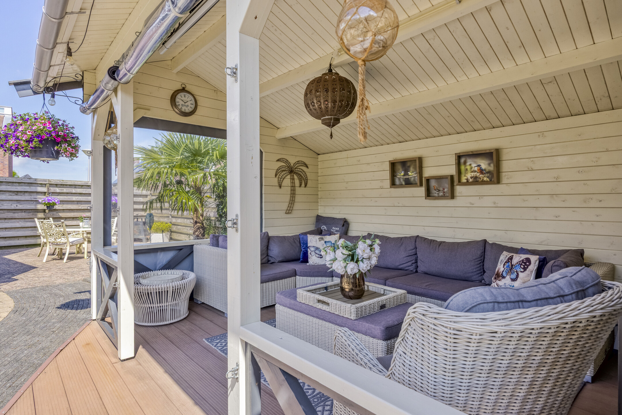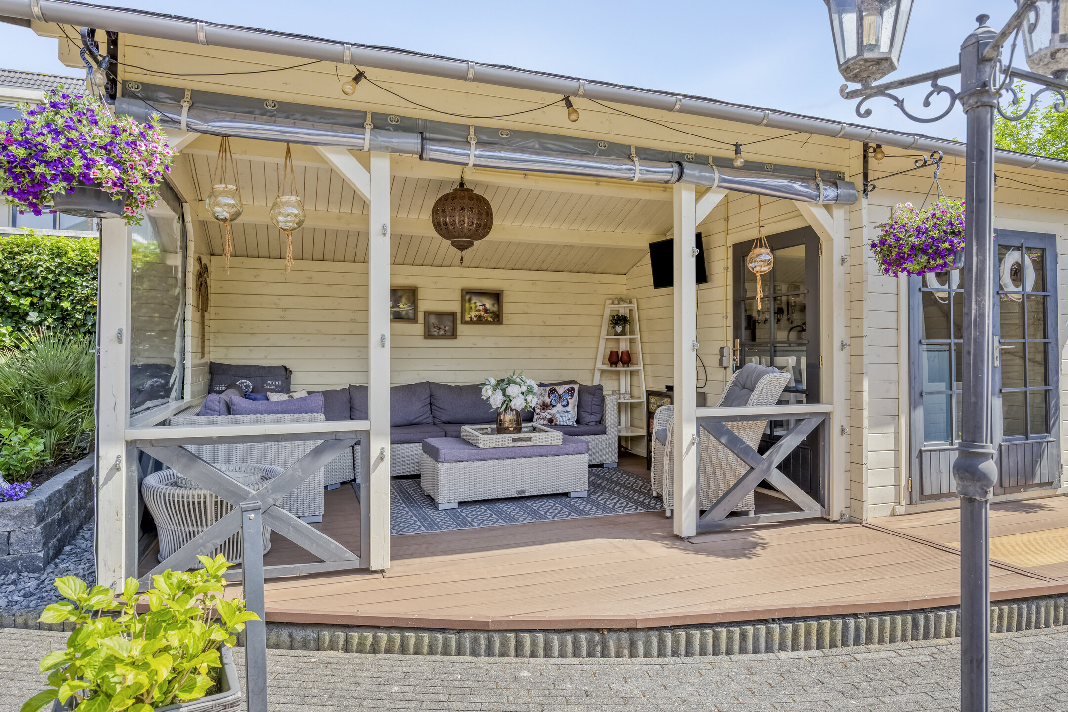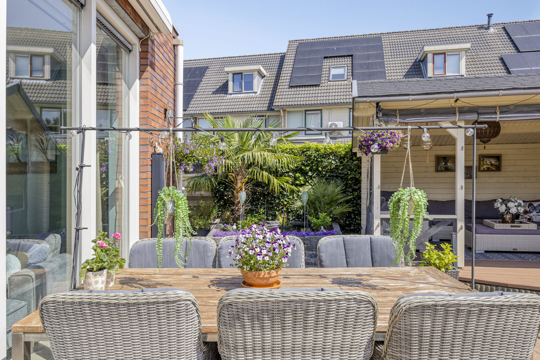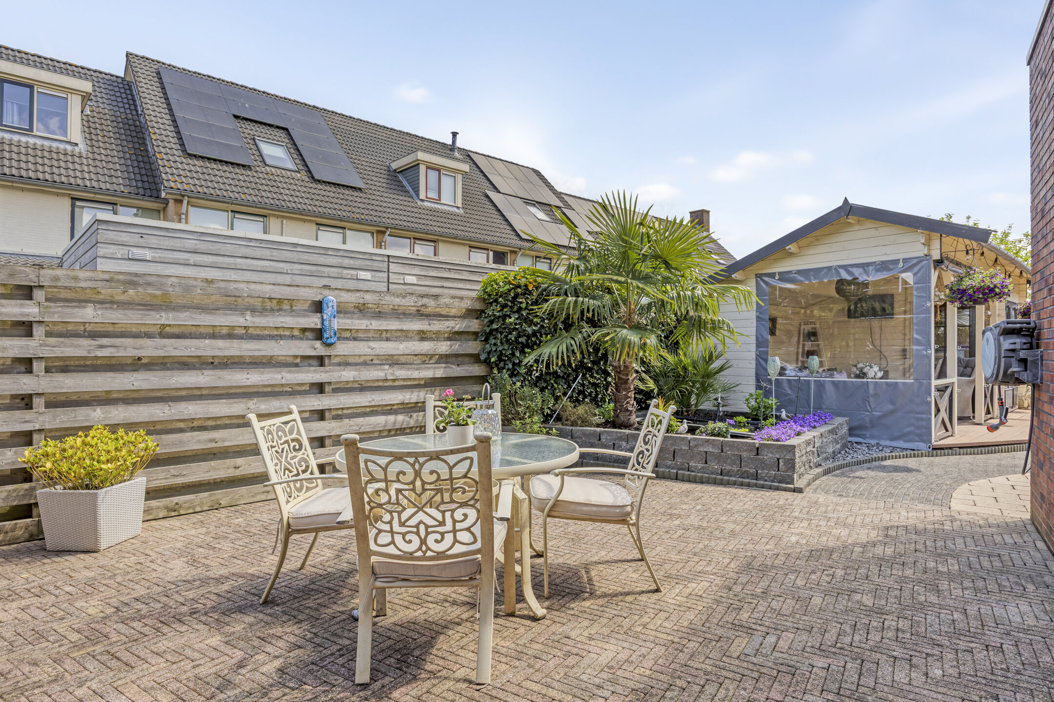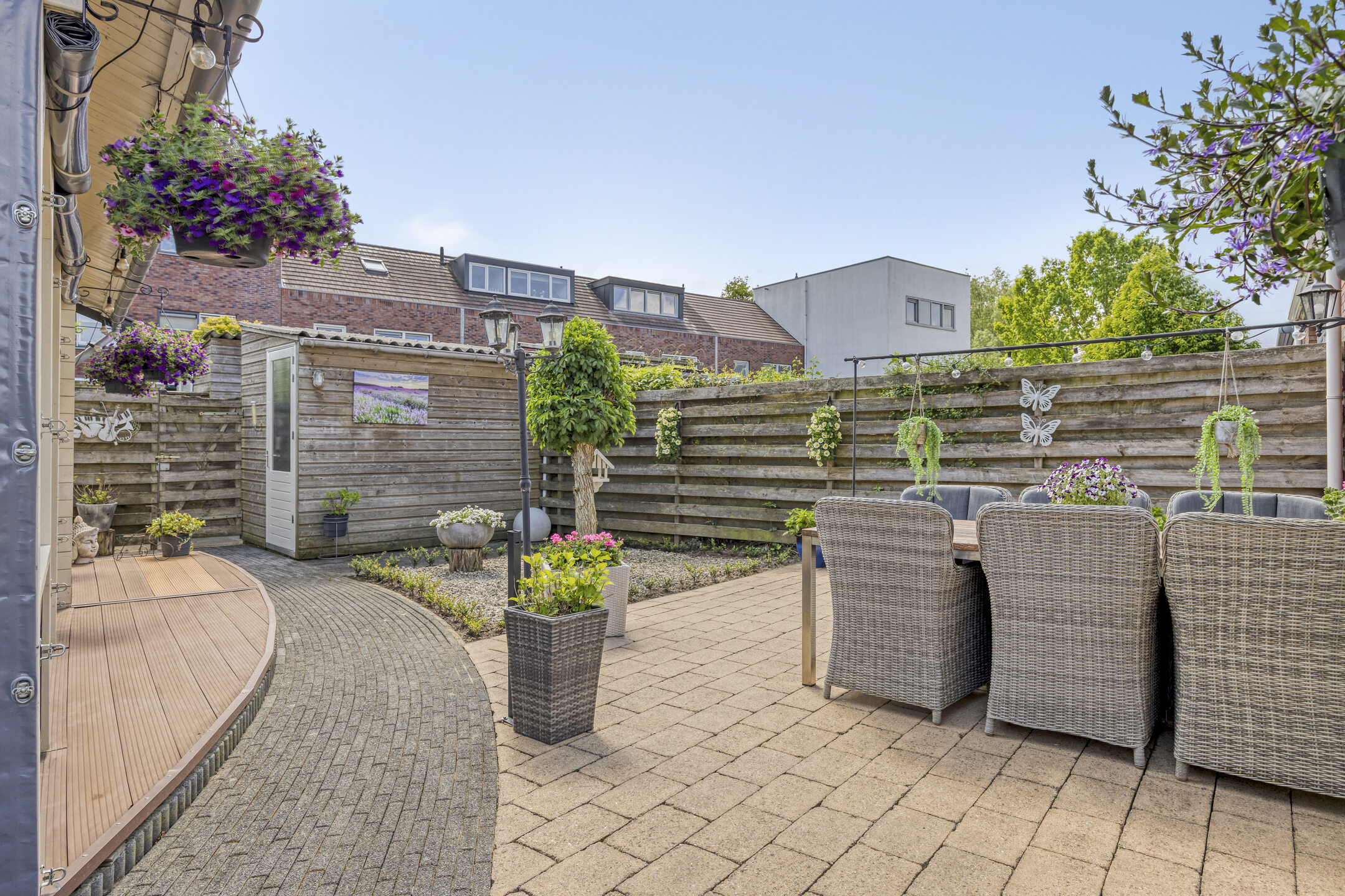 Fraai aangelegde achtertuin op het zuidwesten met terras aan de achtergevel voorzien van elektrisch zonnescherm met nieuw doek, sierbestrating, vijver, berging en sfeervolle houten overkapping met aangebouwde bar. In deze berging is een gezellige bar gemaakt. De tuin is achterom te bereiken via de voorzijde en het achterpad. Voortuin met parkeerruimte voor twee personenauto’s op eigen terrein.