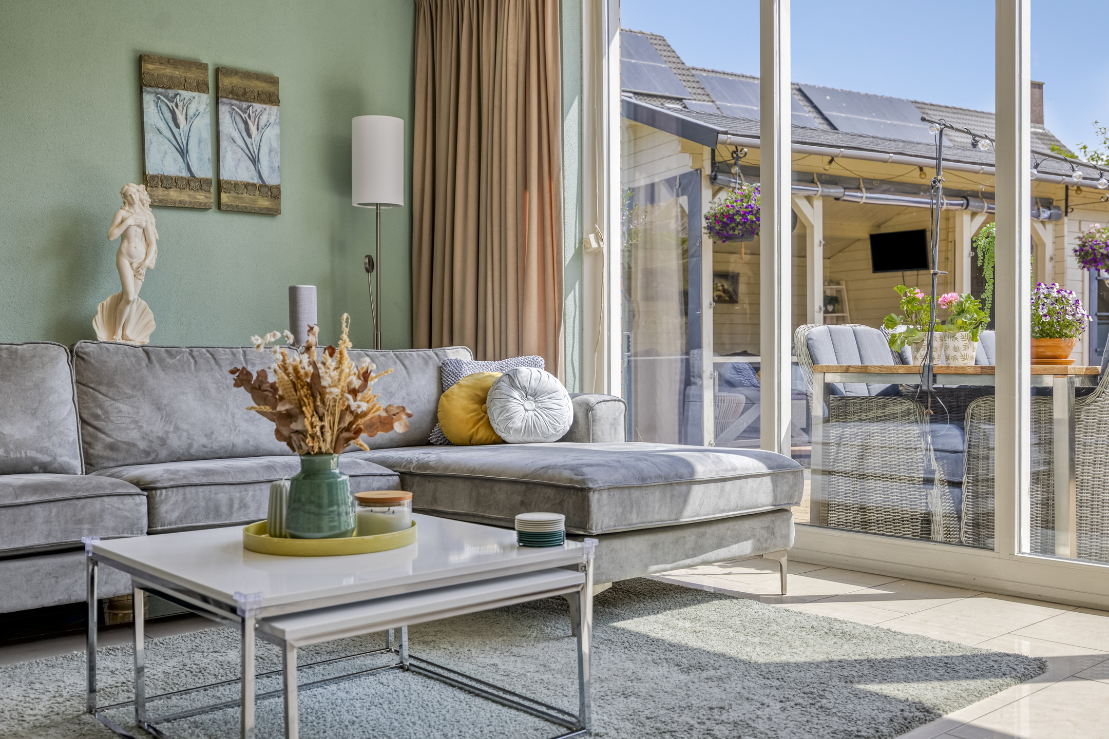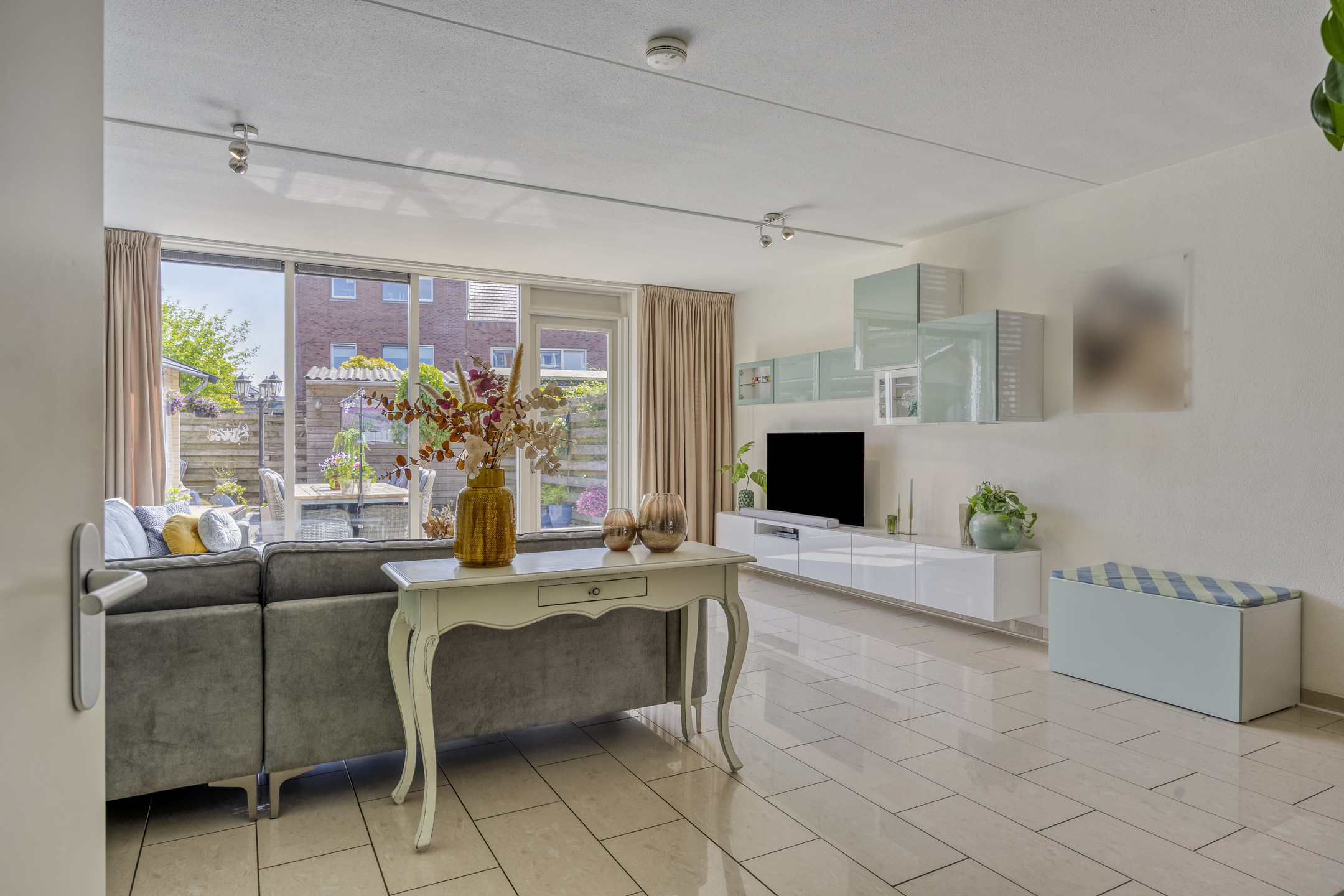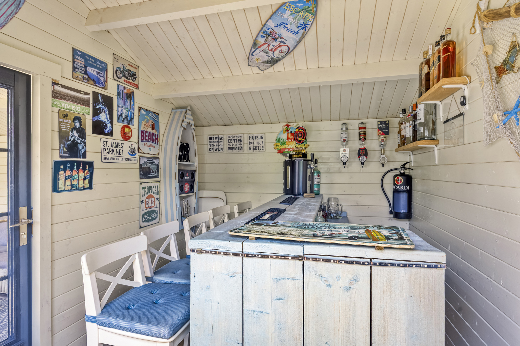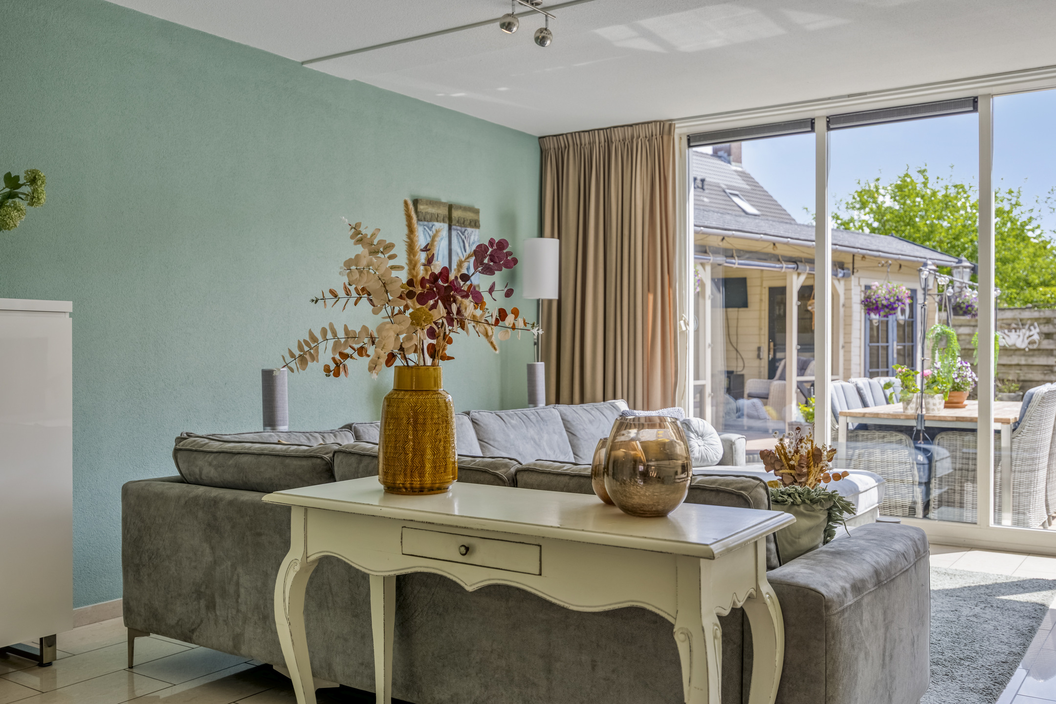 Fraai aangelegde achtertuin op het zuidwesten met terras aan de achtergevel voorzien van elektrisch zonnescherm met nieuw doek, sierbestrating, vijver, berging en sfeervolle houten overkapping met aangebouwde bar. In deze berging is een gezellige bar gemaakt. De tuin is achterom te bereiken via de voorzijde en het achterpad. Voortuin met parkeerruimte voor twee personenauto’s op eigen terrein.