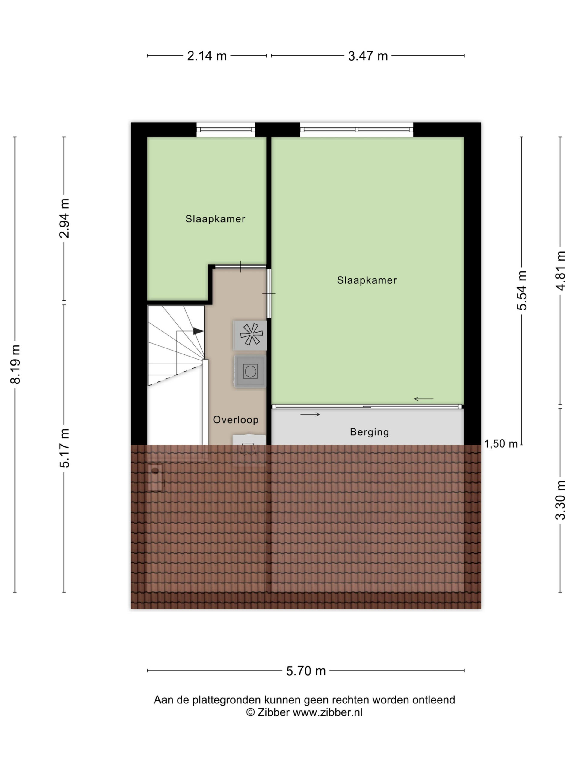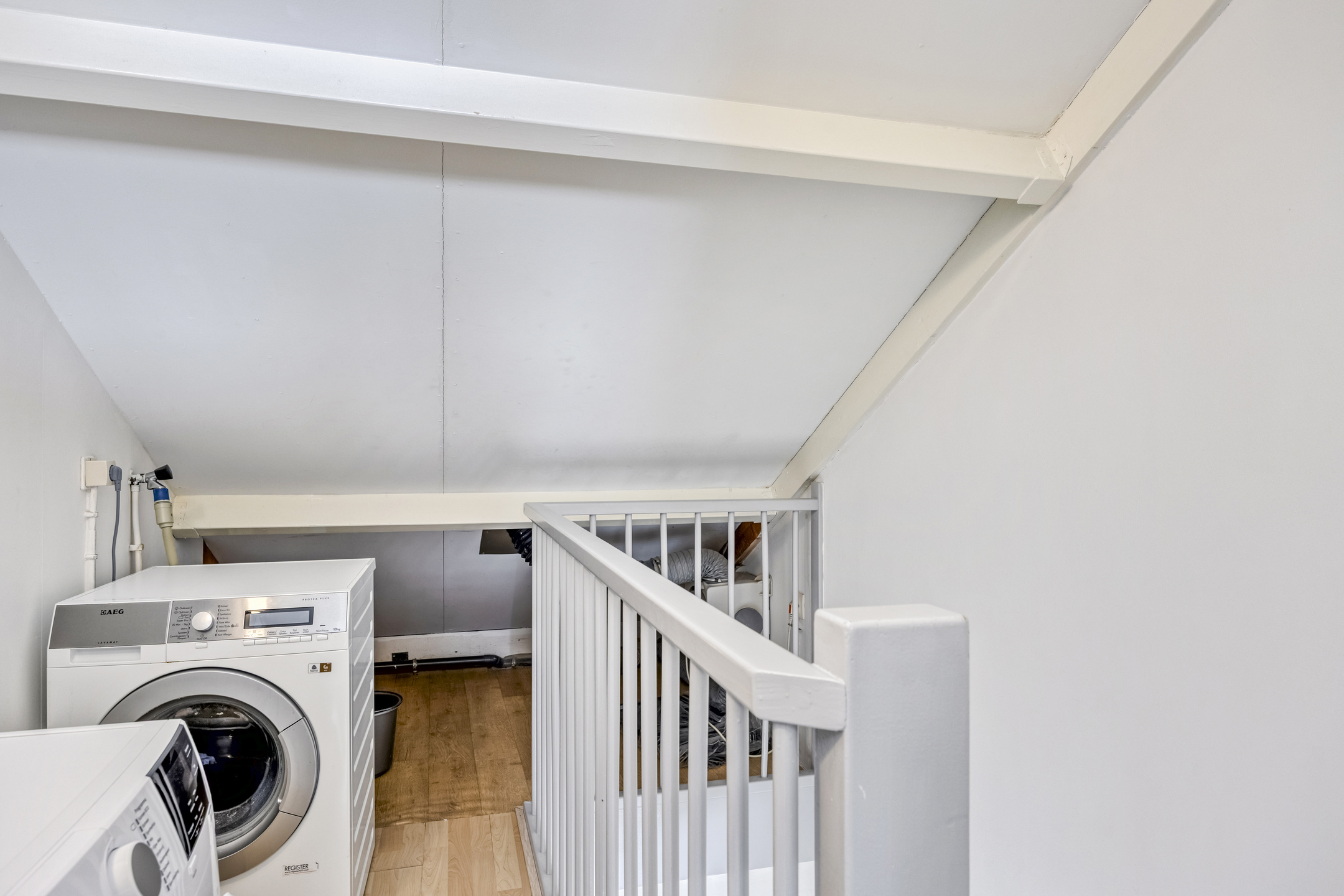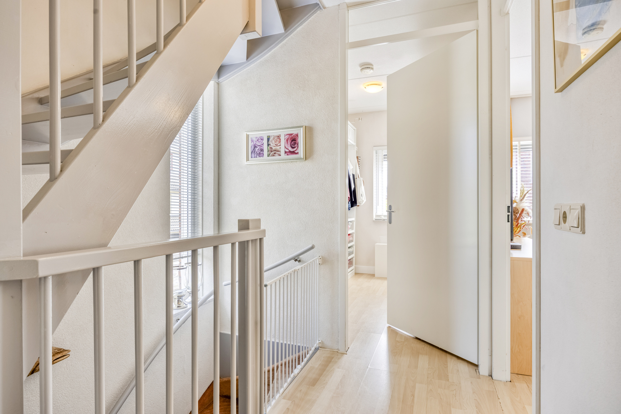 2e Verdieping: overloop met cv-opstelplaats en wasmachine-/drogeraansluiting. Twee (slaap-)kamers ter grootte van circa 5,5 m² en 16,5 m². De grote kamer beschikt over een vaste kastenwand. De kleine kamer is in gebruik als kantoor/werkkamer.