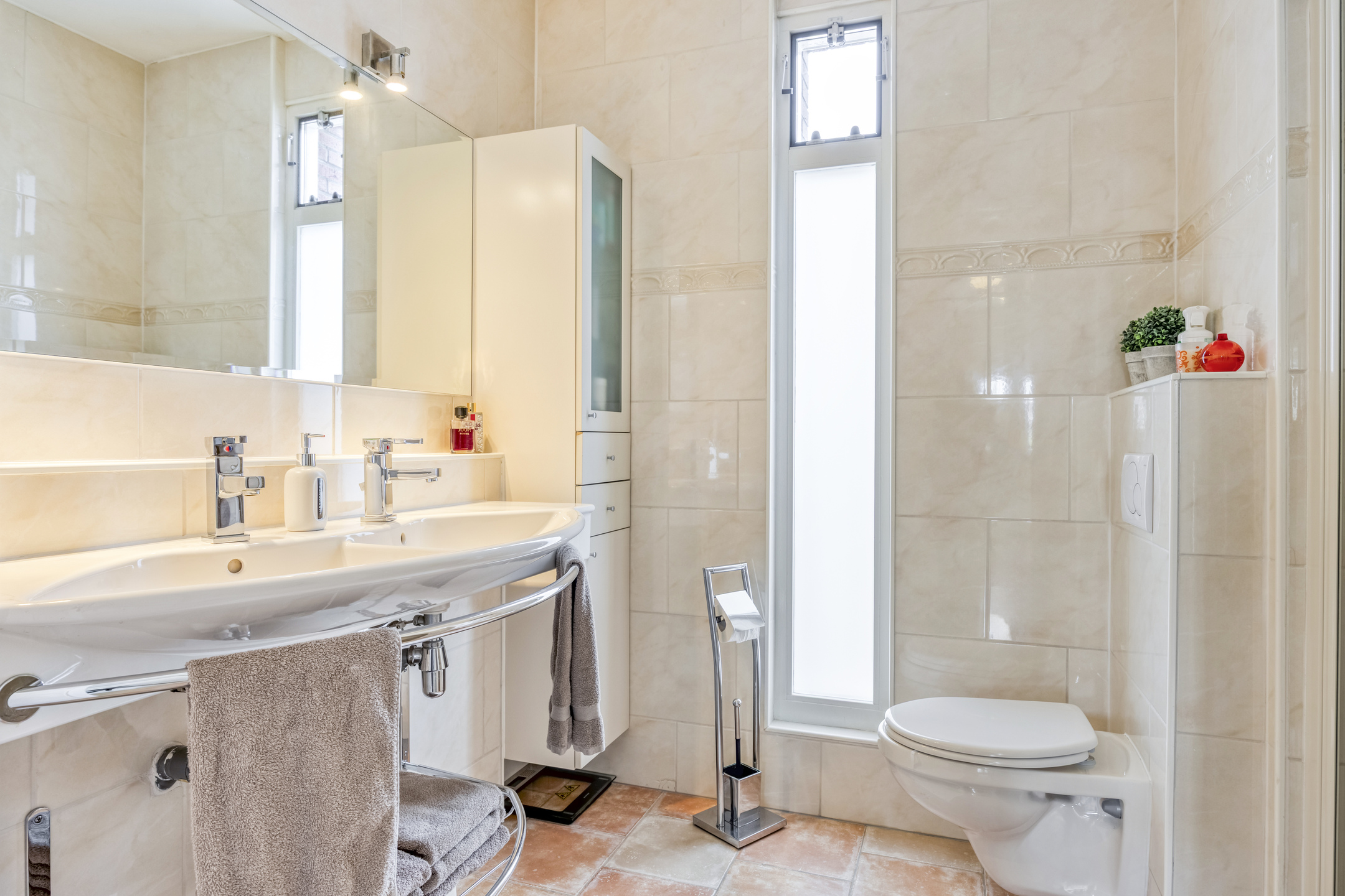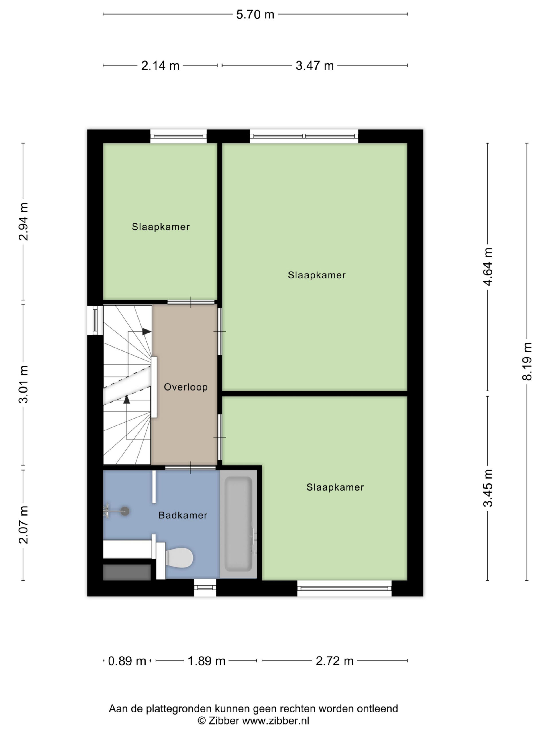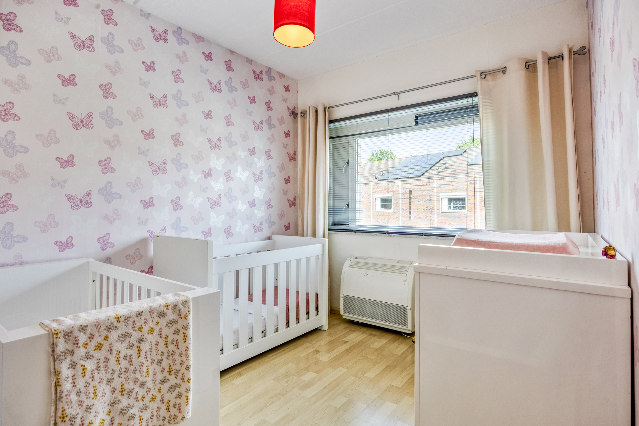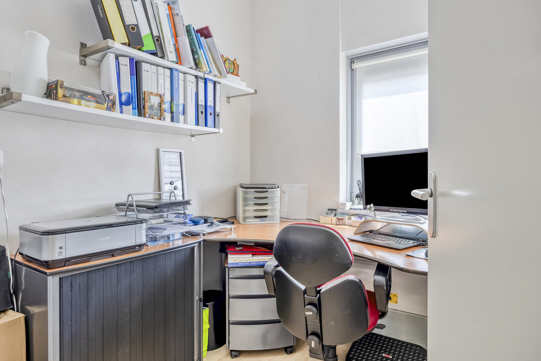 2e Verdieping: overloop met cv-opstelplaats en wasmachine-/drogeraansluiting. Twee (slaap-)kamers ter grootte van circa 5,5 m² en 16,5 m². De grote kamer beschikt over een vaste kastenwand. De kleine kamer is in gebruik als kantoor/werkkamer.