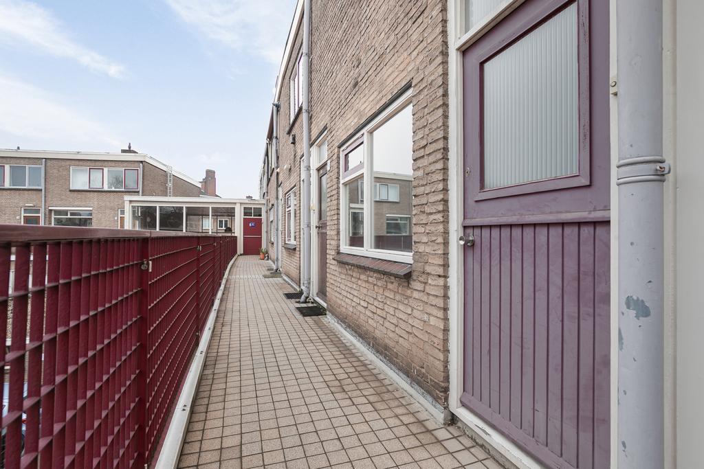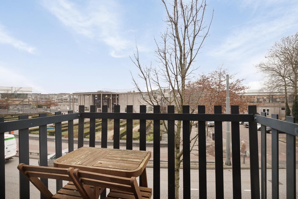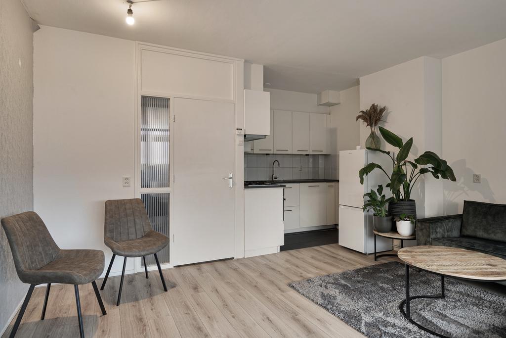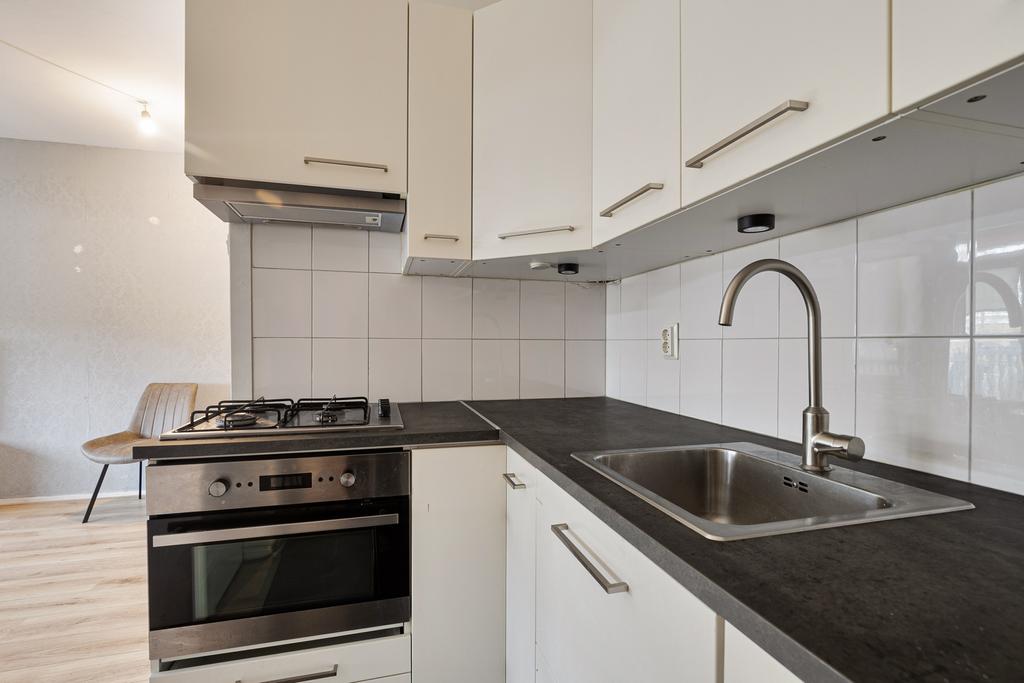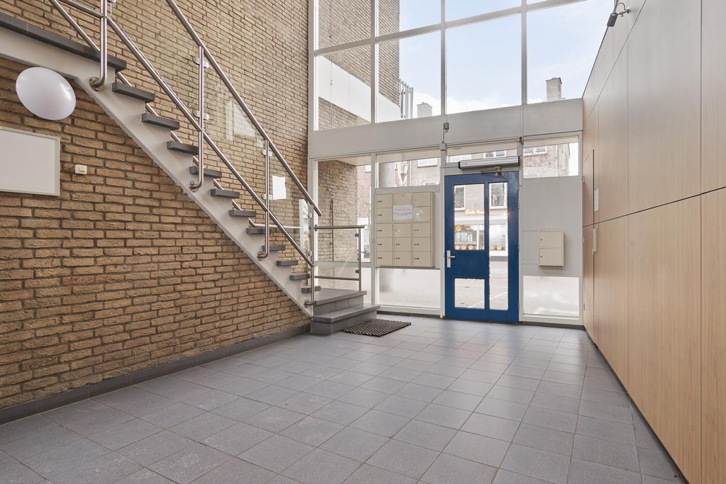 1e Verdieping: entree vanaf de galerij, hal met toegang tot de meterkast, inpandige berging met aansluiting voor de wasmachine en een toilet met hangcloset. De woonkamer is voorzien van een laminaatvloer en biedt toegang tot het balkon met uitzicht het station. De open keuken is uitgerust met een 4-pits gasfornuis, afzuigkap, vaatwasmachine en combi-oven.