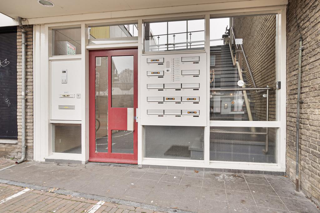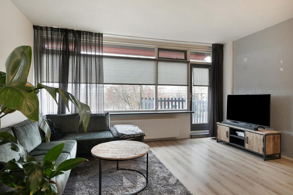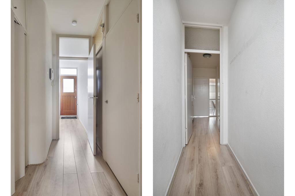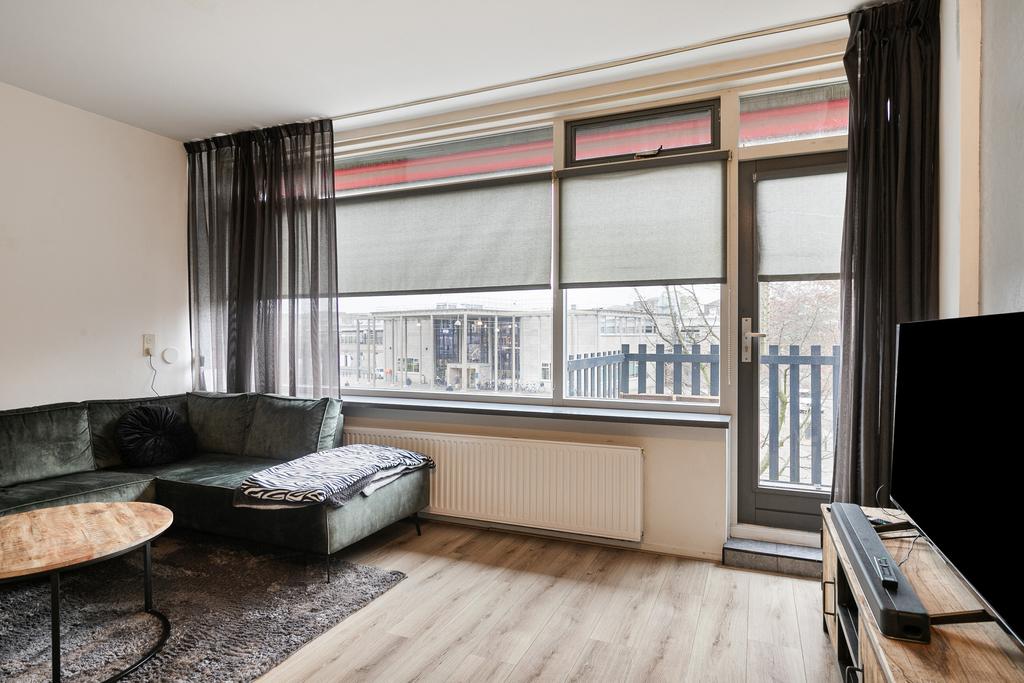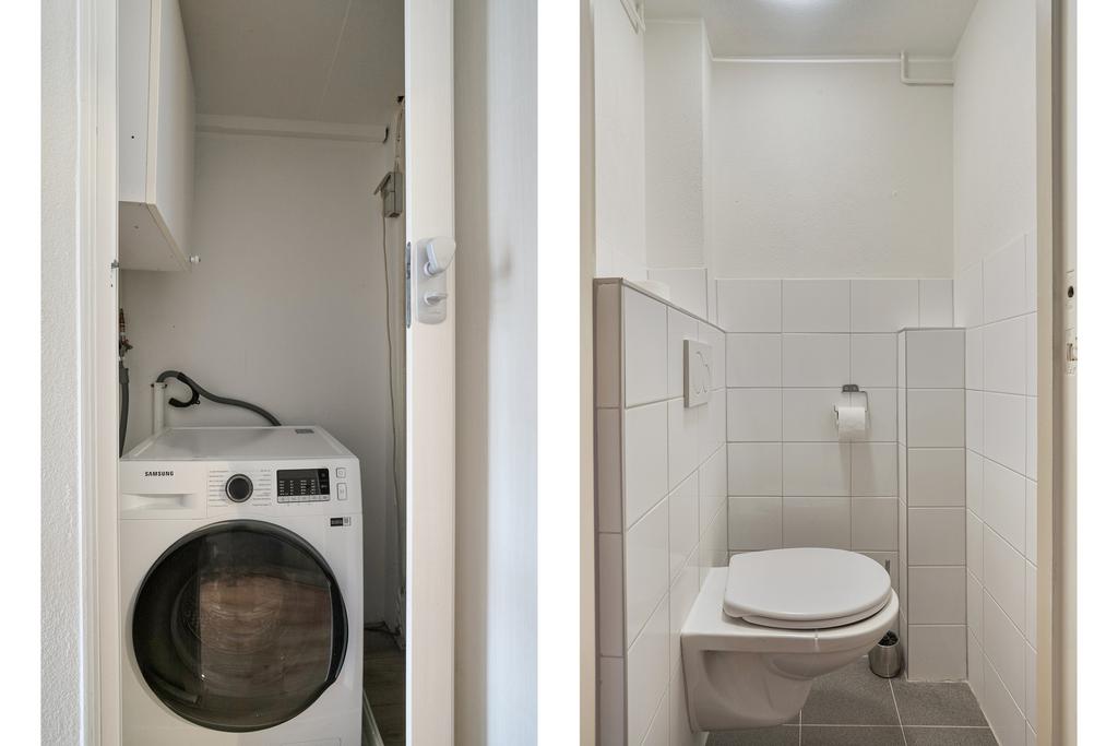 1e Verdieping: entree vanaf de galerij, hal met toegang tot de meterkast, inpandige berging met aansluiting voor de wasmachine en een toilet met hangcloset. De woonkamer is voorzien van een laminaatvloer en biedt toegang tot het balkon met uitzicht het station. De open keuken is uitgerust met een 4-pits gasfornuis, afzuigkap, vaatwasmachine en combi-oven.