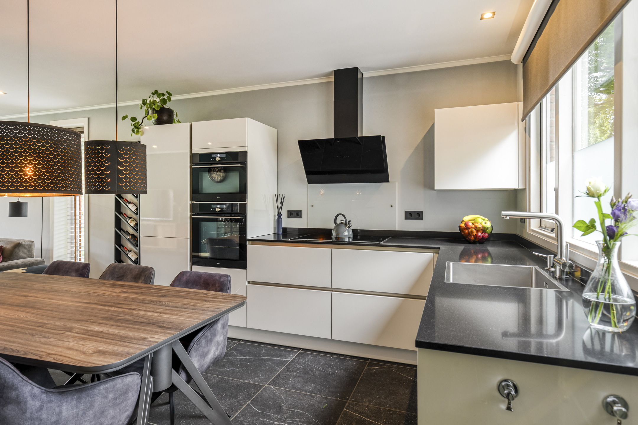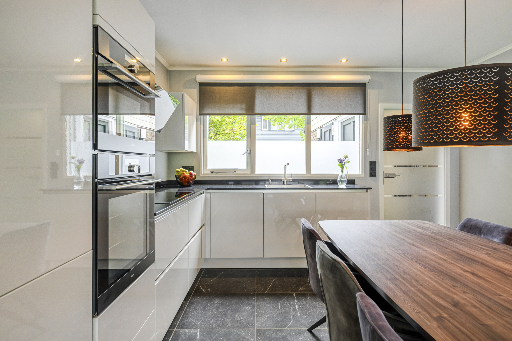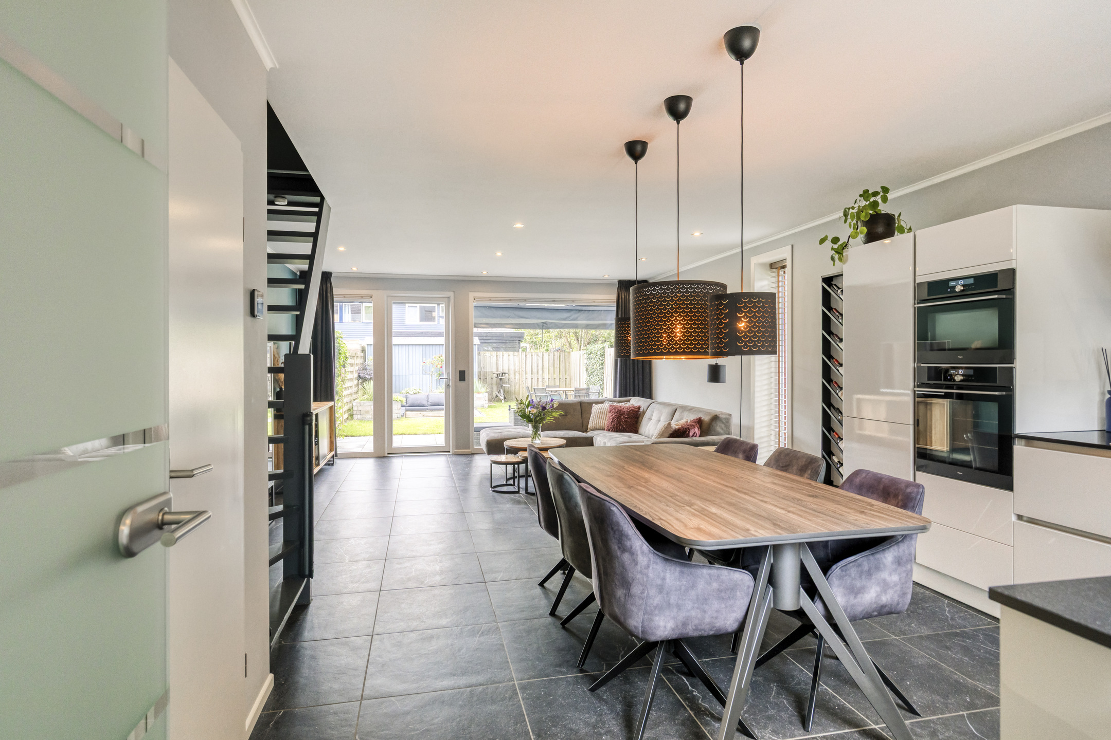 Begane grond: entree, hal met toegang tot de inpandige berging/bijkeuken en toilet voorzien van wandcloset en fonteintje. Ruime tuingerichte woonkamer voorzien van luchtwarmtepomp, gloednieuwe (kunststof) achterpui en trapopgang naar de 1e verdieping. Hoogglans keuken aan de voorzijde met ruimte voor een grote eettafel, voorzien van inductiekookplaat, afzuigkap, oven, combi-oven, koel-vriescombinatie en vaatwasser.