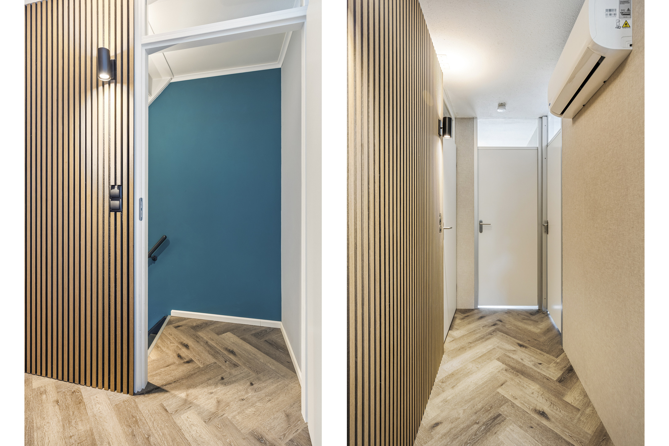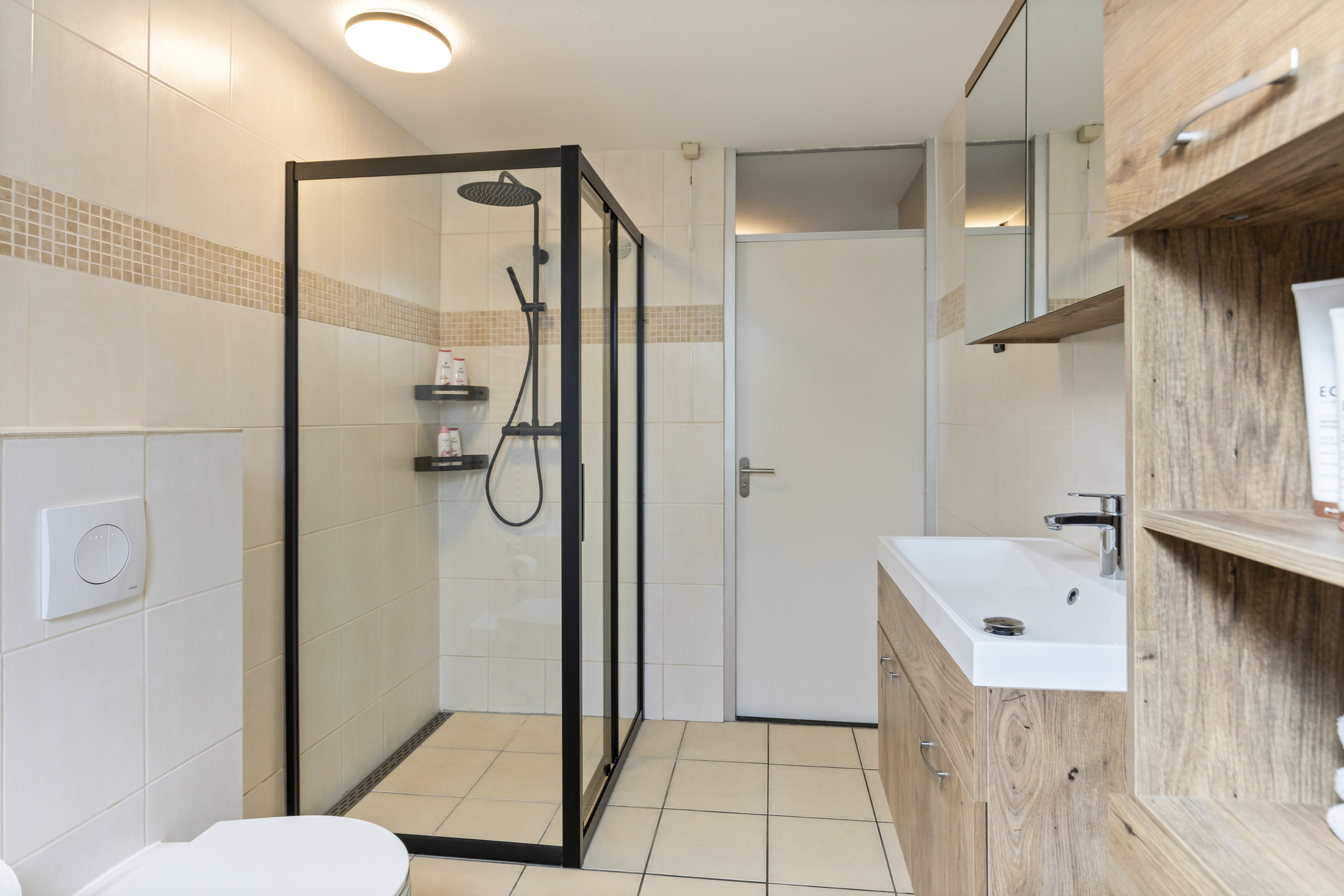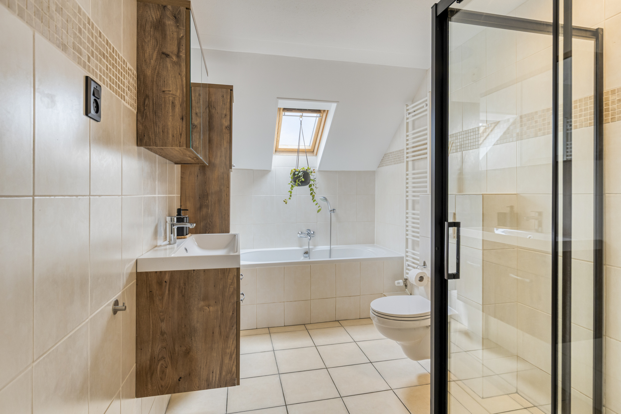 1e Verdieping: overloop met luchtwarmtepomp. Drie strak afgewerkte slaapkamers ter grootte van circa 6 m² en twee van 12 m², allen voorzien van PVC-vloer. Vergrootte badkamer (boven de berging) met ligbad, wandcloset, douche en wastafelmeubel.