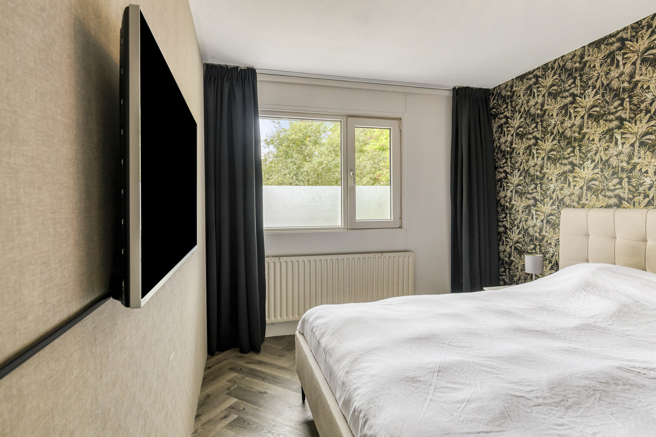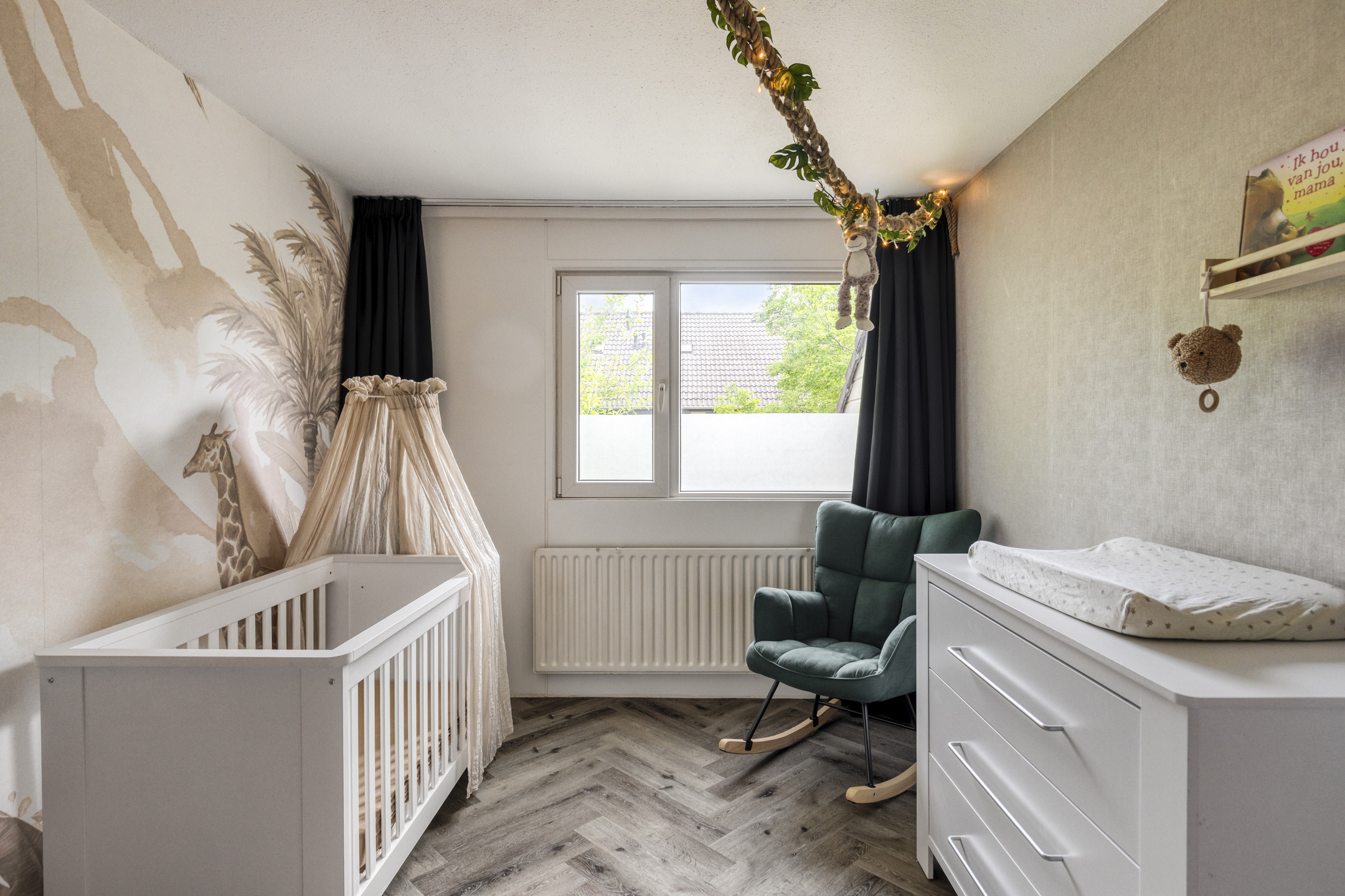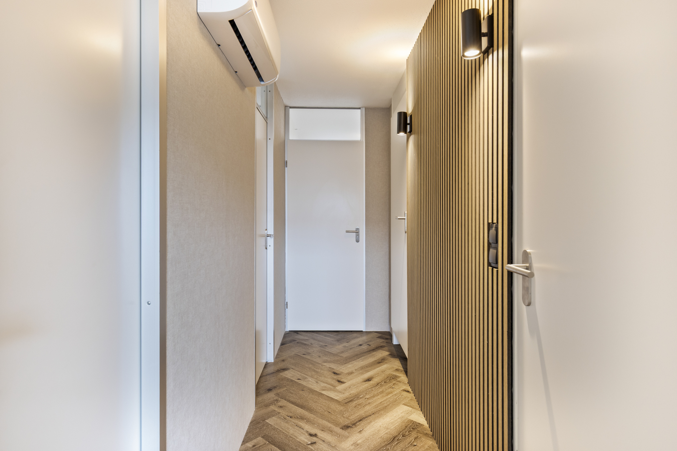 1e Verdieping: overloop met luchtwarmtepomp. Drie strak afgewerkte slaapkamers ter grootte van circa 6 m² en twee van 12 m², allen voorzien van PVC-vloer. Vergrootte badkamer (boven de berging) met ligbad, wandcloset, douche en wastafelmeubel.