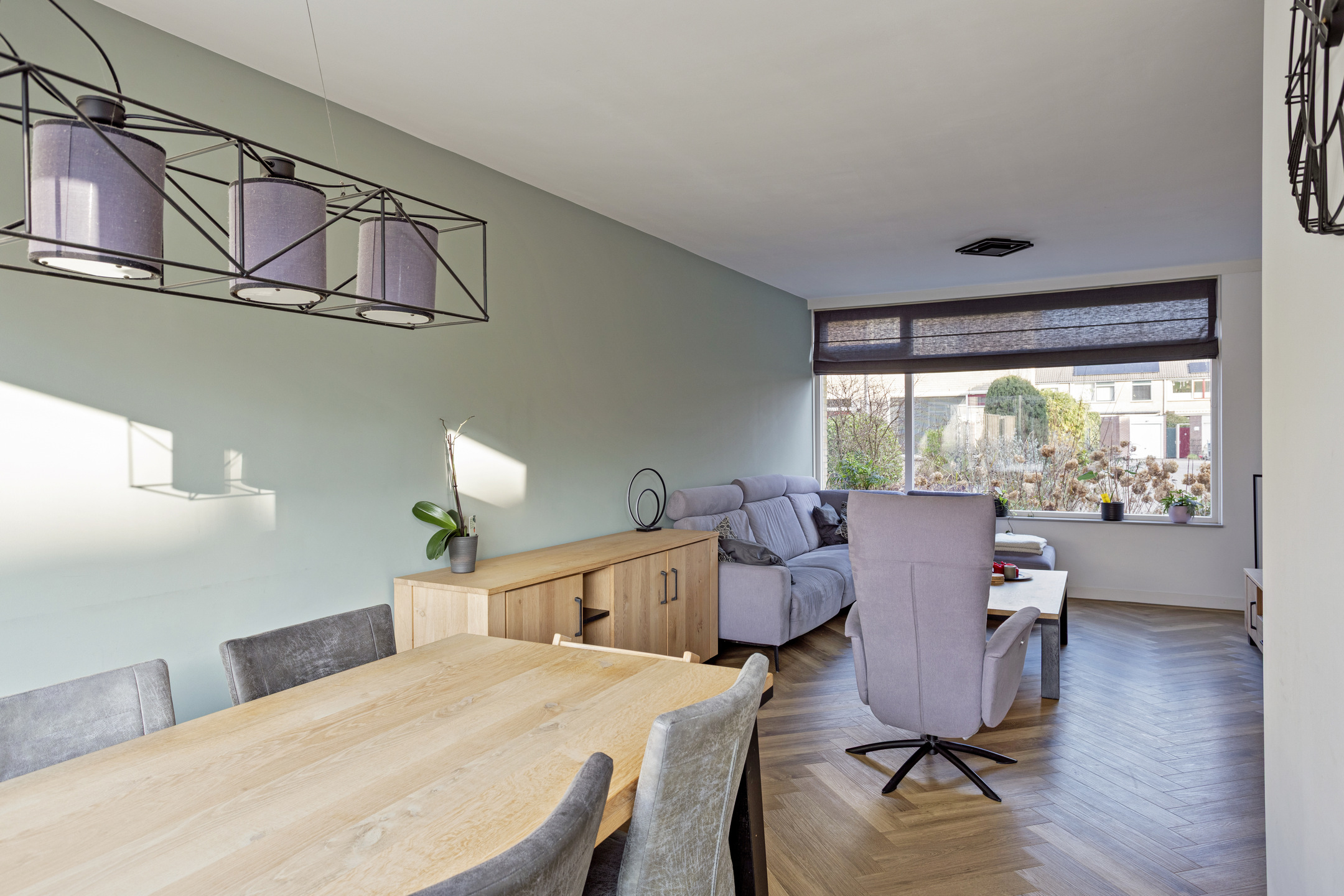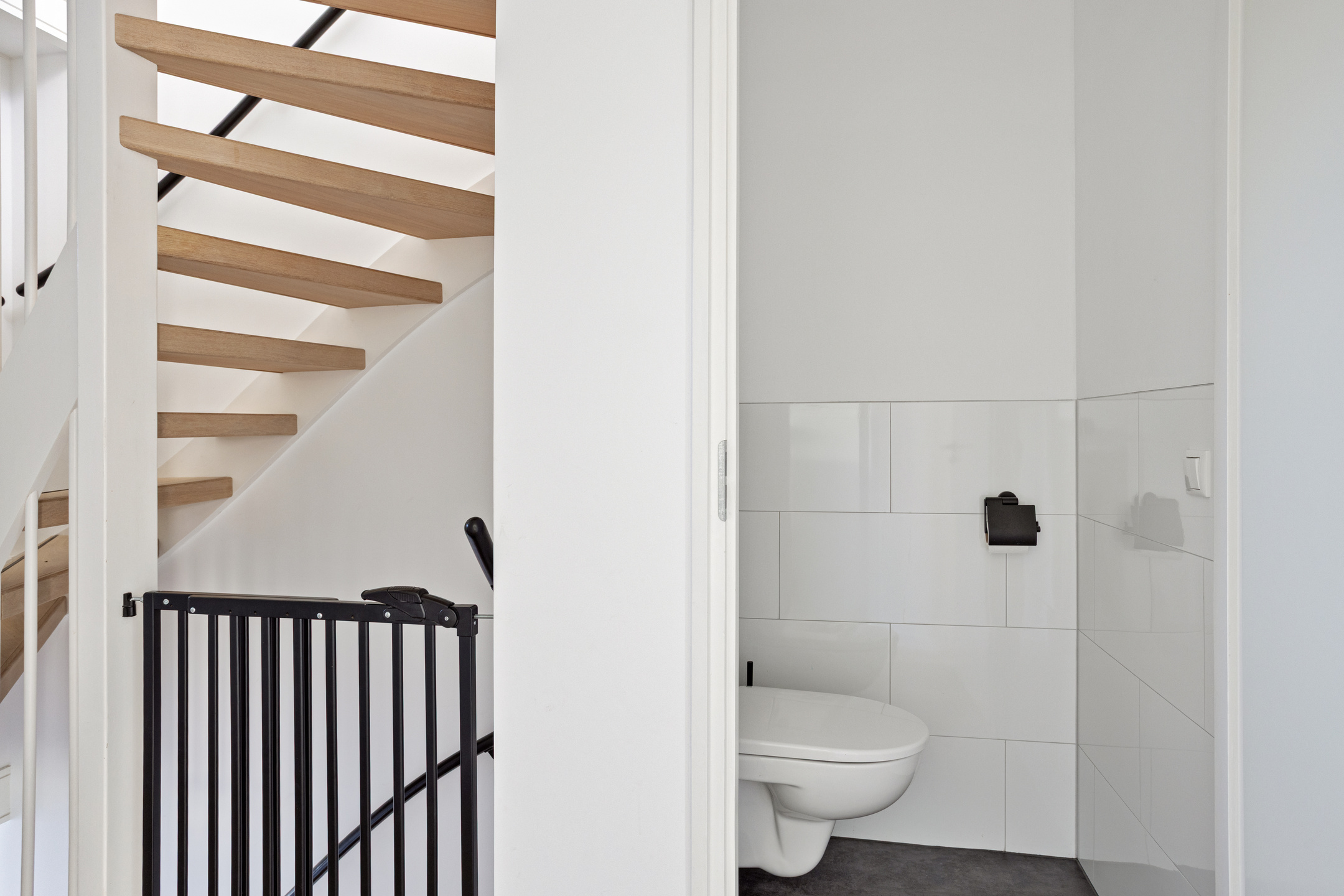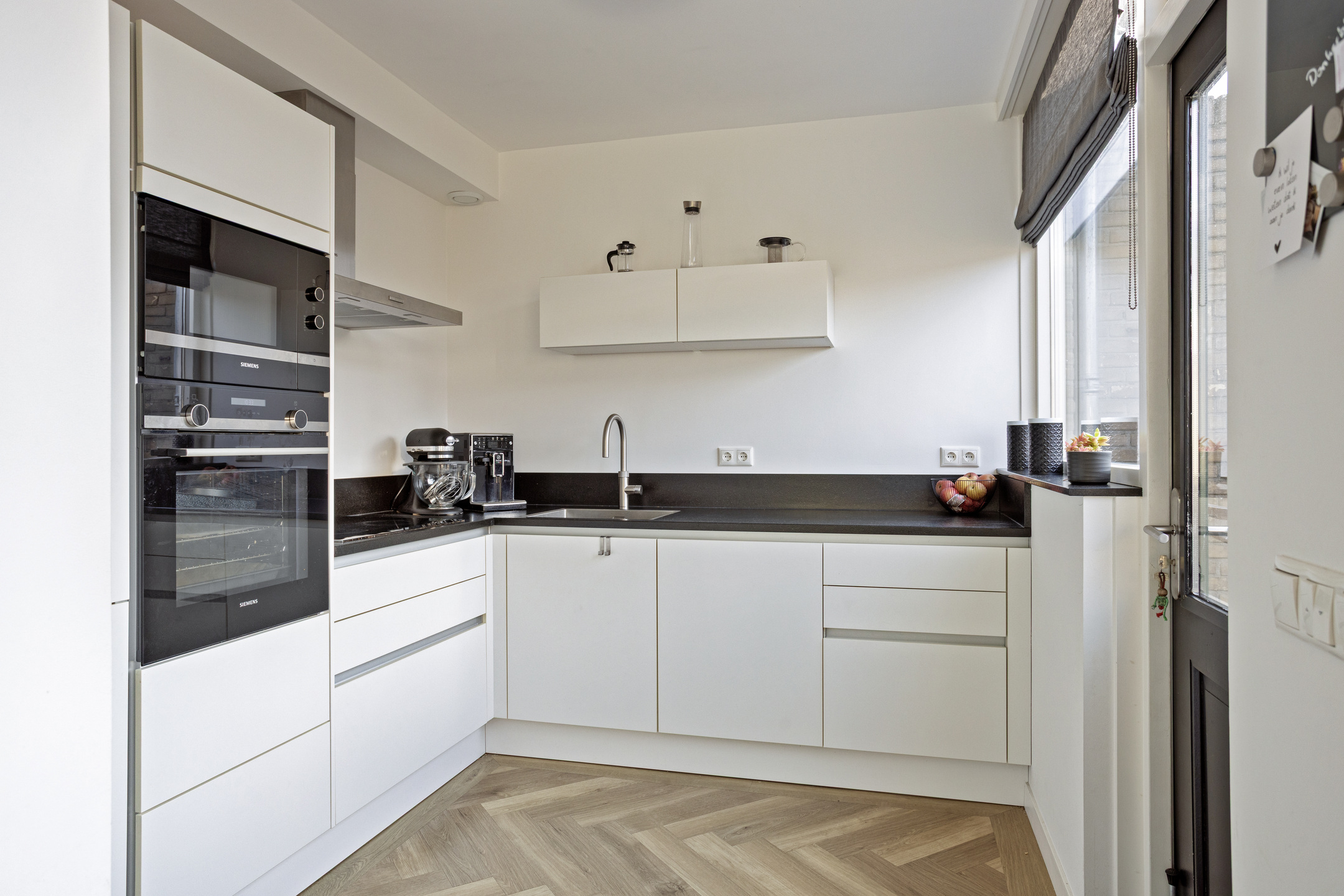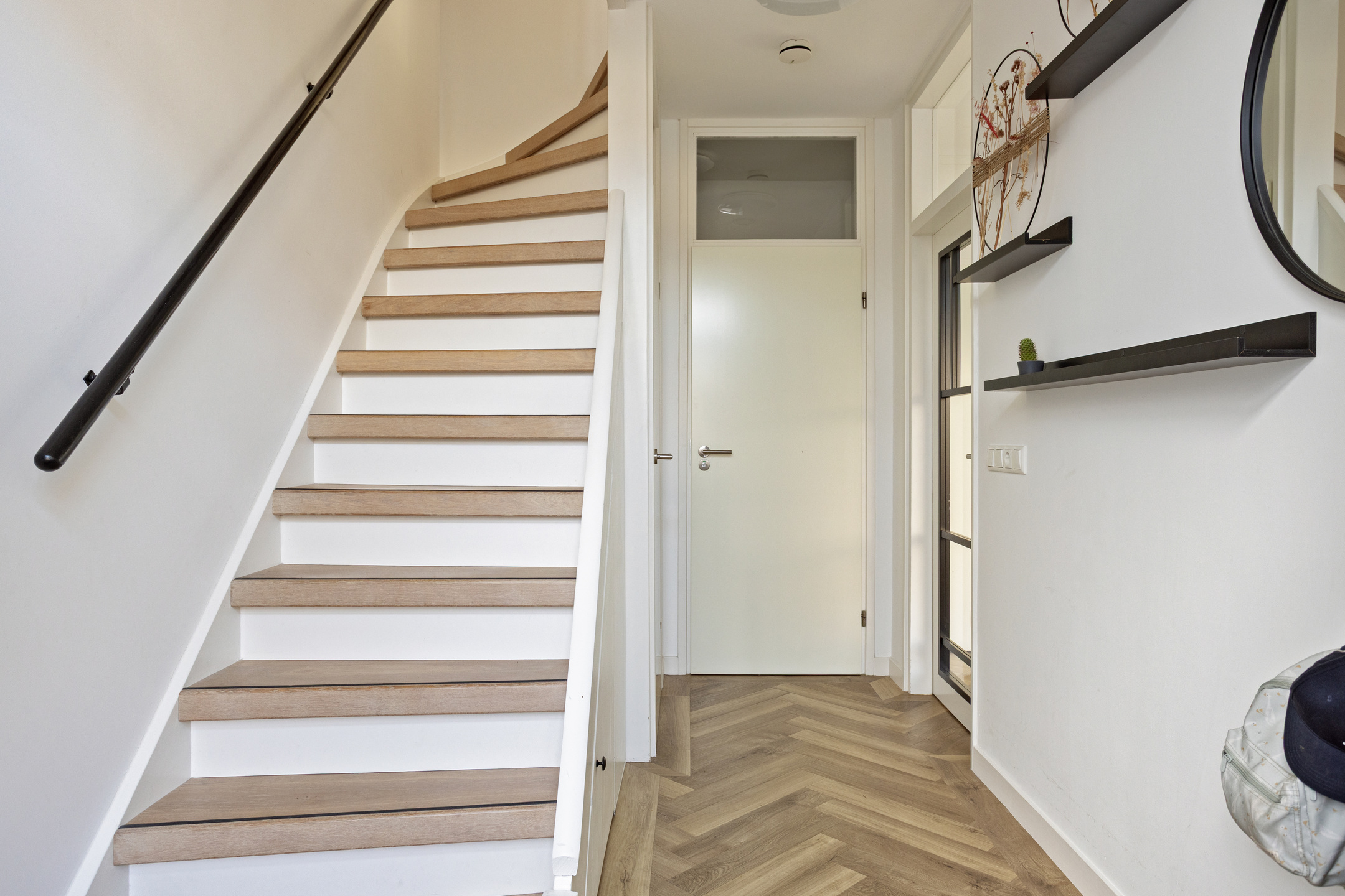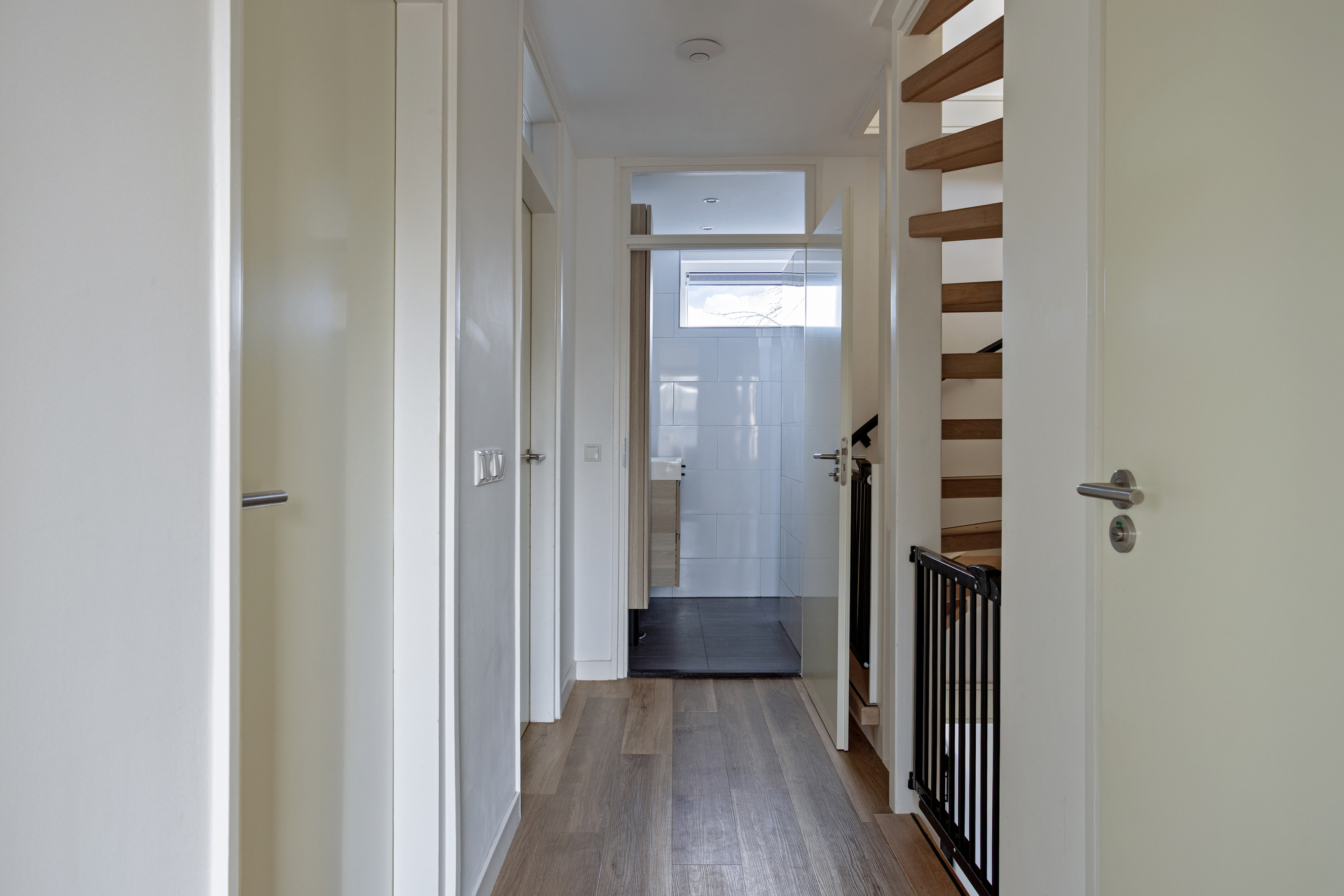 Begane grond: entree, hal met meterkast, trapkast, trapopgang naar de 1e verdieping en toilet voorzien van wandcloset en fonteintje. Lichte doorzonwoonkamer voorzien van pvc-visgraatvloer en een luxe half open keuken met tuindeur, voorzien van koelkast, vriezer, magnetron, oven, inductiekookplaat, afzuigkap, vaatwasser en Quooker met bruiswaterfunctie.