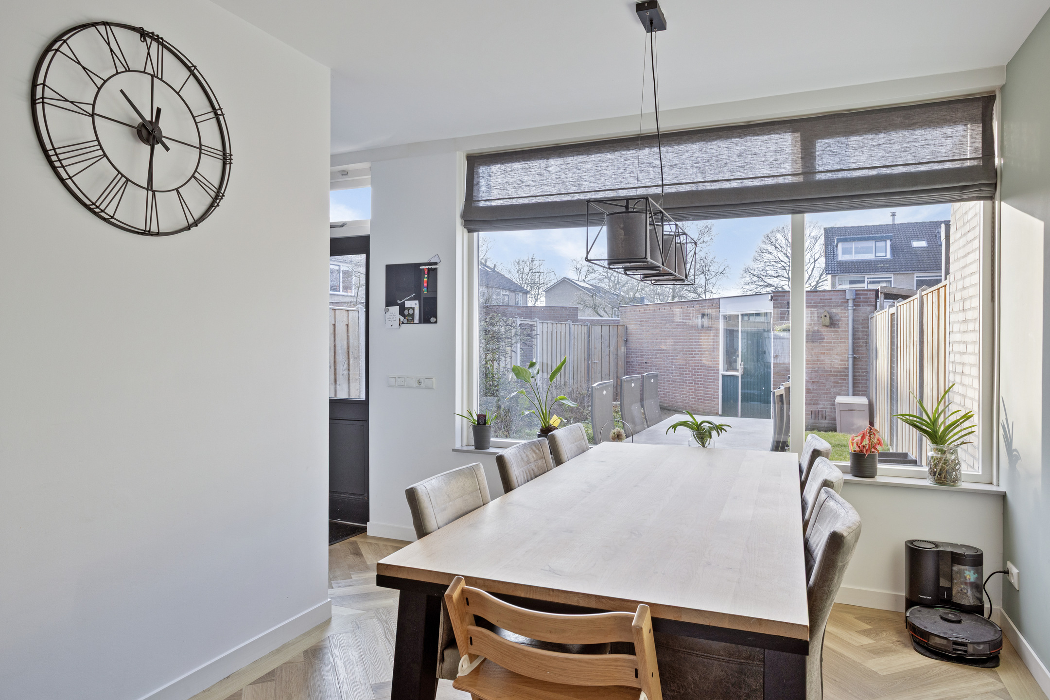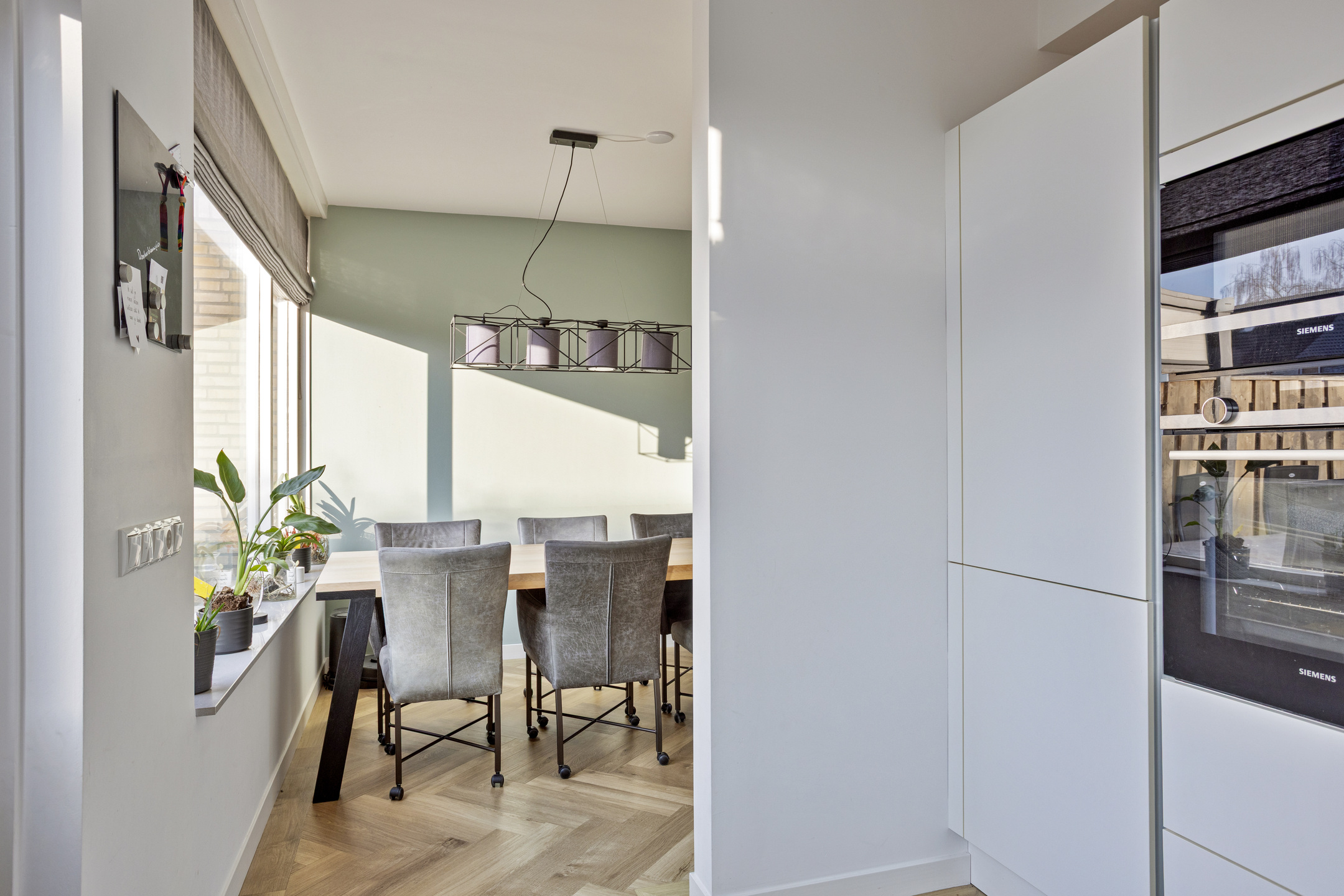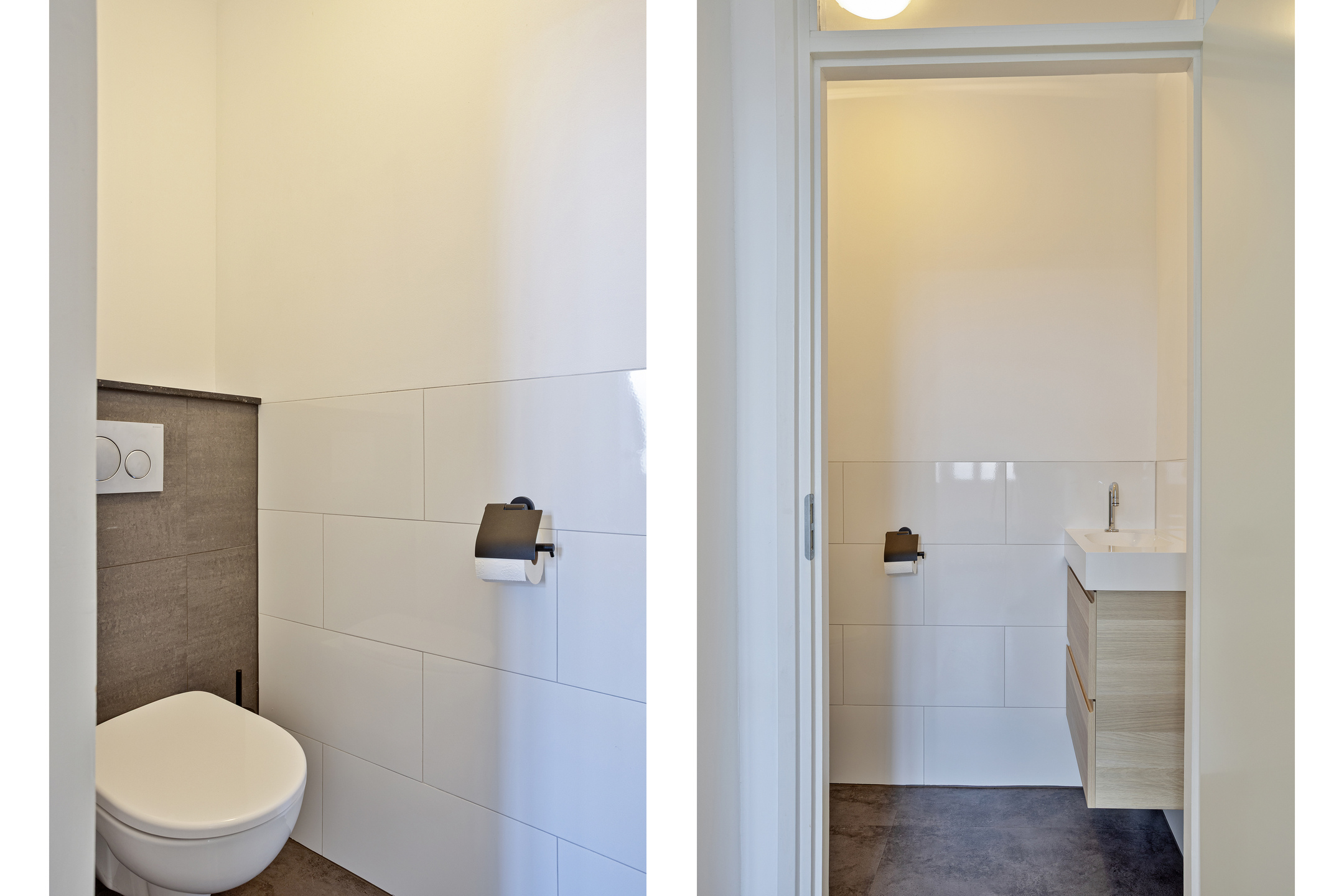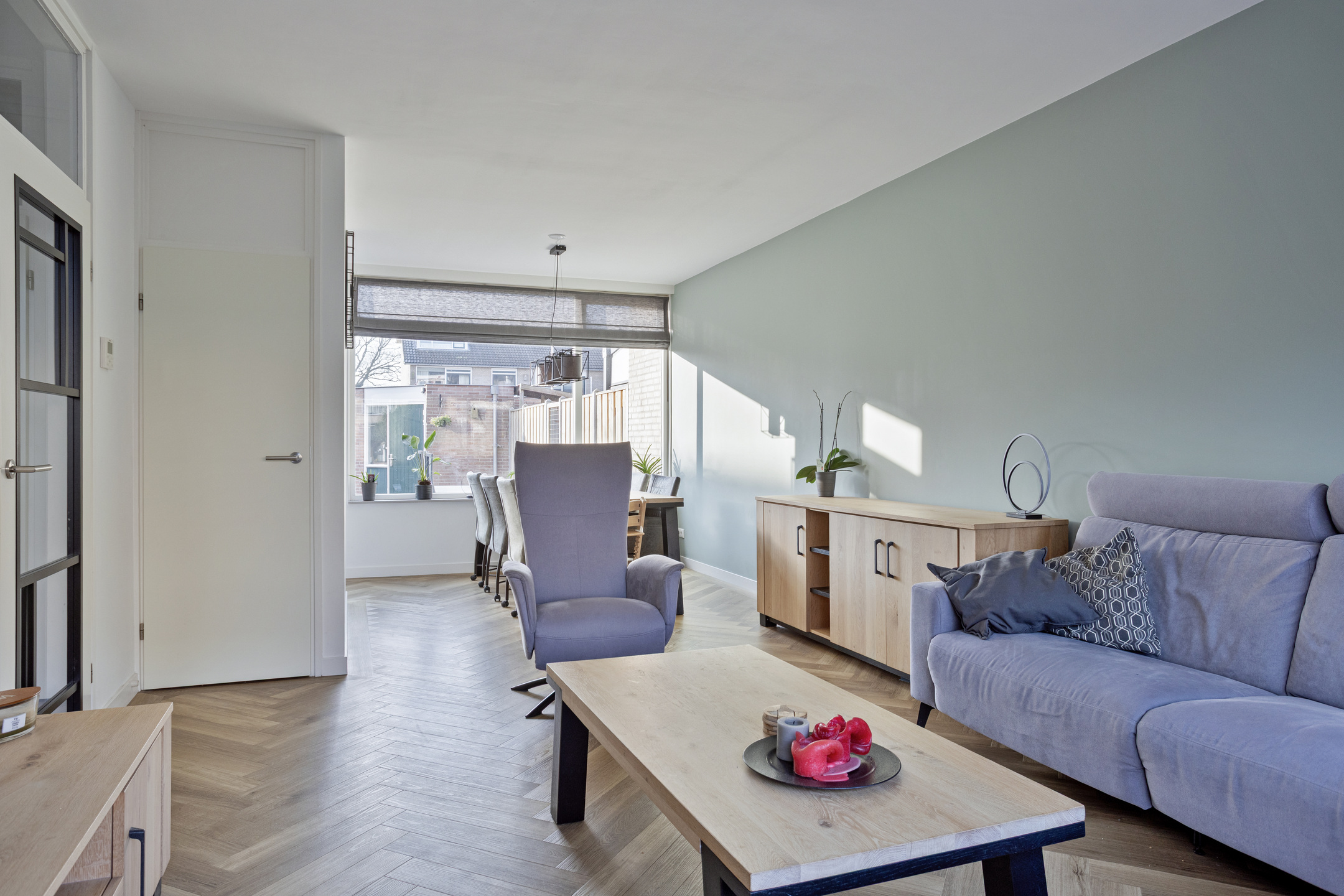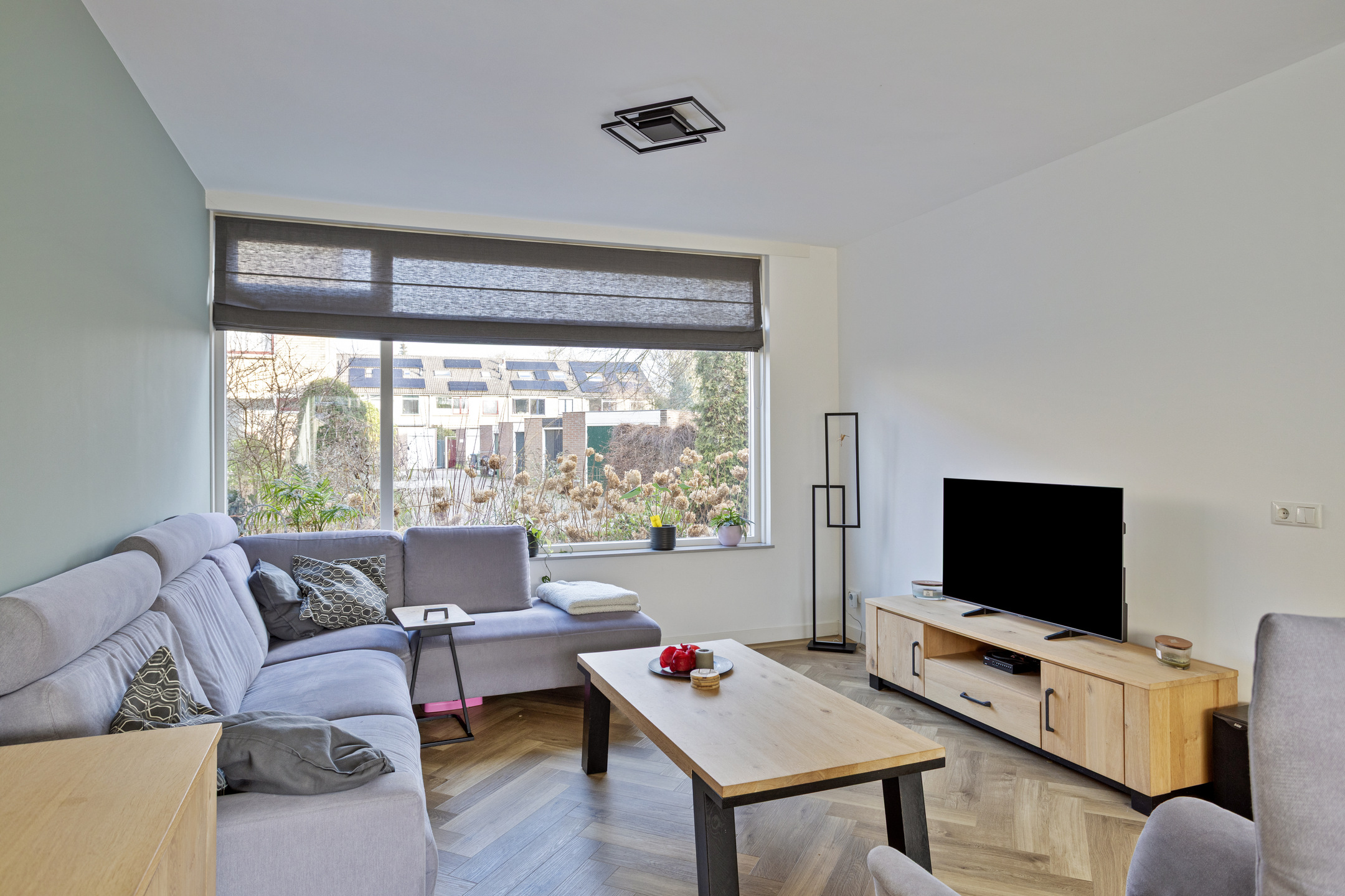 Begane grond: entree, hal met meterkast, trapkast, trapopgang naar de 1e verdieping en toilet voorzien van wandcloset en fonteintje. Lichte doorzonwoonkamer voorzien van pvc-visgraatvloer en een luxe half open keuken met tuindeur, voorzien van koelkast, vriezer, magnetron, oven, inductiekookplaat, afzuigkap, vaatwasser en Quooker met bruiswaterfunctie.