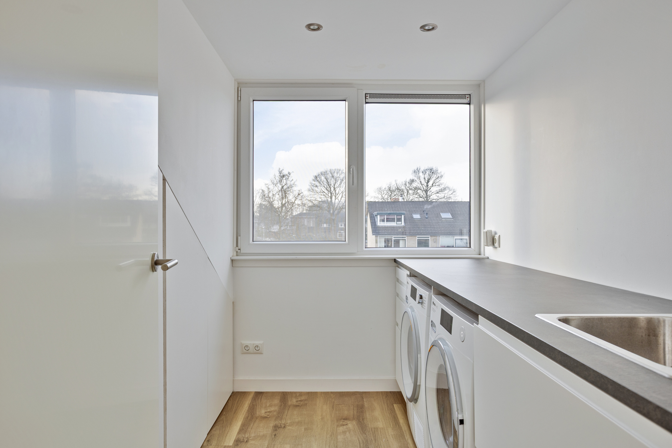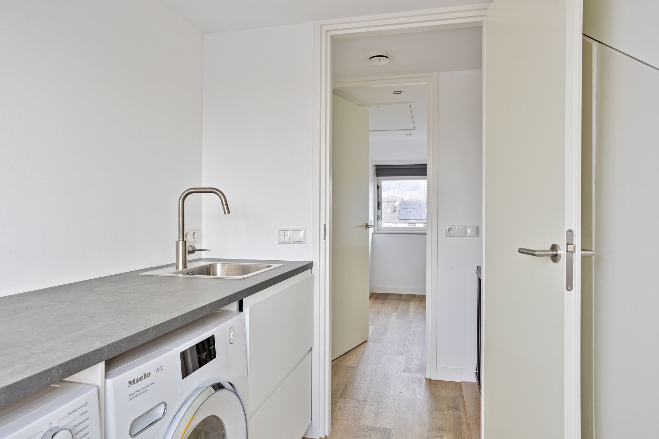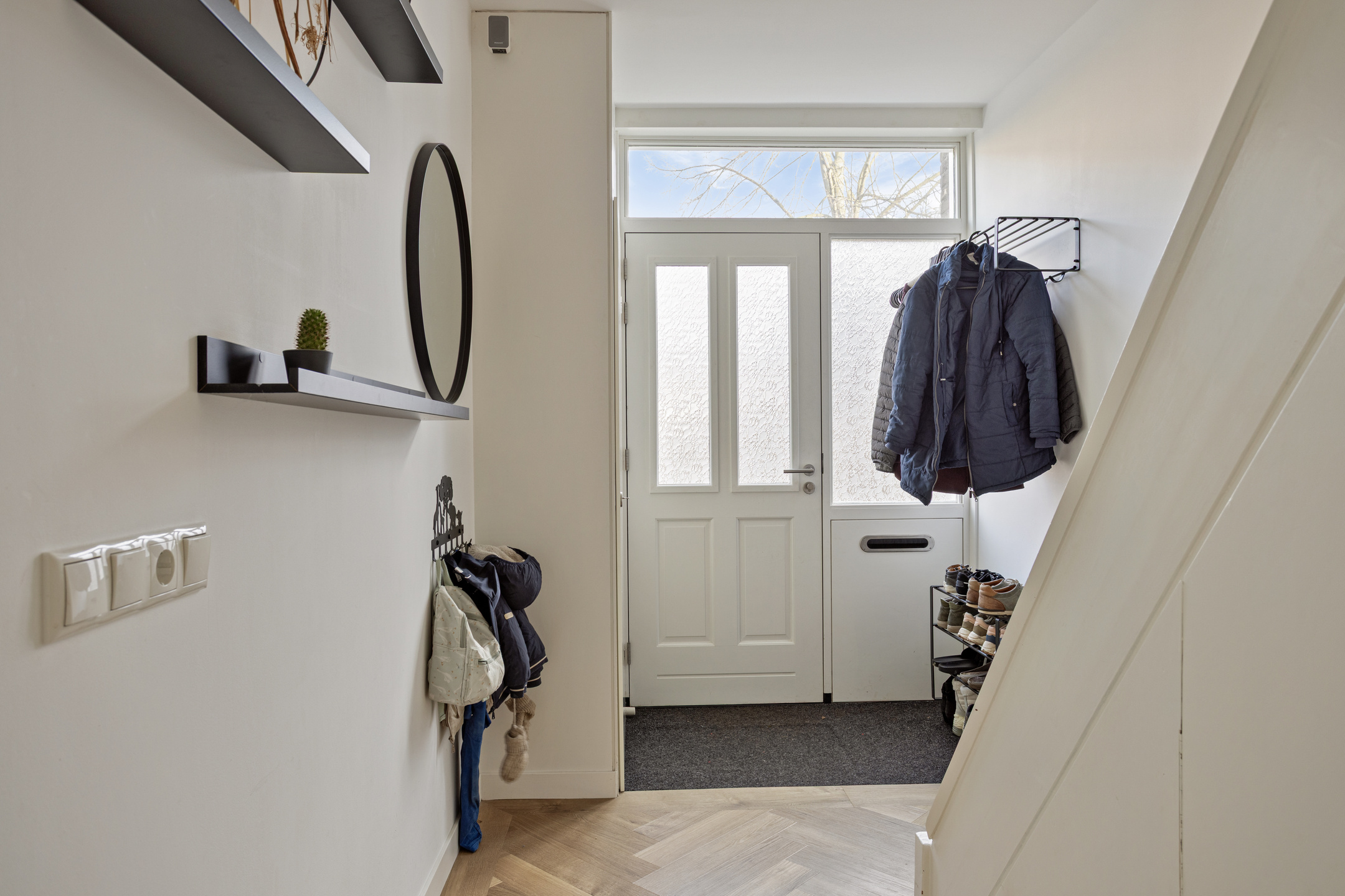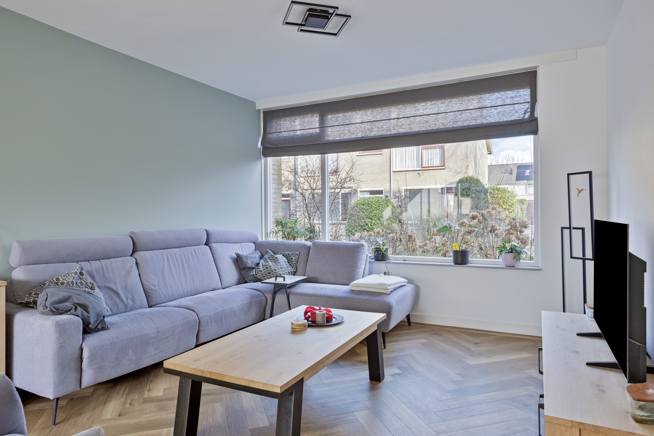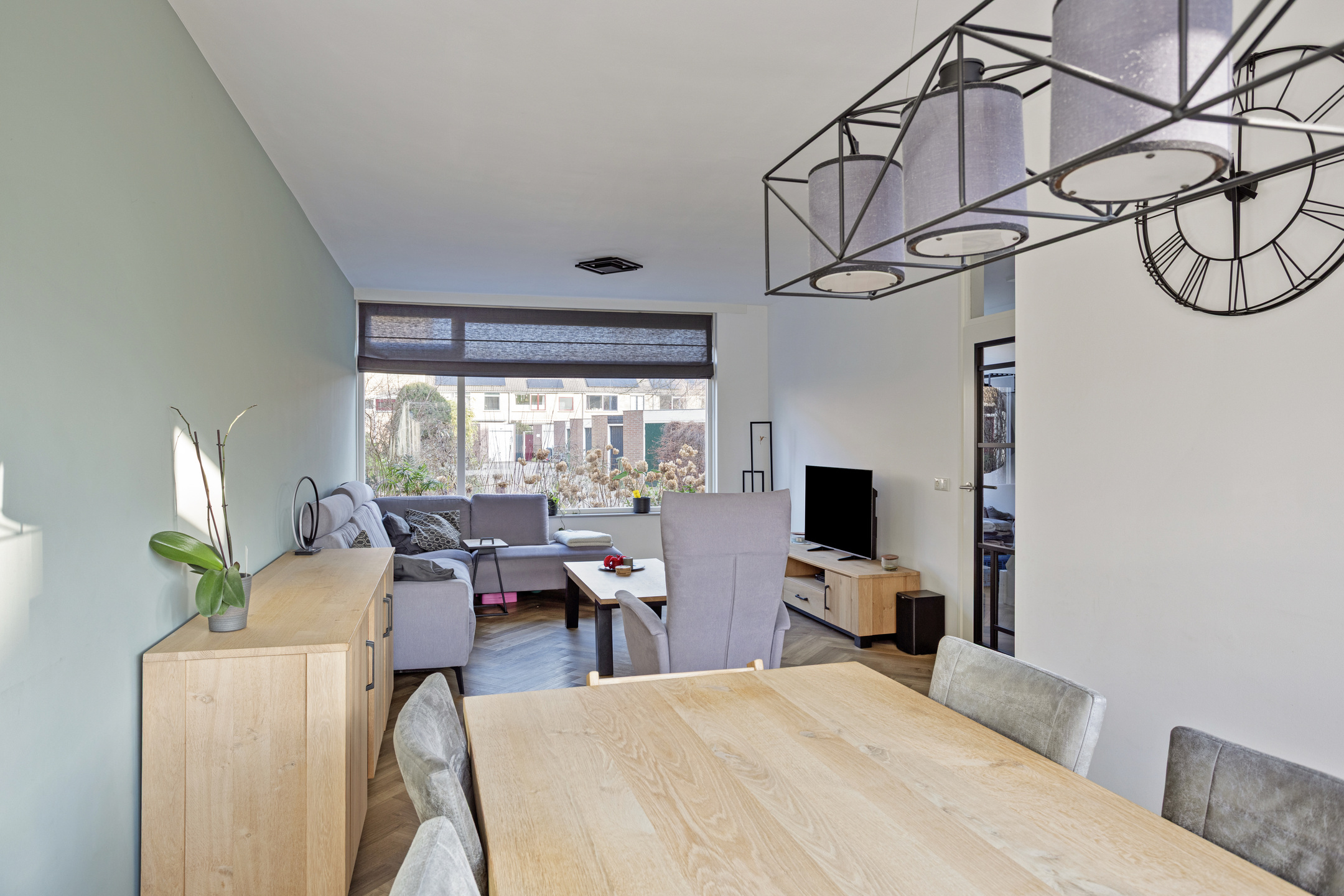Begane grond: entree, hal met meterkast, trapkast, trapopgang naar de 1e verdieping en toilet voorzien van wandcloset en fonteintje. Lichte doorzonwoonkamer voorzien van pvc-visgraatvloer en een luxe half open keuken met tuindeur, voorzien van koelkast, vriezer, magnetron, oven, inductiekookplaat, afzuigkap, vaatwasser en Quooker met bruiswaterfunctie.