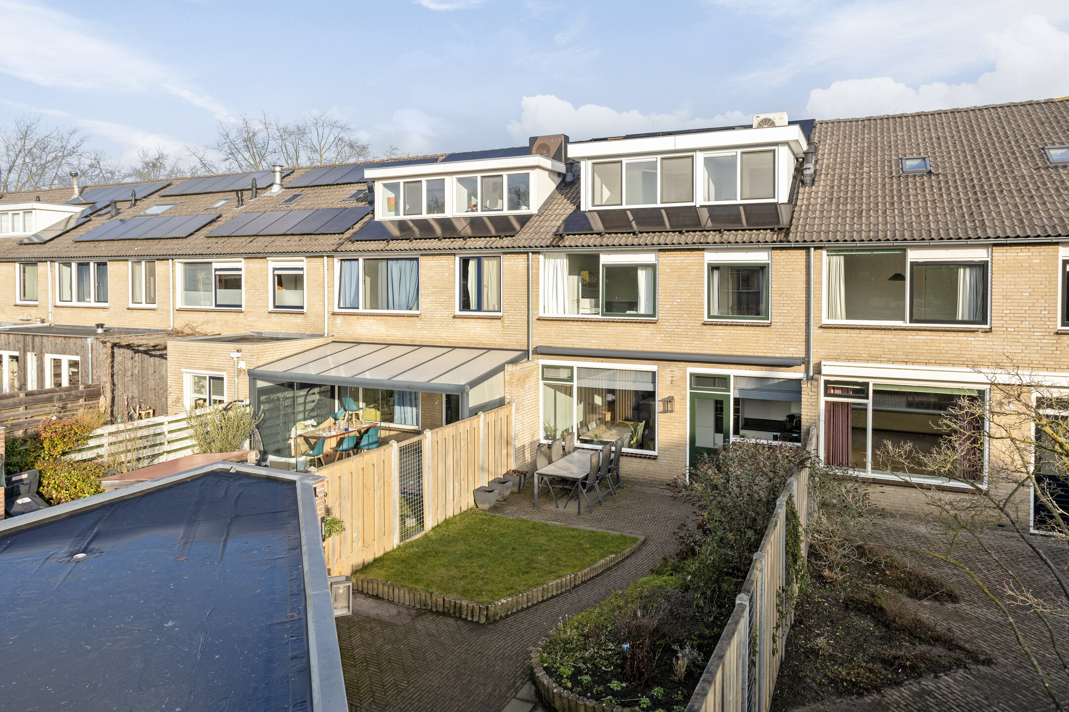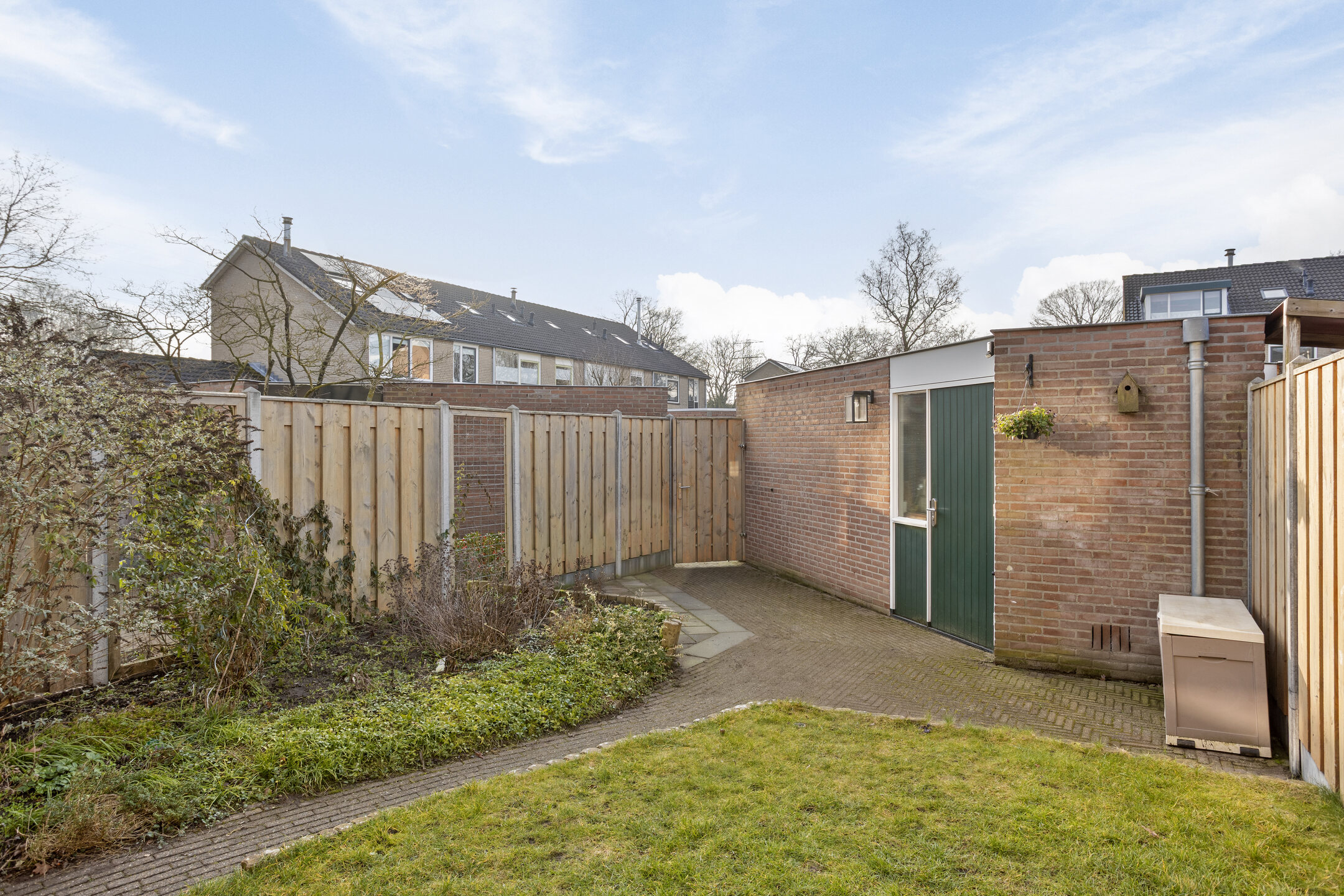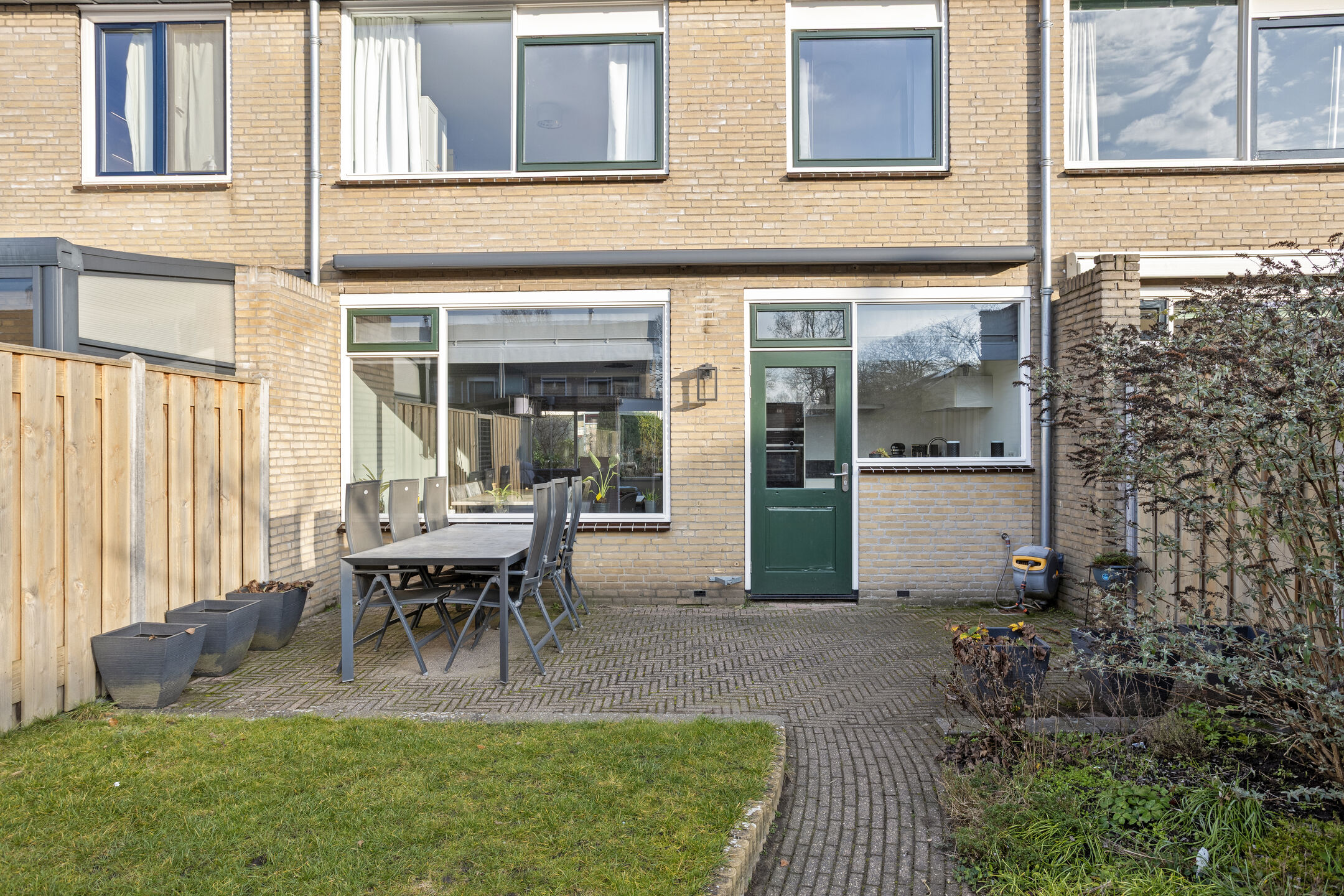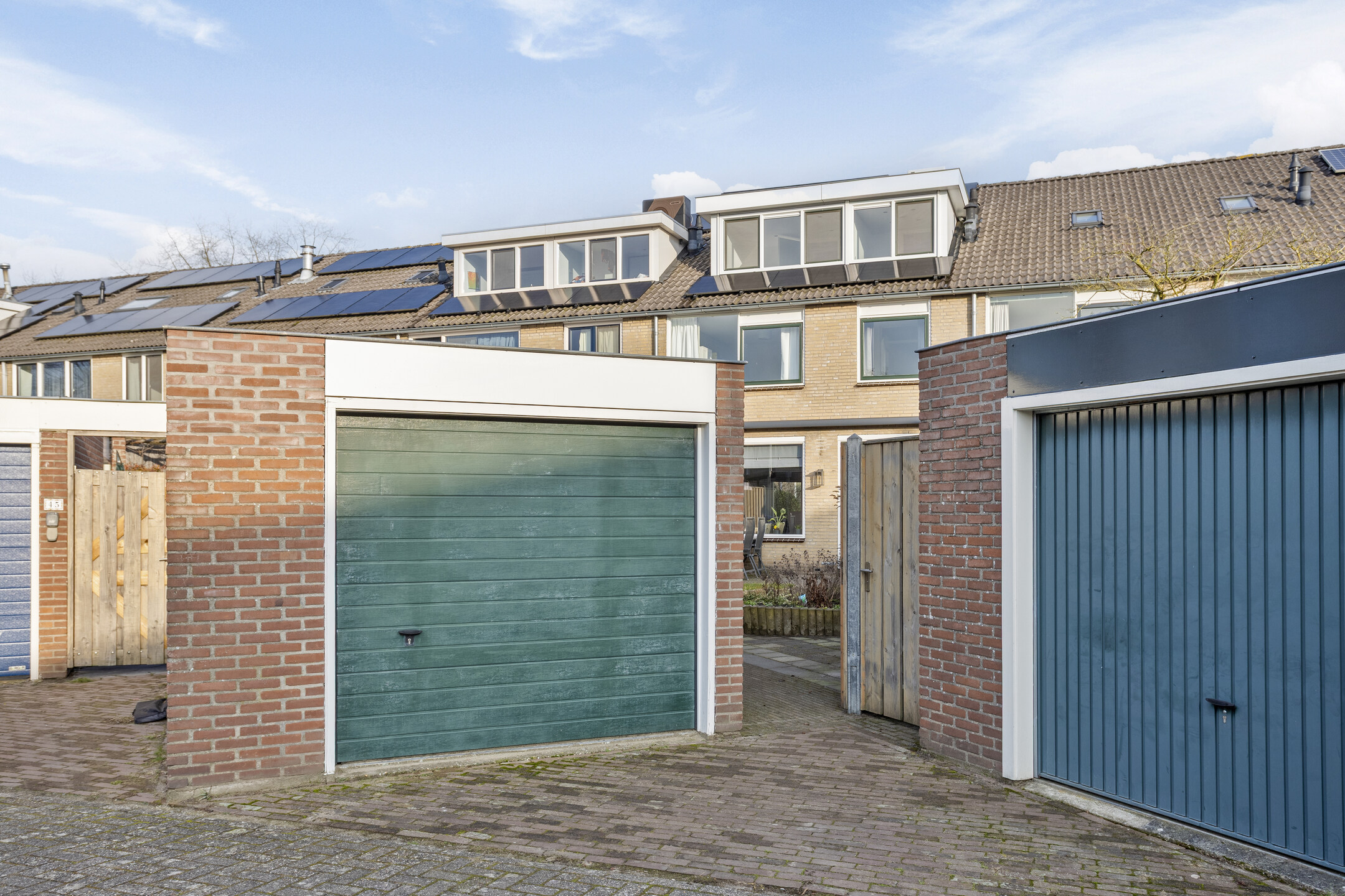 Zonnige achtertuin op het zuiden met bestraat terras tegen de achtergevel voorzien van elektrisch zonnescherm, gazon, looppad naar achter en een vrijstaande garage ter grootte van circa 19 m². De tuin is ook achterom te bereiken. Parkeren is mogelijk op de openbare parkeervoorzieningen in de straat.