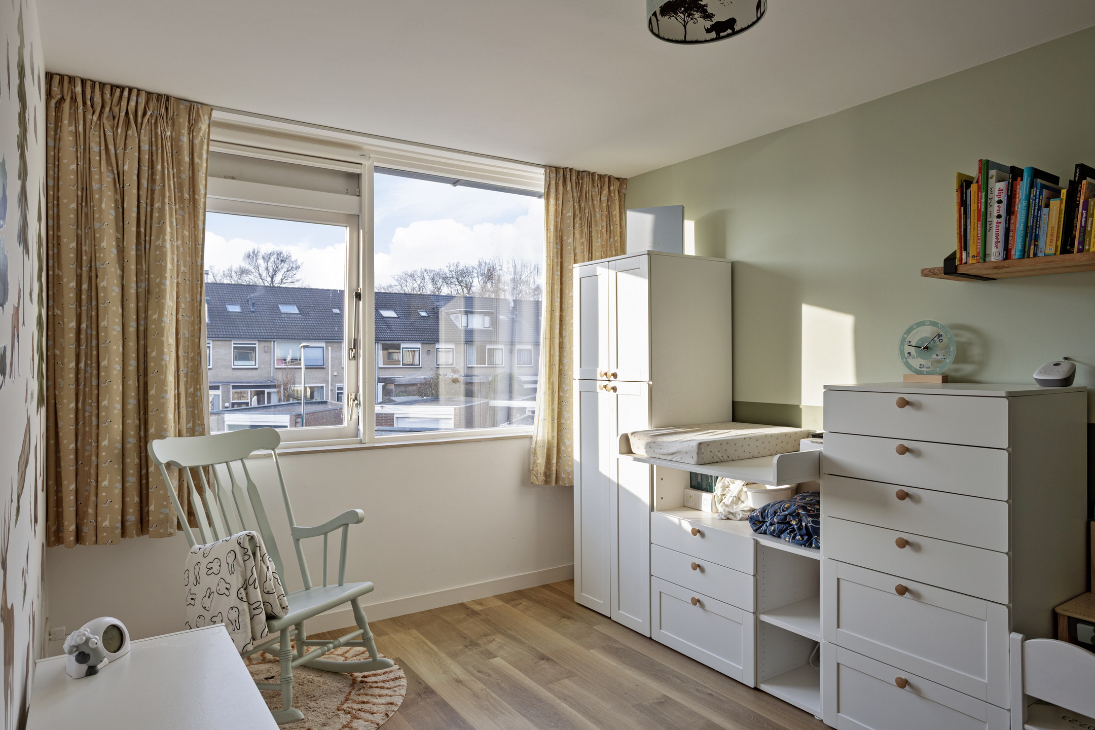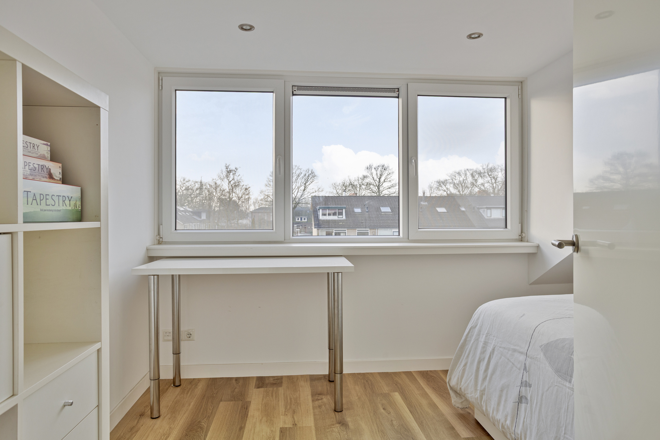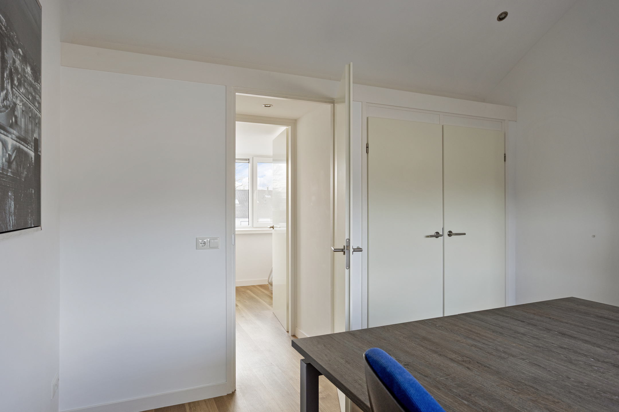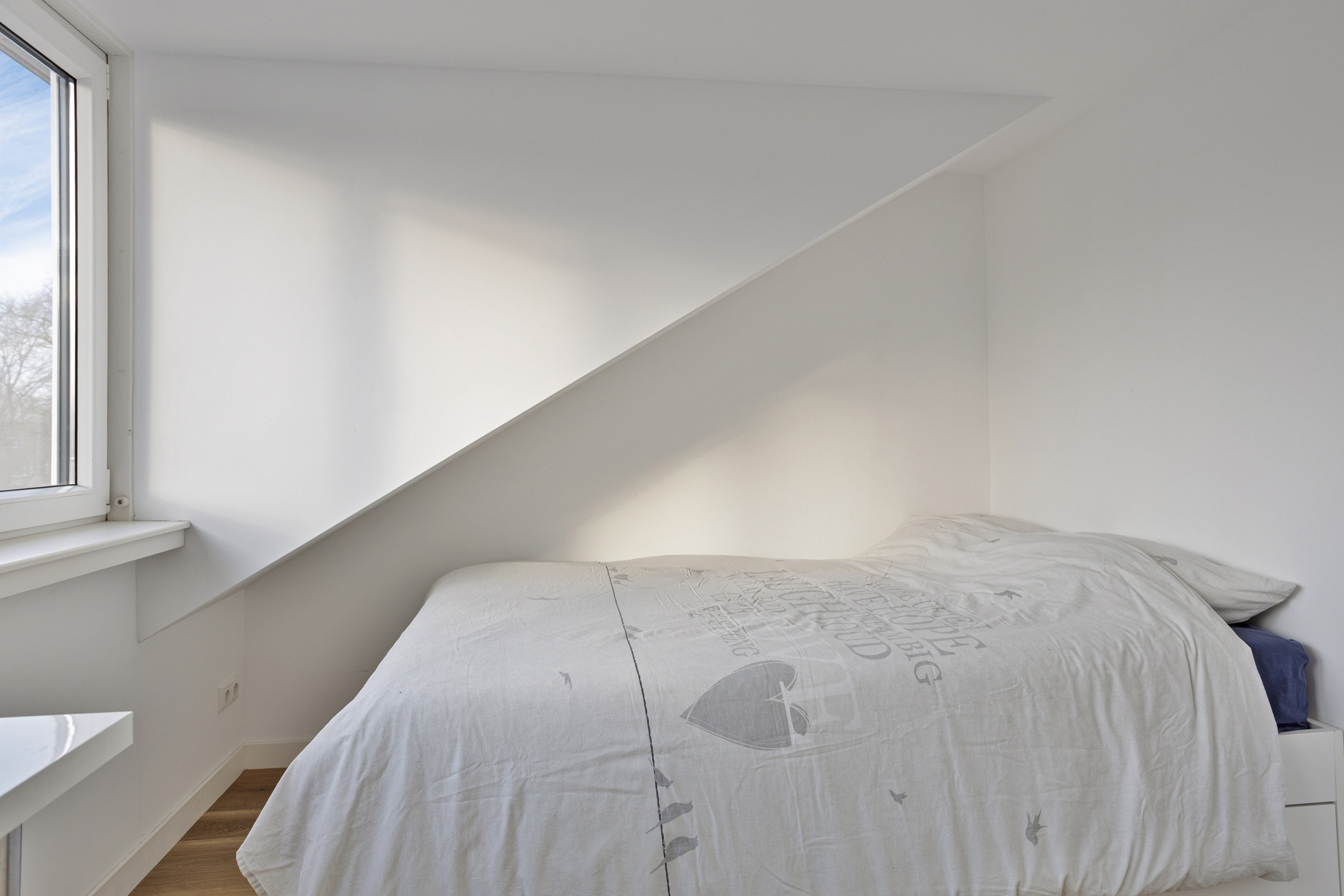 2e Verdieping: overloop. Drie slaapkamers ter grootte van circa 5,5 m², 8 m² en 12 m², waarvan één voorzien van vaste kast en één met vlizotrap naar de bergruimte in de nok. Aparte wasruimte met vaste kast t.b.v. de warmtevoorziening.