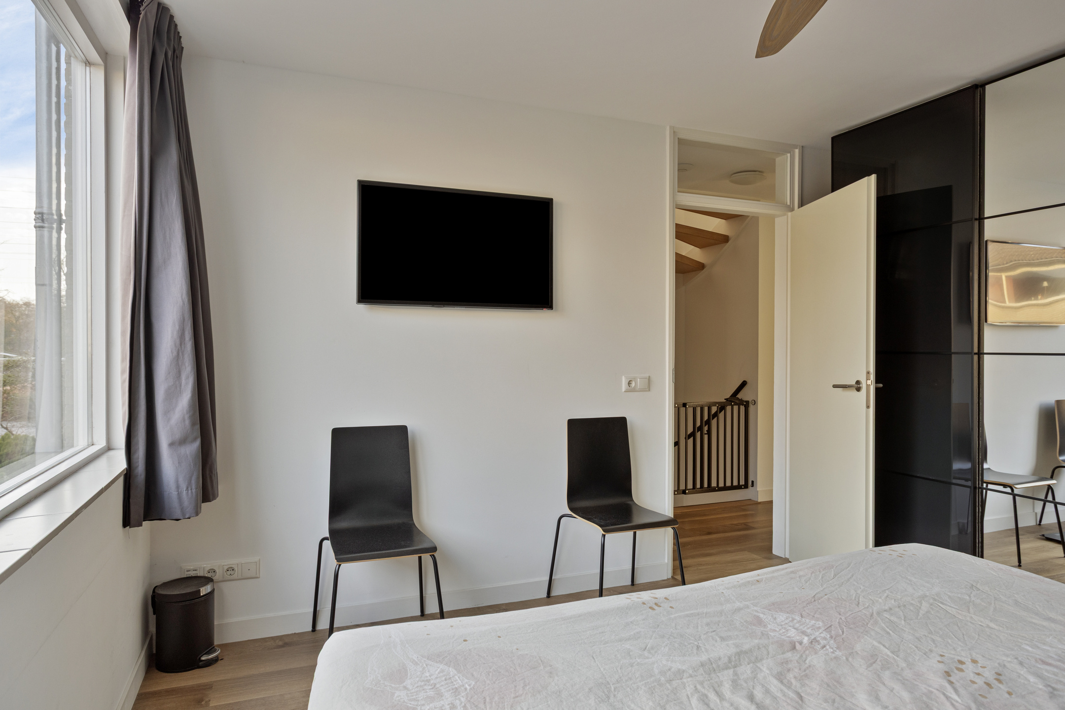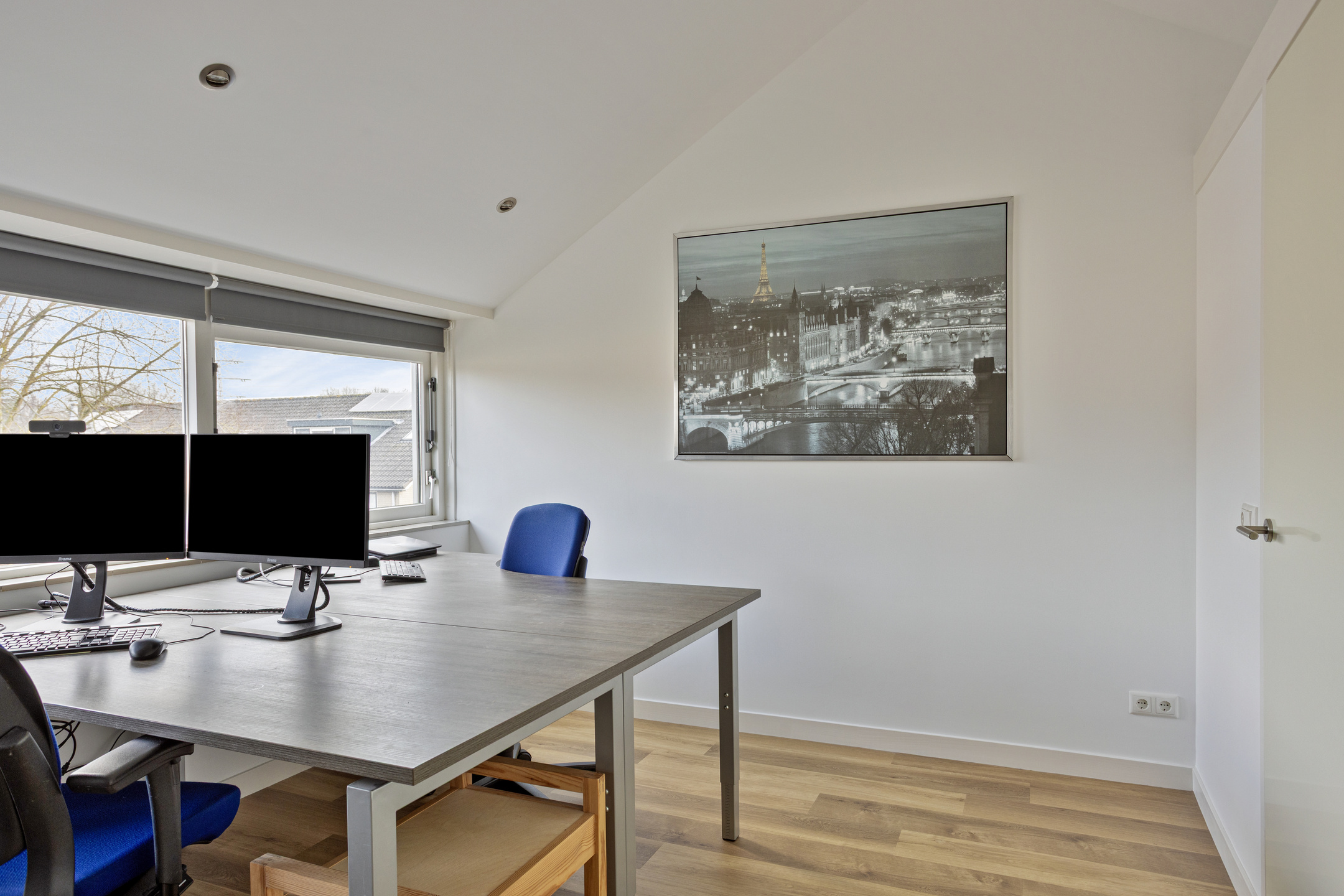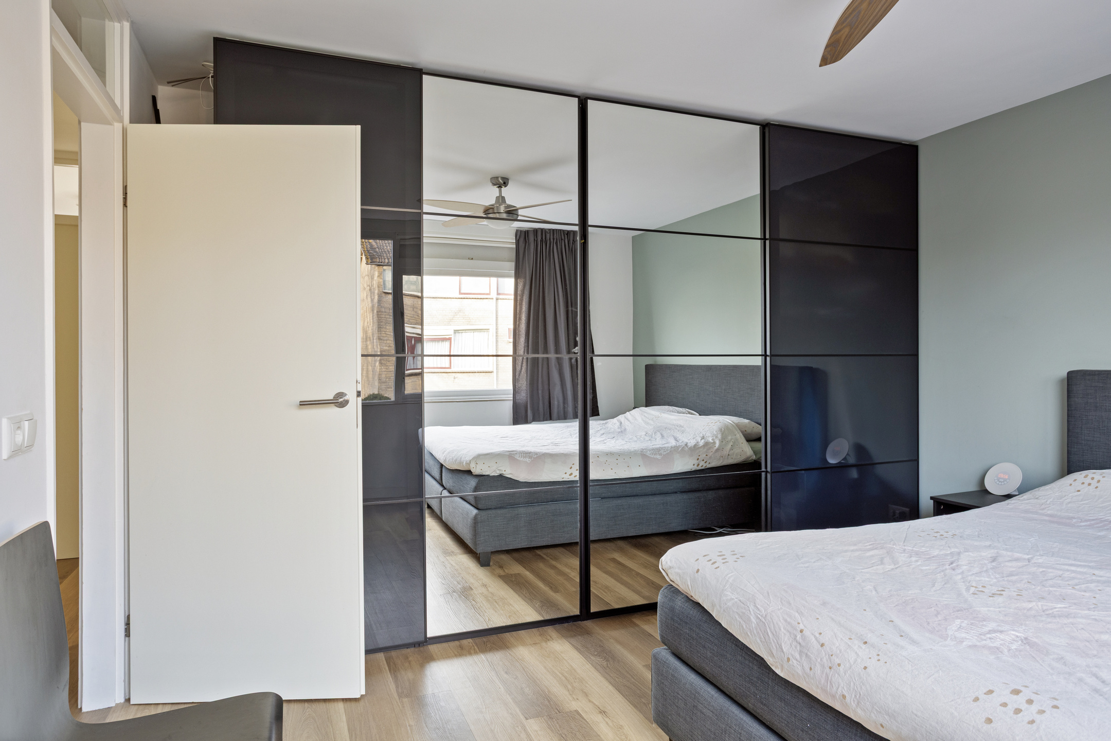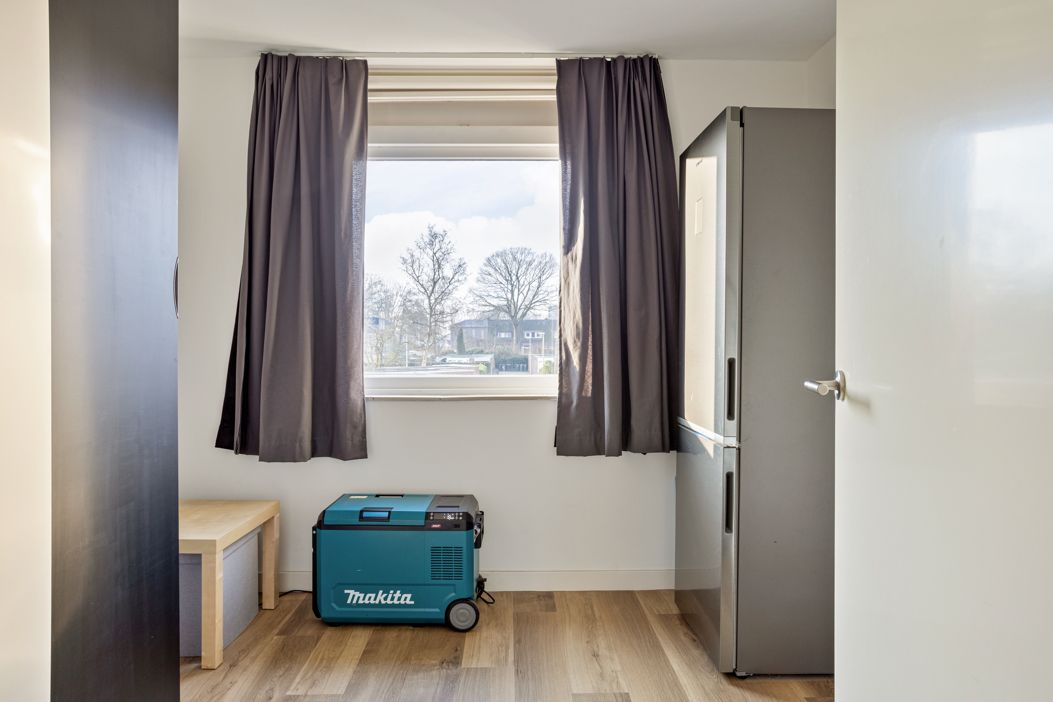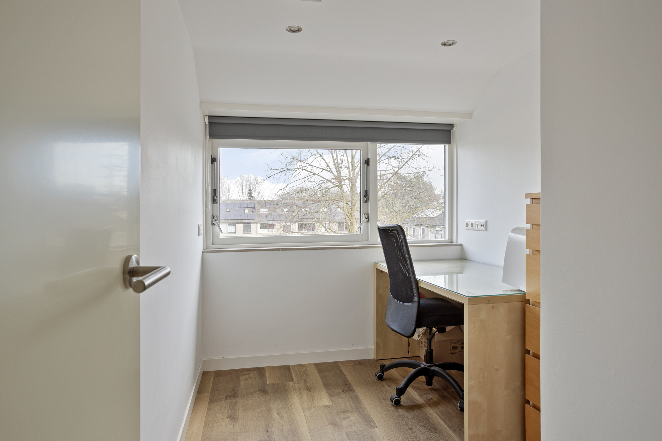 2e Verdieping: overloop. Drie slaapkamers ter grootte van circa 5,5 m², 8 m² en 12 m², waarvan één voorzien van vaste kast en één met vlizotrap naar de bergruimte in de nok. Aparte wasruimte met vaste kast t.b.v. de warmtevoorziening.