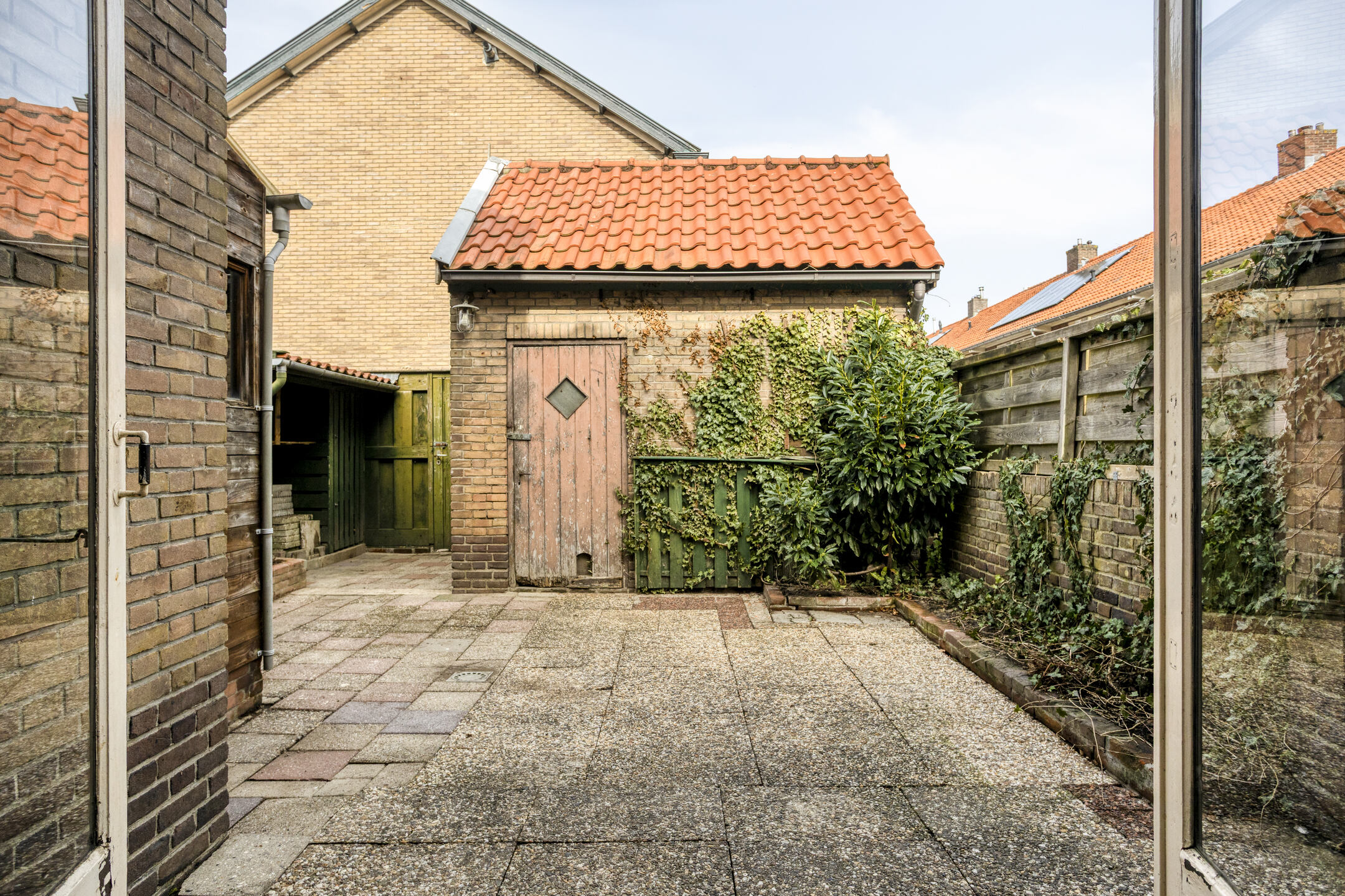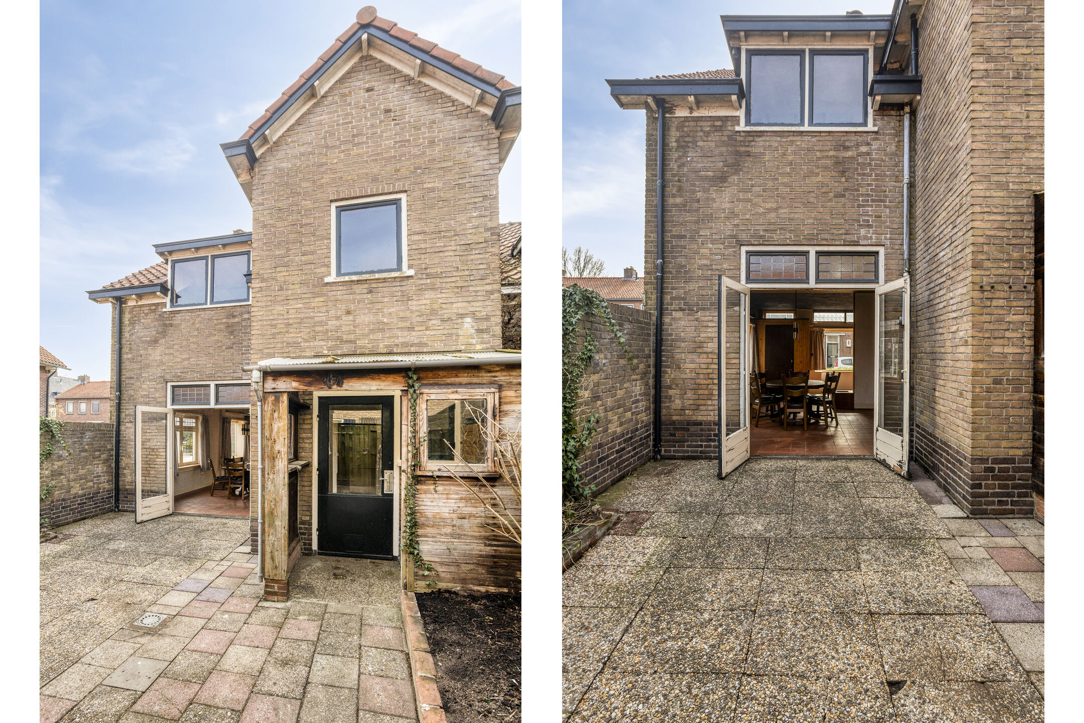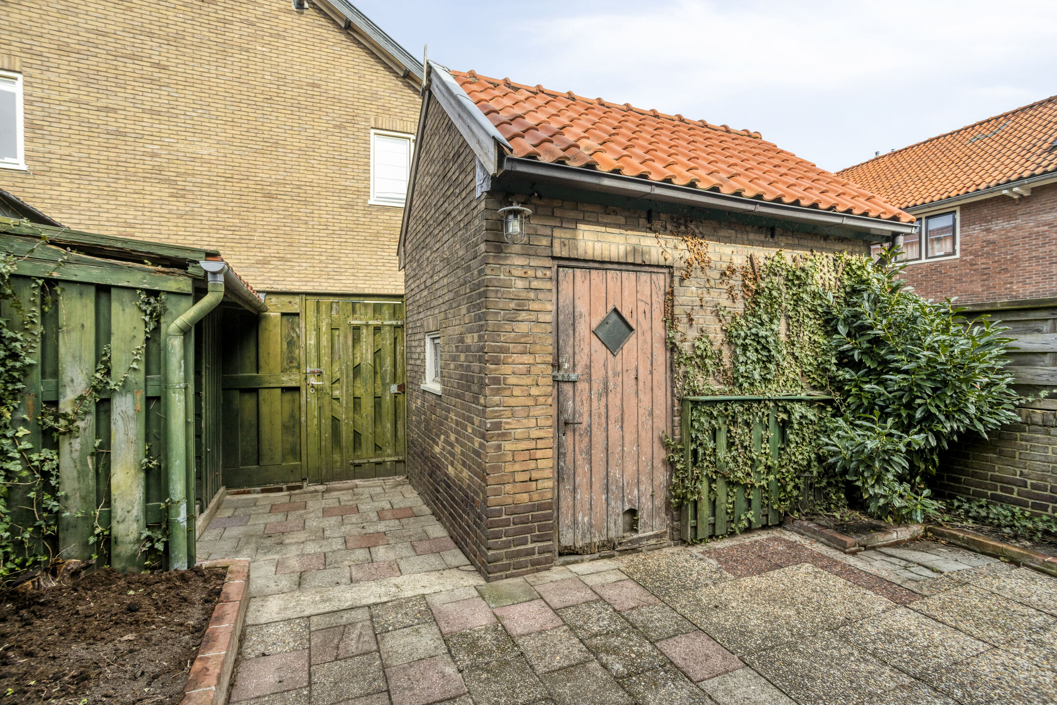 Onderhoudsvriendelijke achtertuin met terras bij de achtergevel, borders, stenen berging en achterom. Parkeren is mogelijk in de straat op de openbare parkeervoorzieningen.