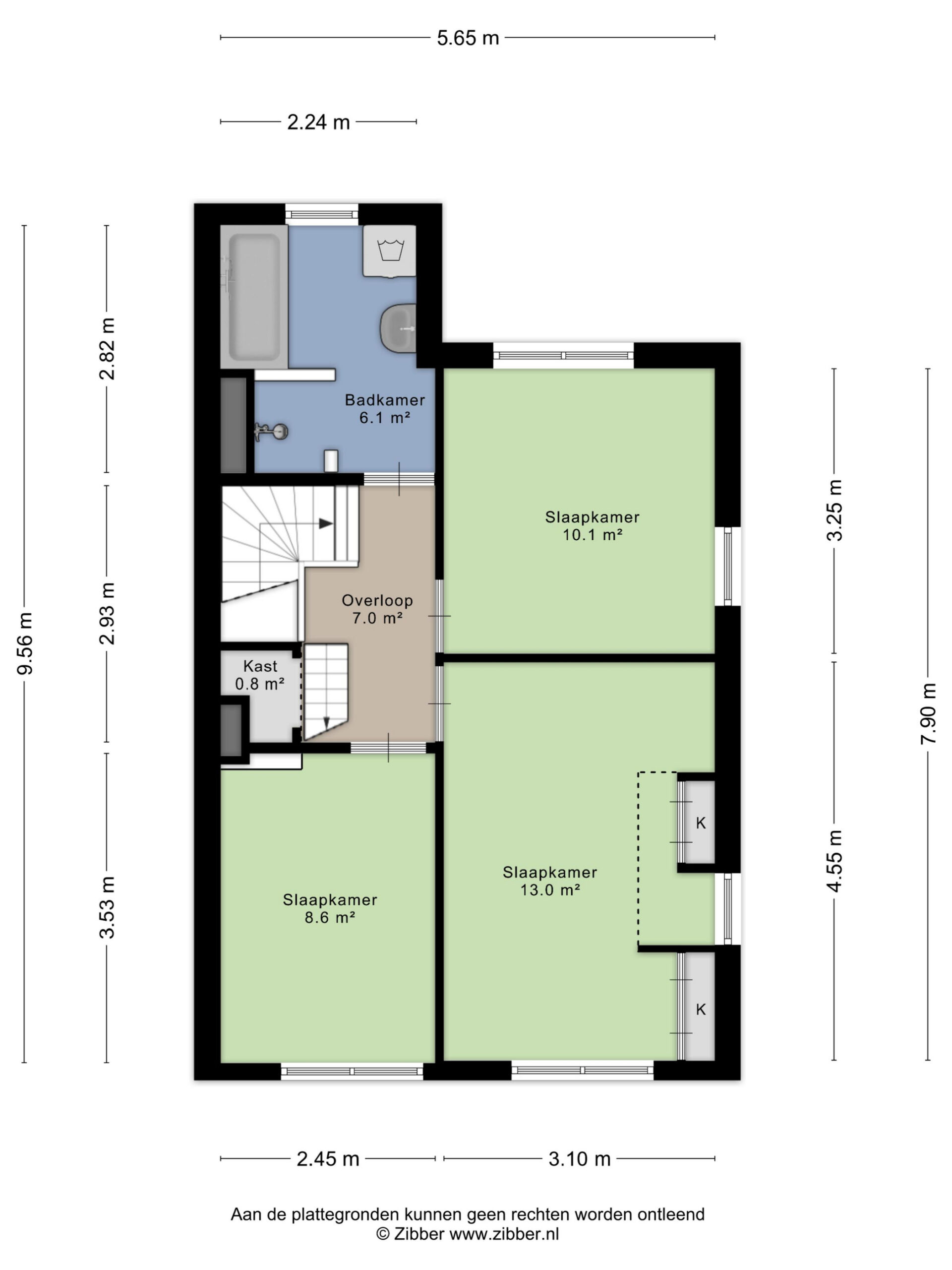 1e Verdieping: overloop met vaste kast. Drie slaapkamers ter grootte van circa 8,5 m², 10 m² en 13 m², waarvan de grote slaapkamer is voorzien van vaste kasten. Ruime badkamer met ligbad, separate douche, wasmachine-aansluiting en wastafel.