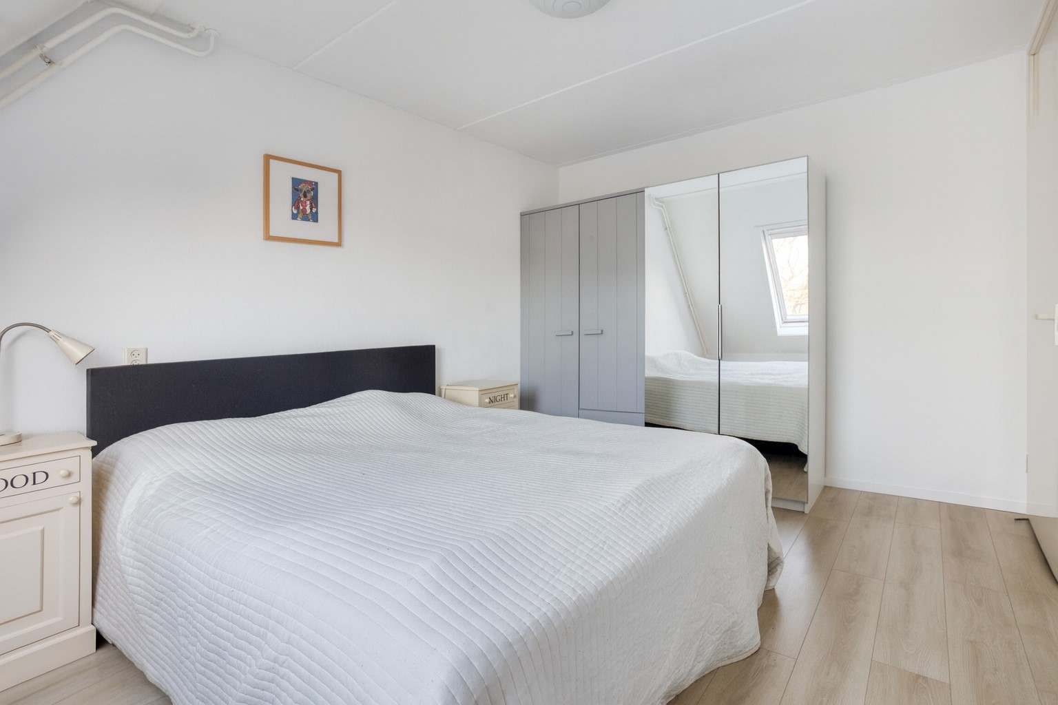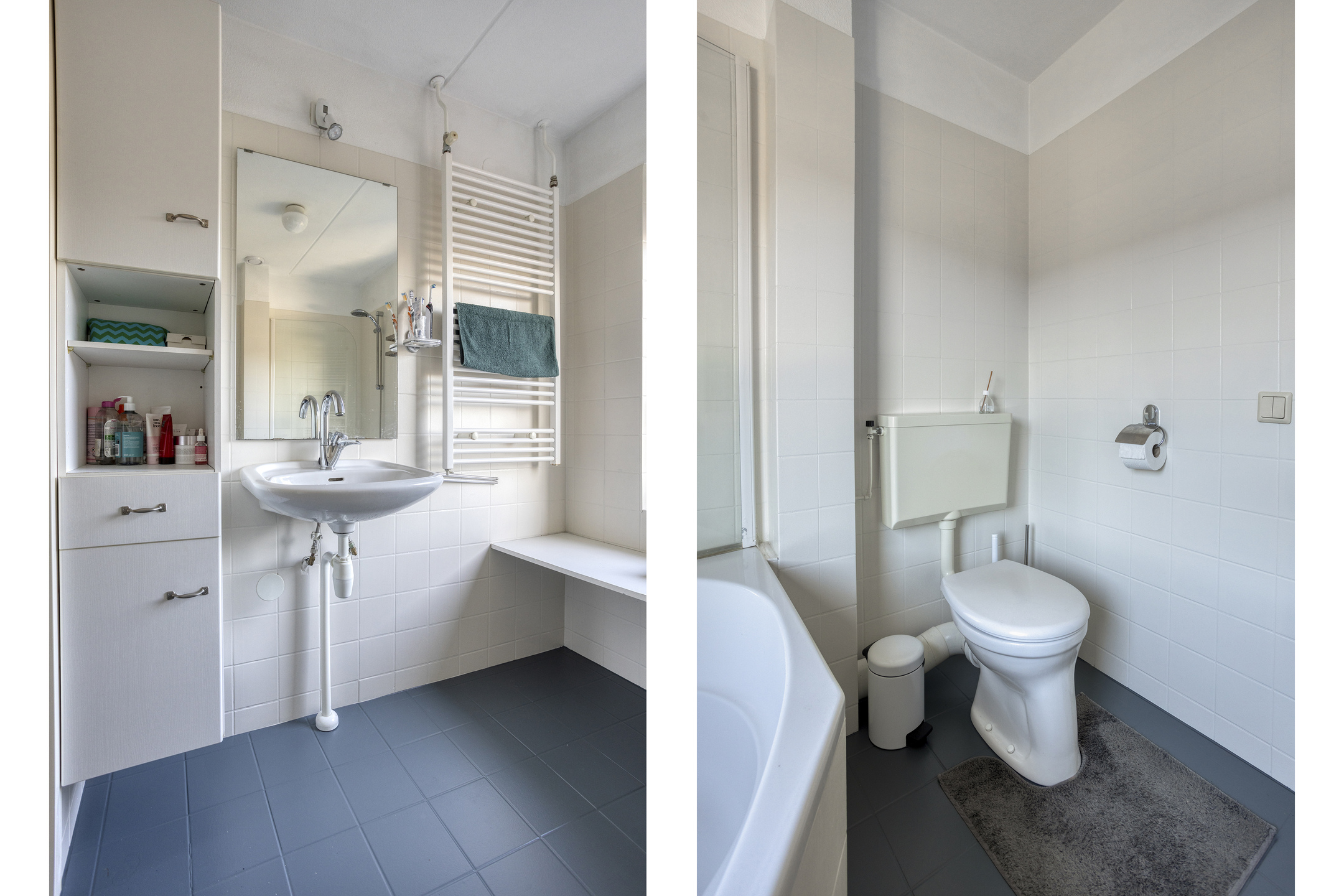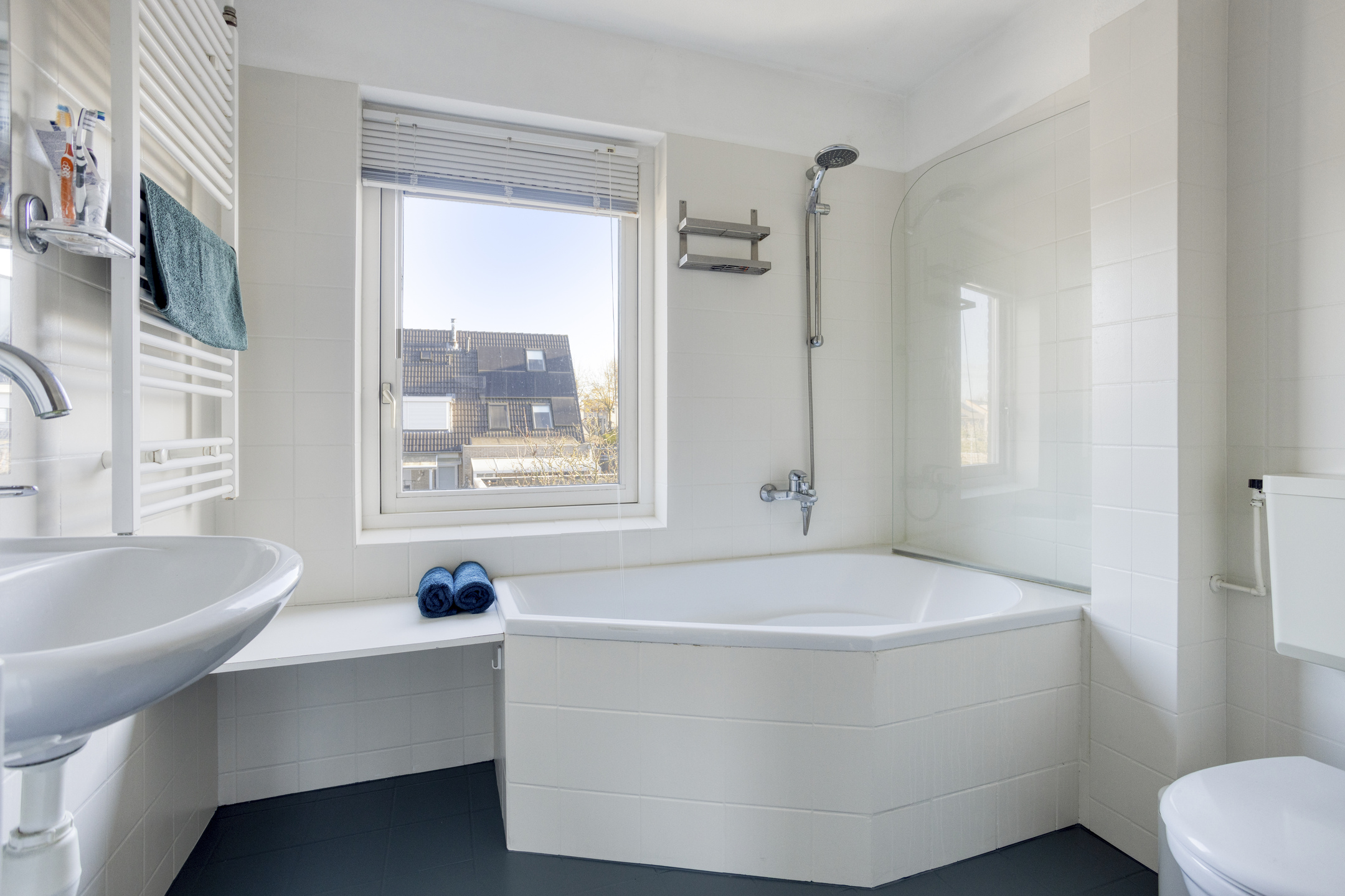 1e verdieping: overloop. Drie slaapkamers ter grootte van circa 7 m², 8 m² en 14 m², allen voorzien van laminaatvloer. De twee kamers aan de achterzijde zijn voorzien van dakramen. Nette badkamer met ligbad, douche, wastafel, toilet en handdoekenradiator.