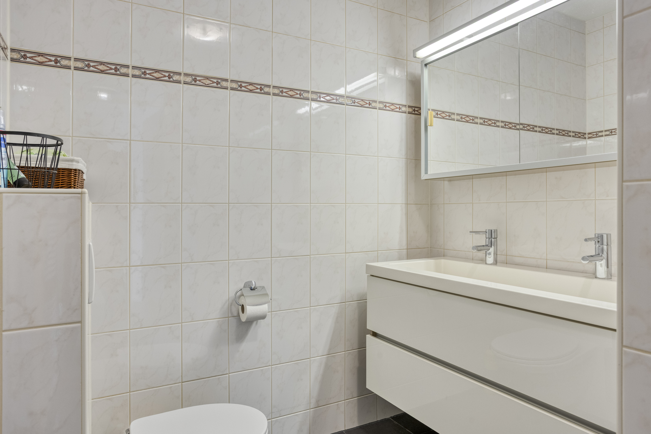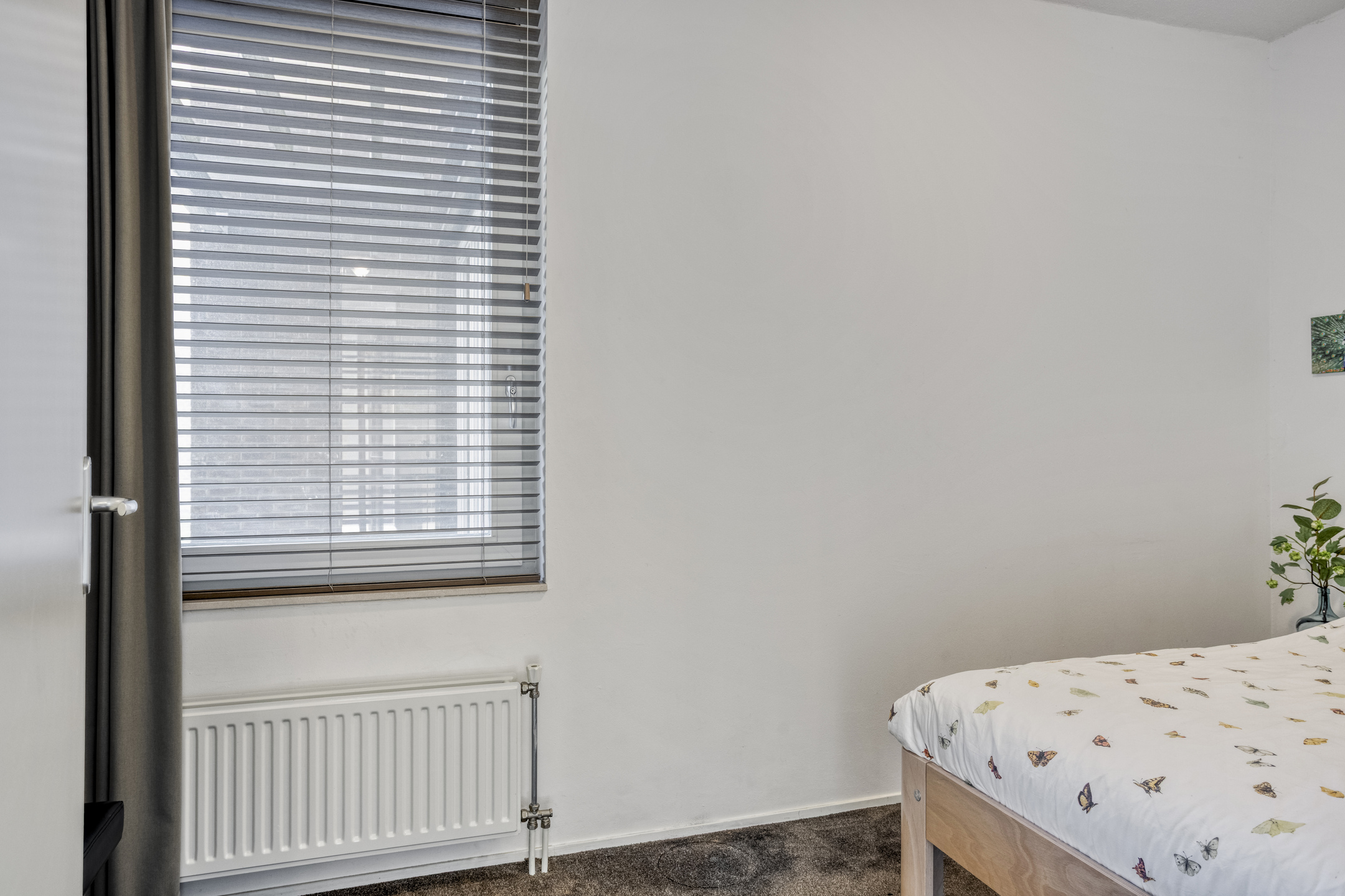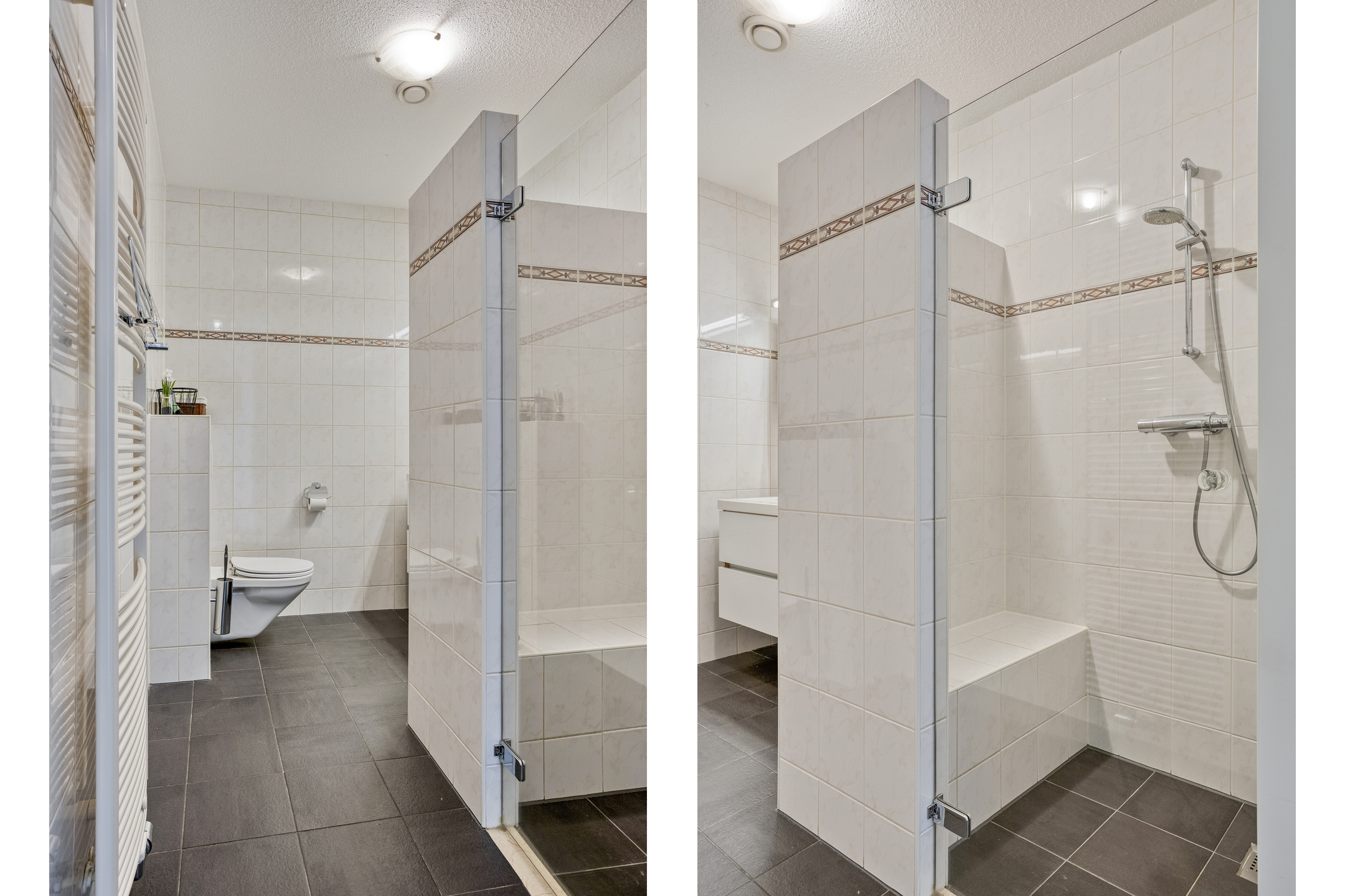 Twee slaapkamers ter grootte van circa 8 m² en 14 m², beiden voorzien van vloerbedekking. Keurige badkamer met inloopdouche, dubbel-wastafelmeubel, 2e toilet en handdoekenradiator.