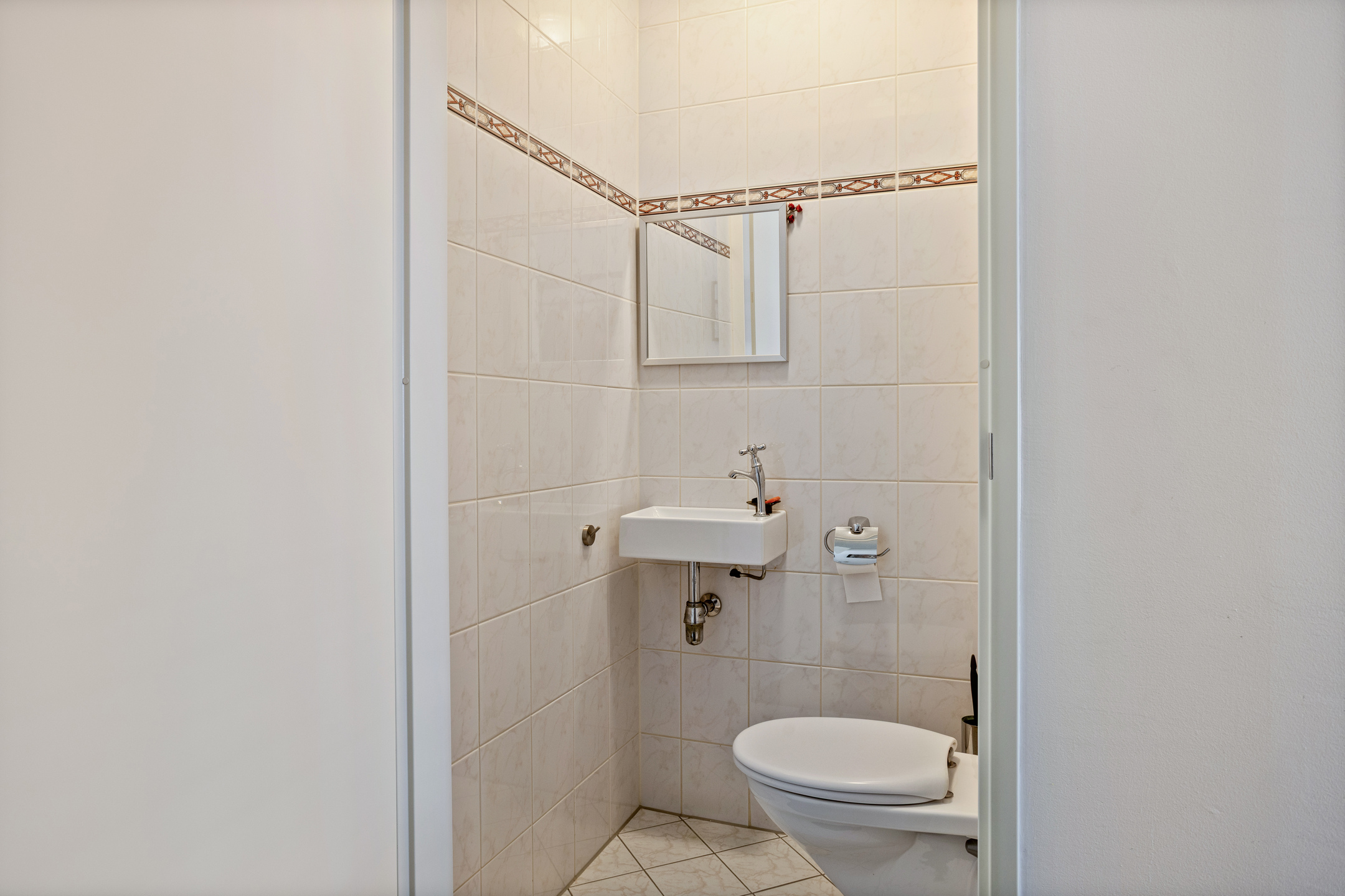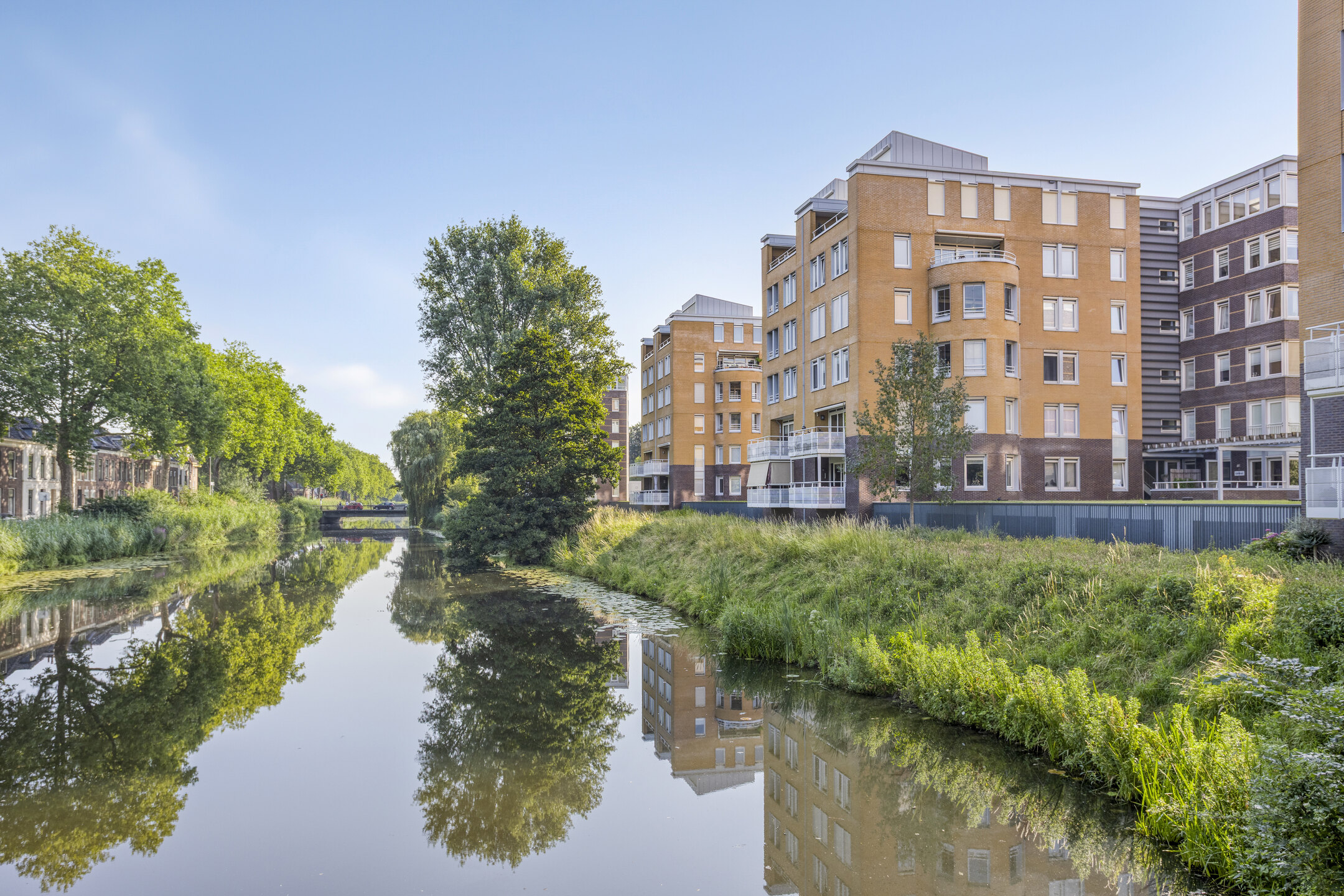 Woonverdieping: entree, hal met toilet voorzien van wandcloset en fonteintje en vaste kast t.b.v.. de cv-installatie. Ruime woon-/eetkamer voorzien van pvc-vloer, airconditioning en toegang tot het ruime terras, welke is voorzien van composiet vlonderplanken (circa 21 m²). Vanaf het terras is er zicht op de Vispoortgracht.