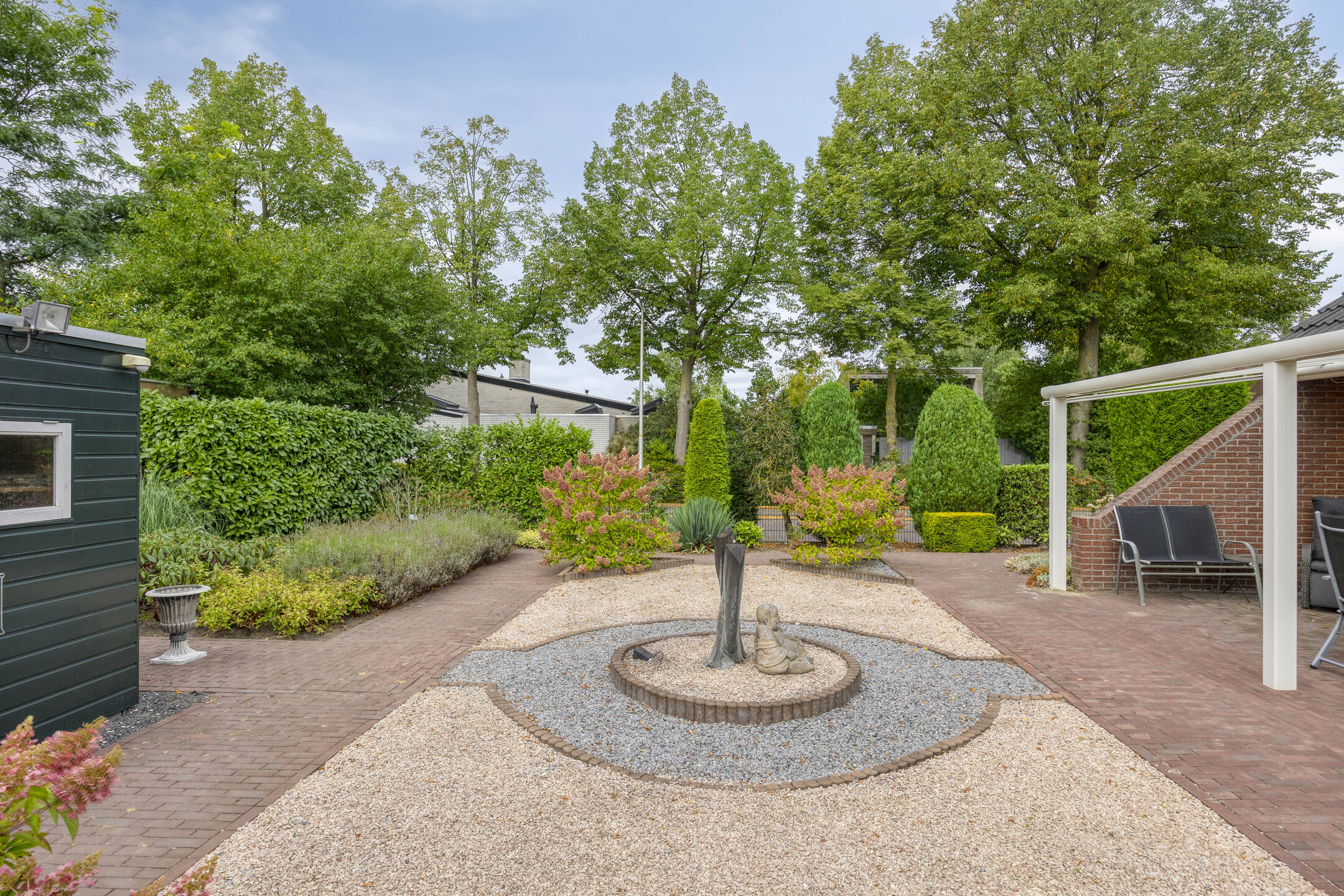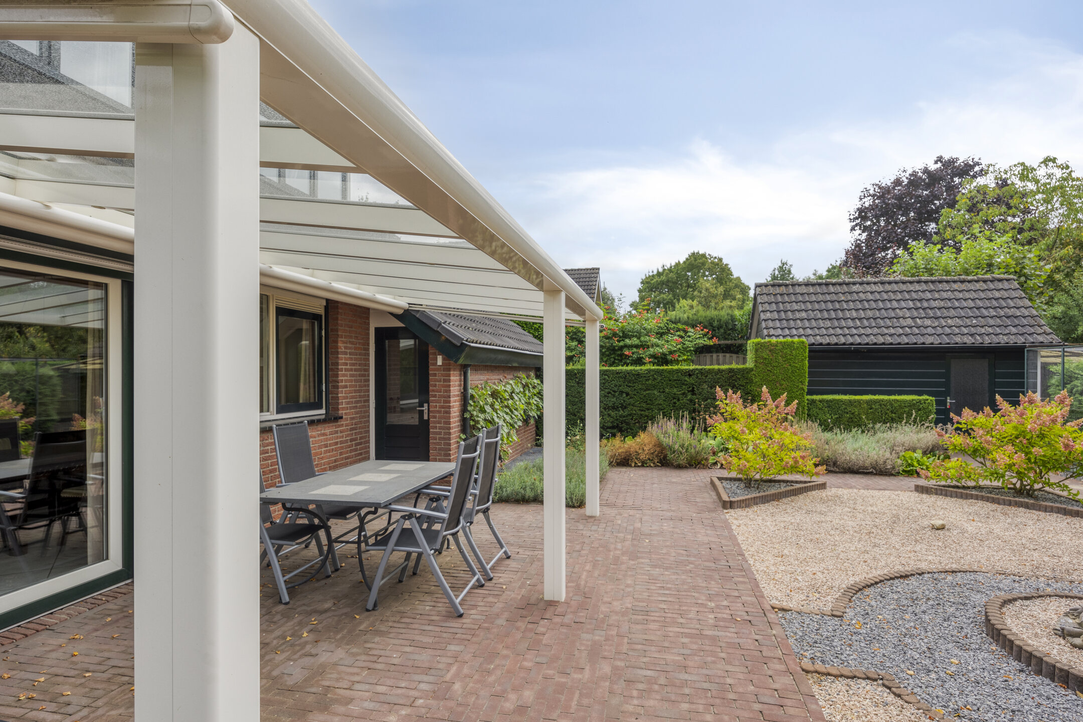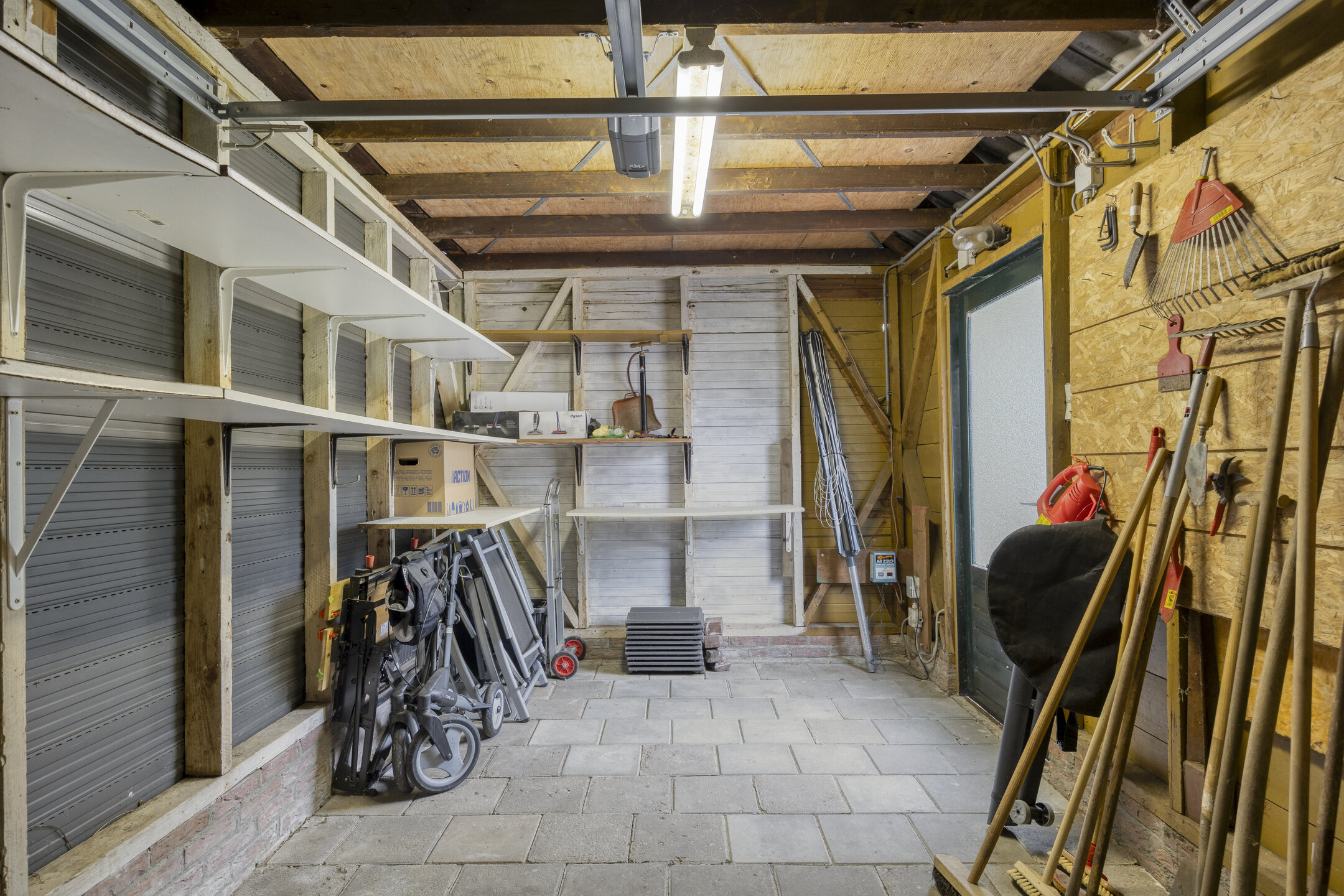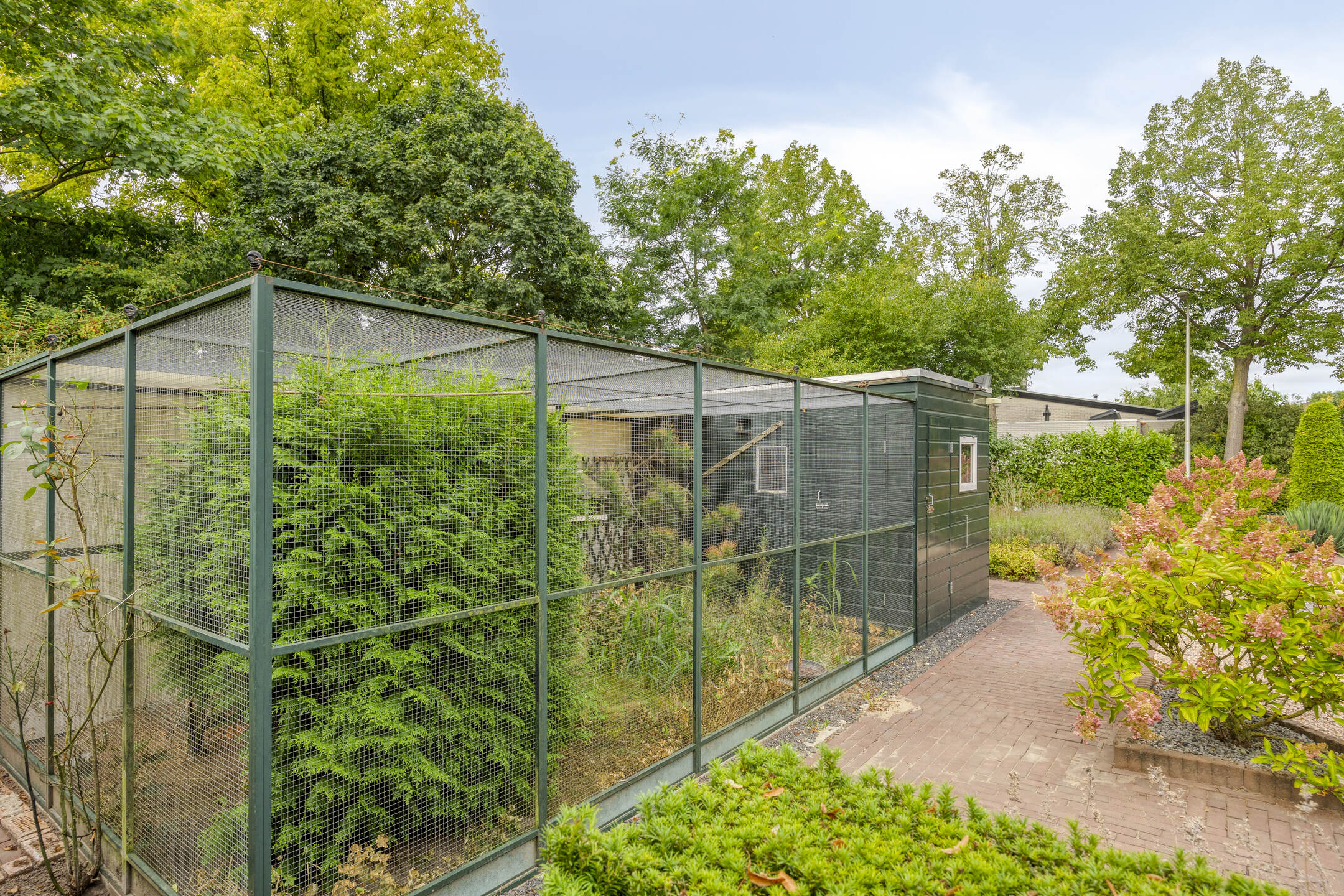 De woning beschikt over een mooie en verzorgde tuin rondom met o.a. een gezellig terras onder de overkapping tegen de achtergevel. Aan de voorzijde van de woning is parkkeerruimte op eigen terrein. Verder zijn er maar liefst 2 garages, 1 inpandig en 1 vrijstaande. Een volière en een houten berging.