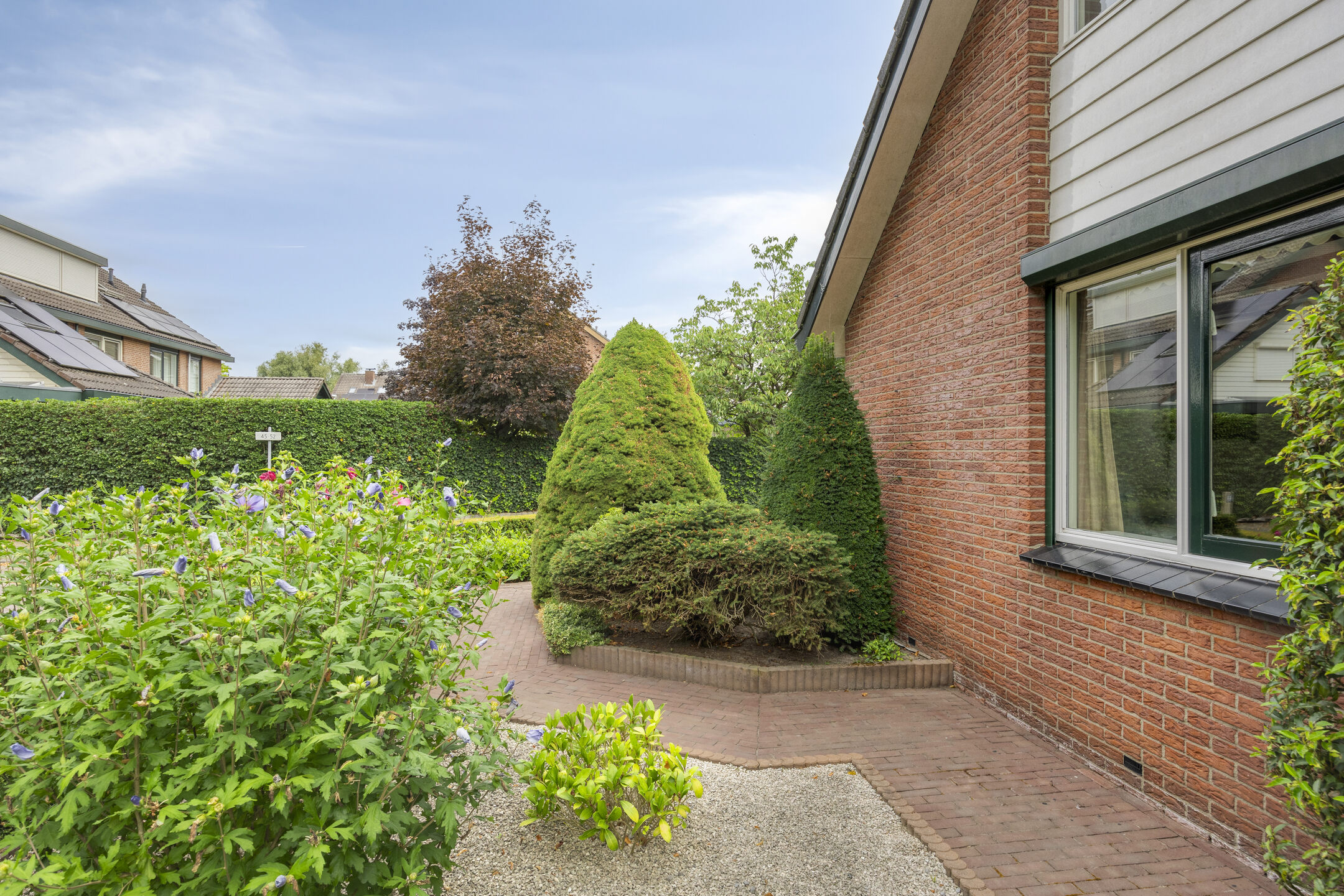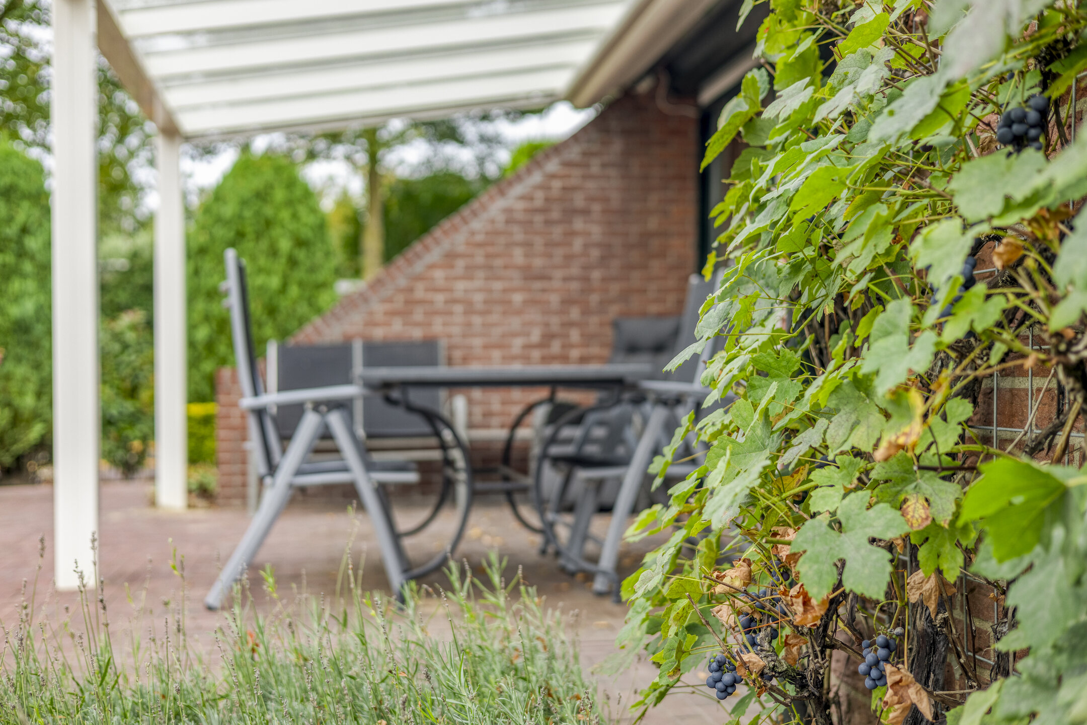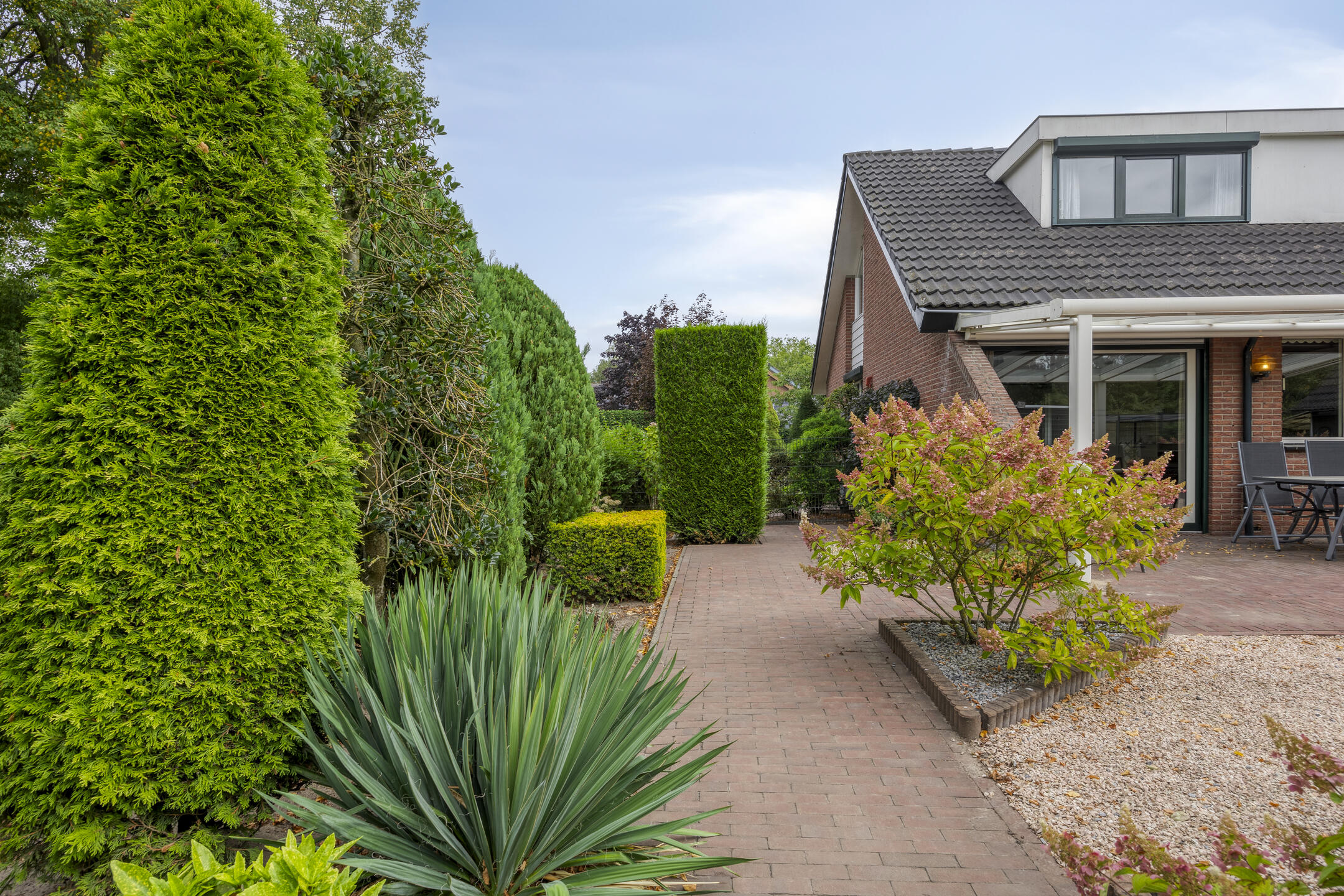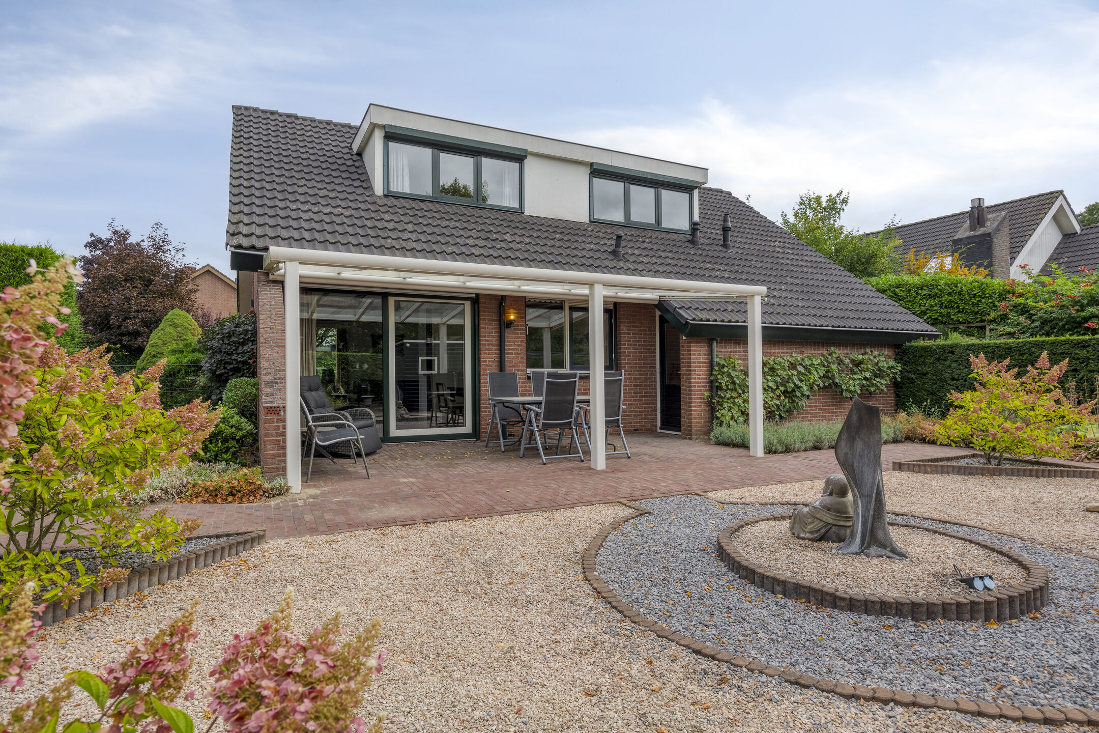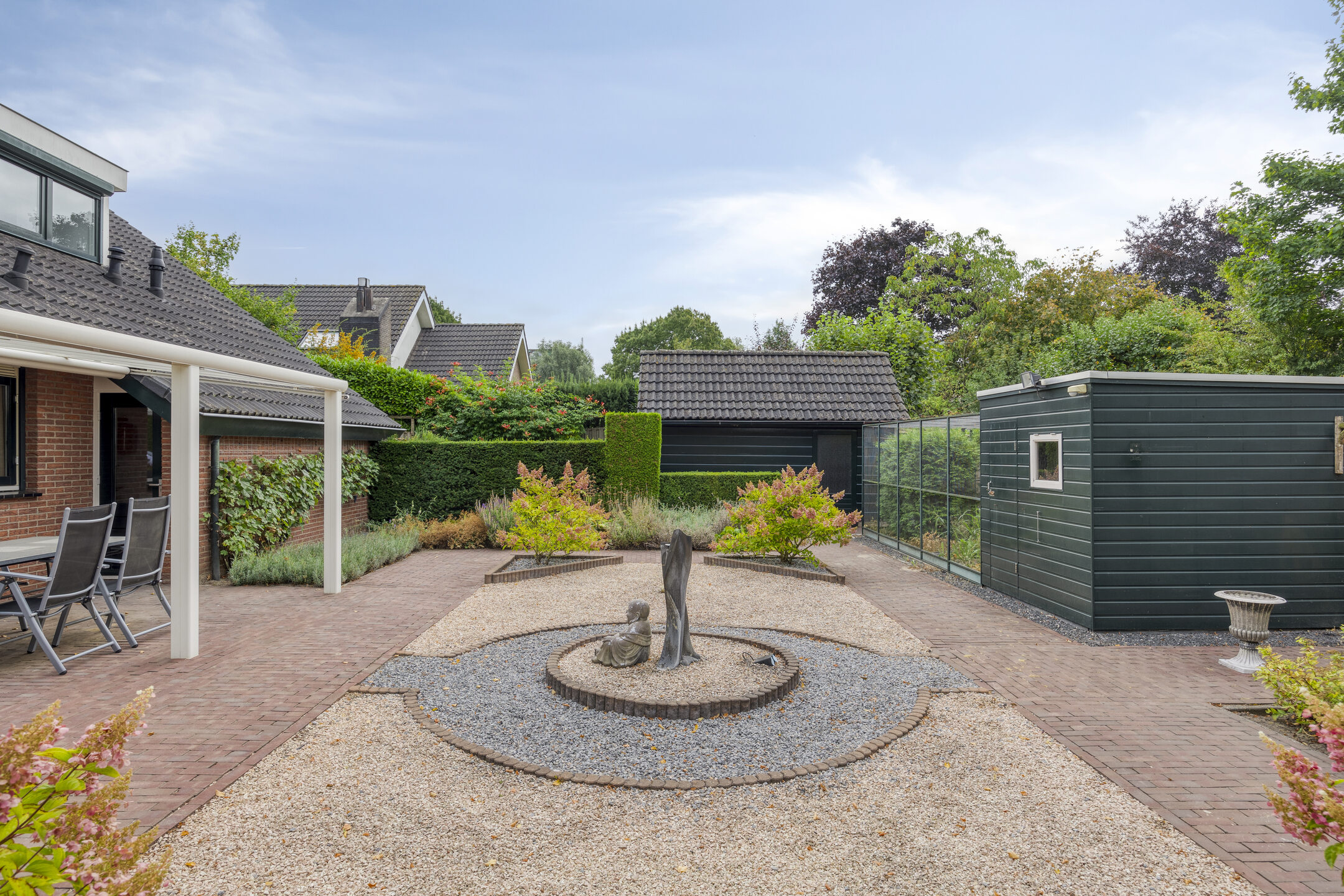 De woning beschikt over een mooie en verzorgde tuin rondom met o.a. een gezellig terras onder de overkapping tegen de achtergevel. Aan de voorzijde van de woning is parkkeerruimte op eigen terrein. Verder zijn er maar liefst 2 garages, 1 inpandig en 1 vrijstaande. Een volière en een houten berging.