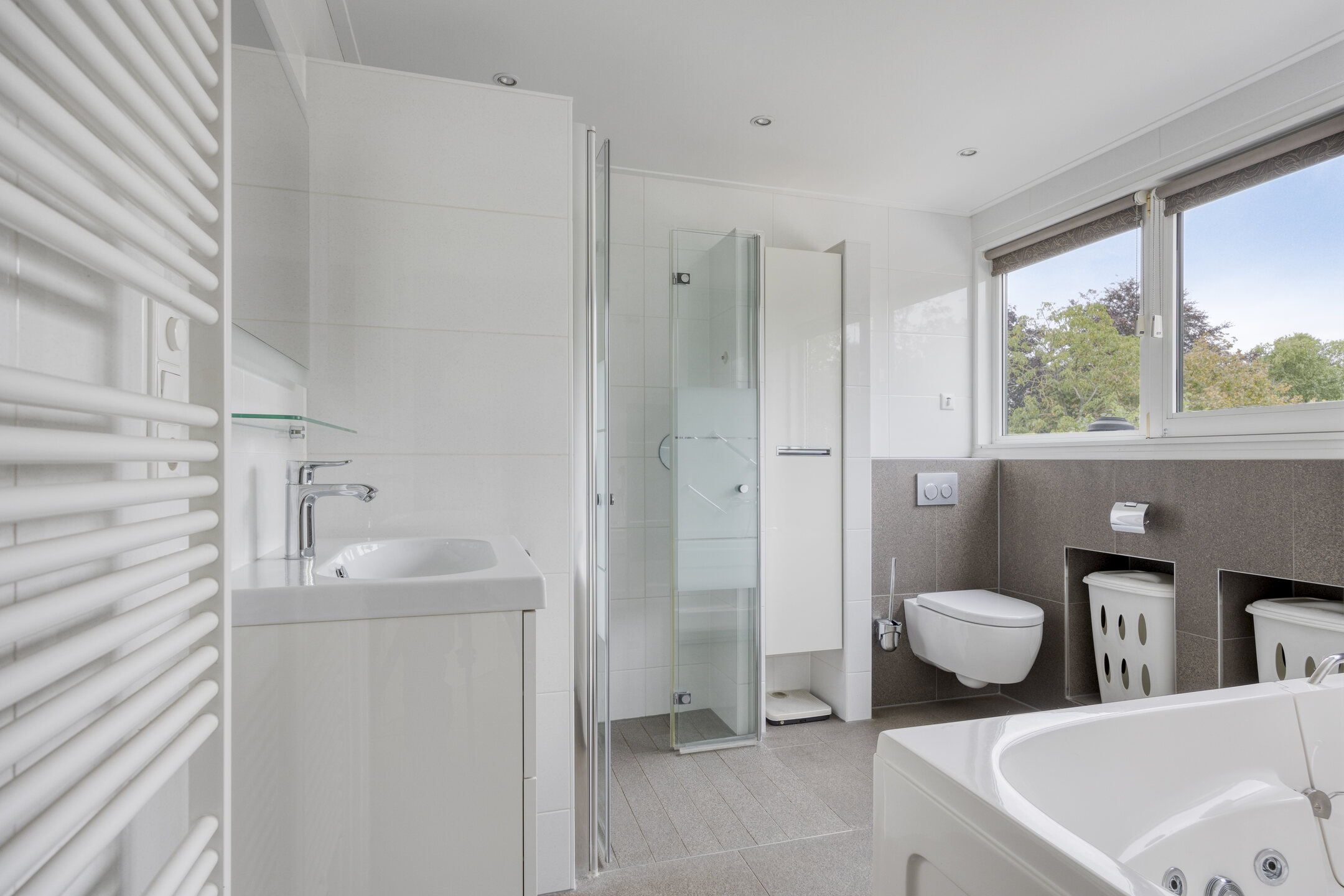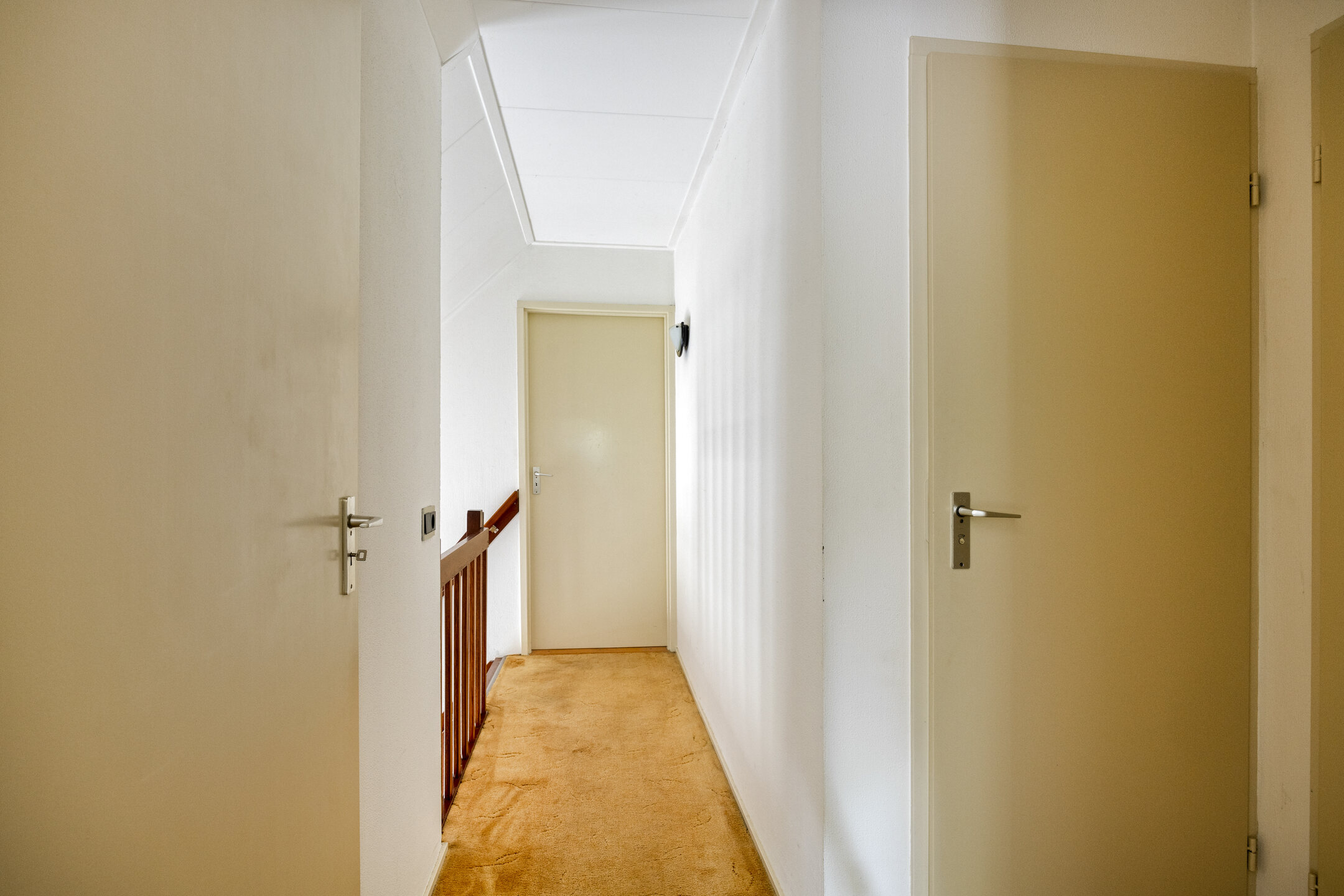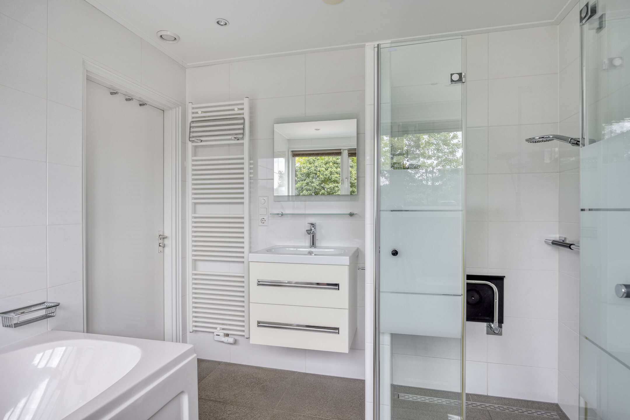 1e Verdieping: overloop met inbouwkast. Drie slaapkamers ter grootte van circa 7,5 m², 10 m² en 13 m², waarvan 1 voorzien is van een inbouwkast en kastenwand. De grootste slaapkamer is tevens voorzien van een wastafel. Nette badkamer met ligbad, wastafelmeubel, wandcloset en douchecabine.