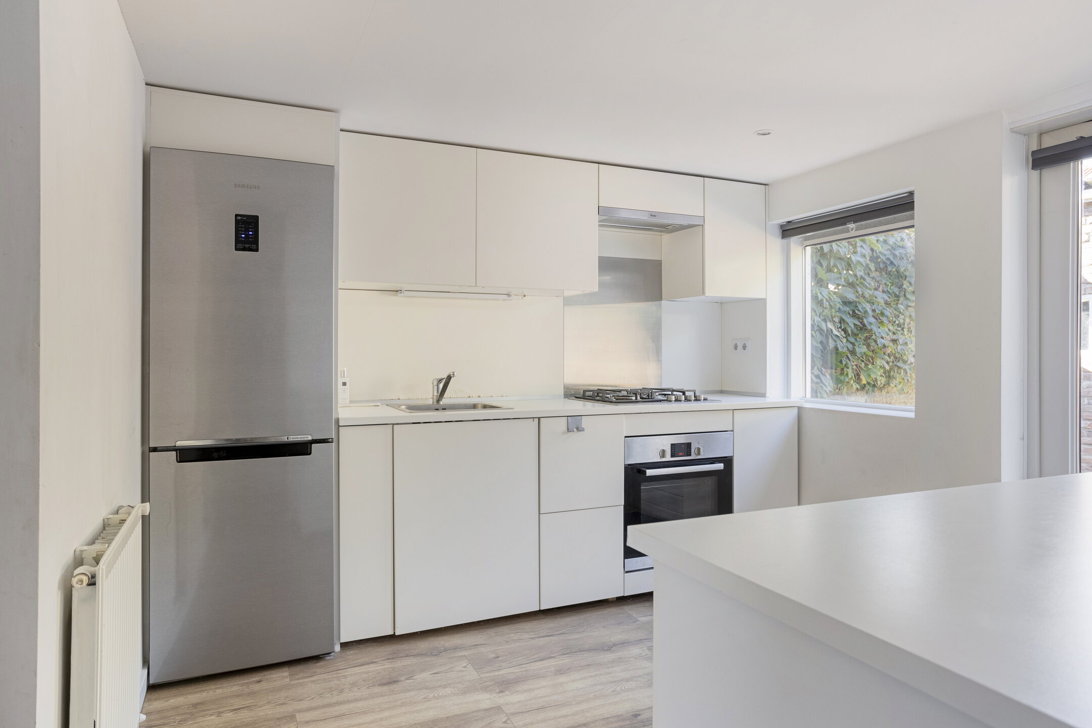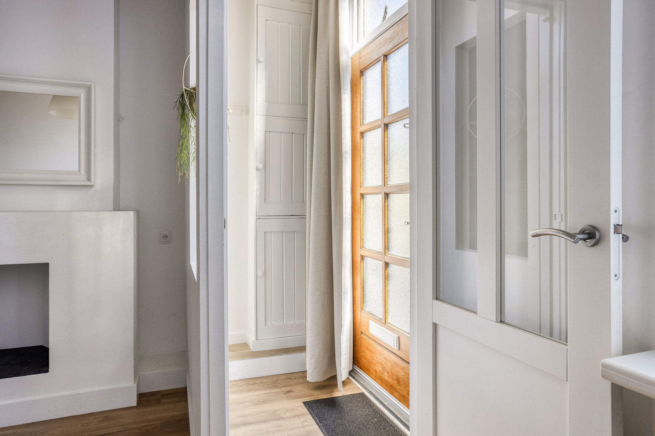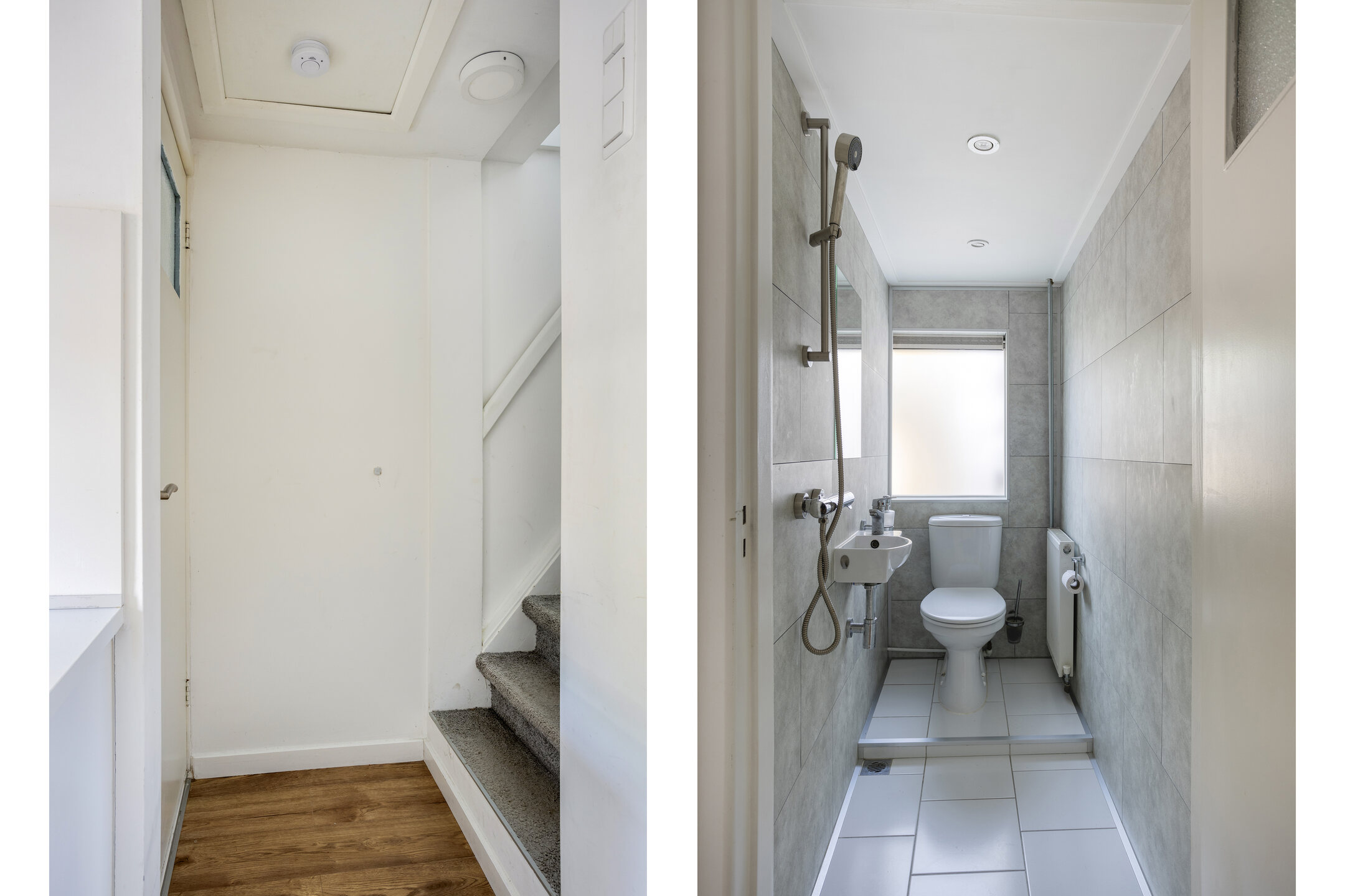 Begane grond: entree met meterkast. Keurig afwerkte woonkamer voorzien van schouw, trapkast en laminaatvloer, met zithoek aan de voorzijde en eethoek bij de keuken aan de achterzijde. Half open keuken met tuindeur, voorzien van 4-pits gaskookplaat, afzuigkap, oven, koelkast, vaatwasser en wasmachine. Toilet voorzien van wastafel en (extra) douche.